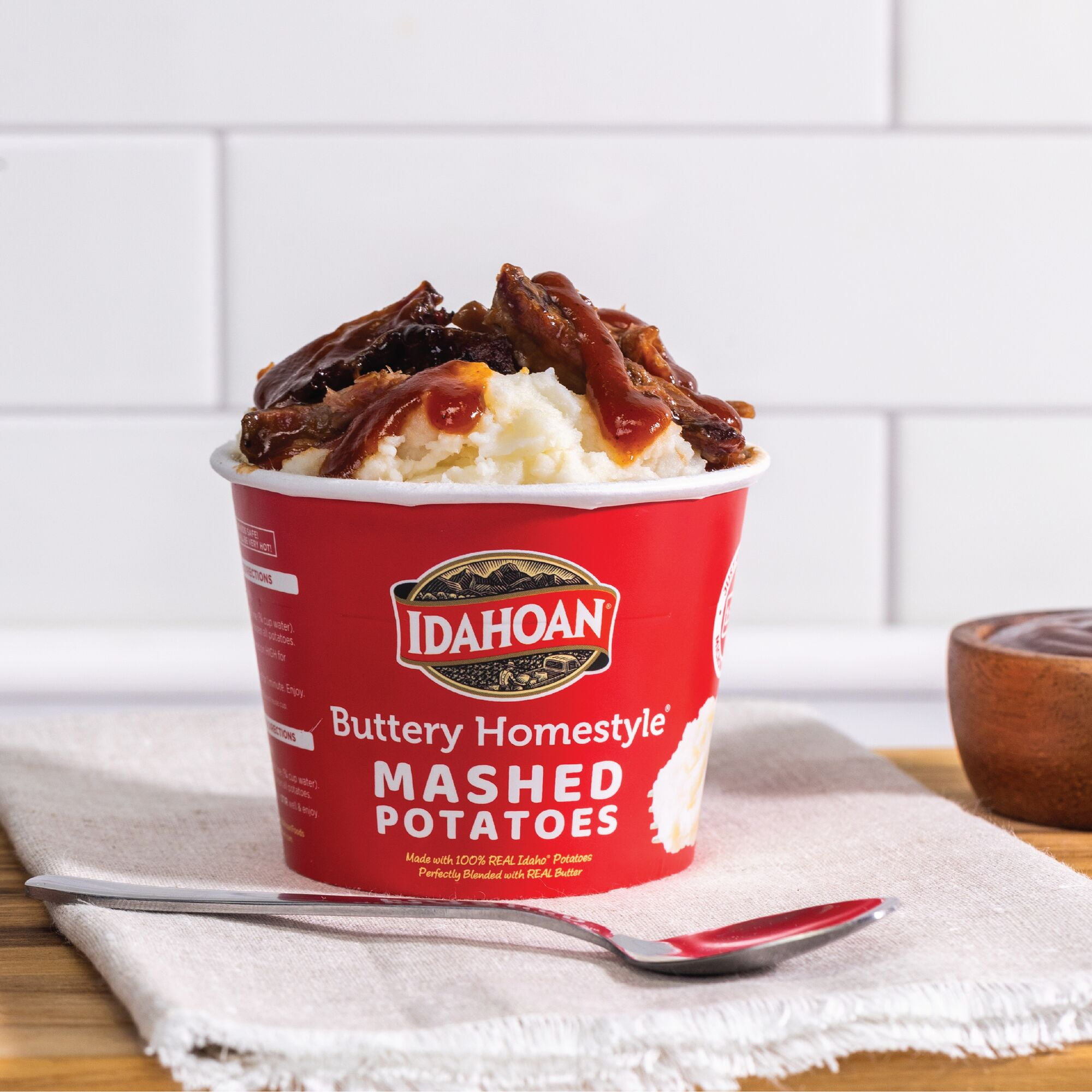 Idahoan Instant Buttery Homestyle Instant Potato cups. I have bought these often cooking for one. If I need more instant potatoes I select from a variety of this brands flavor 1pouches. When leftovers aren’t needed the cups are handy with a good taste. They’ll suit as a snack or with dinner and you can dress them up with a few toppings. I like mine best with just a bit more water added before microwaving.