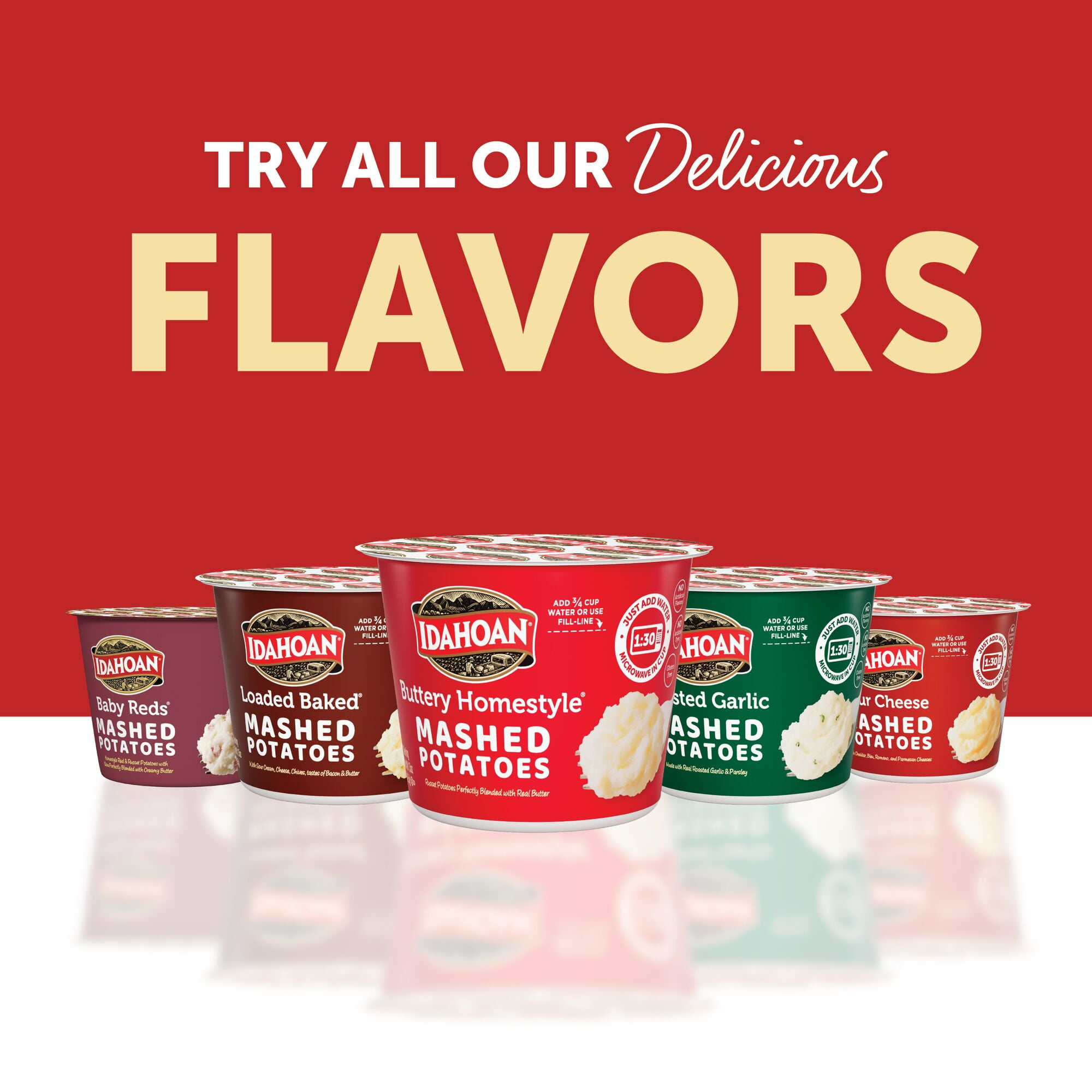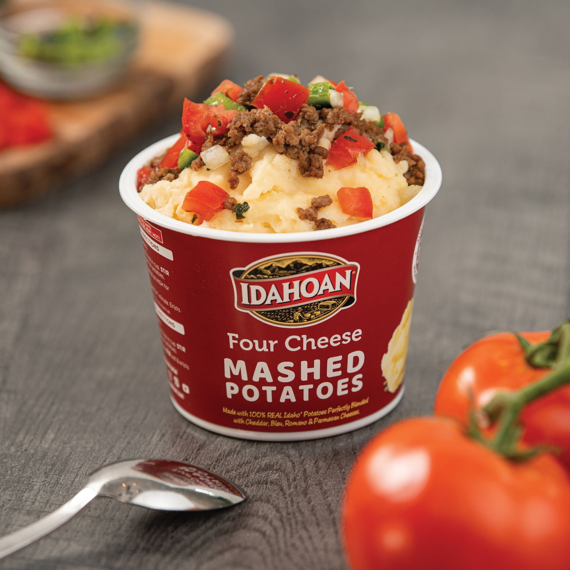 Whip up delicious, rich mashed potatoes in minutes with Idahoan® Four Cheese Mashed Potatoes! We’re sure you’ll find many great uses for Idahoan’s Four Cheese Mashed Potatoes Cup, from snacks to work-time lunch sides. The flavor of Idahoan’s best, now in an ultra-convenient pack. Our instant mashed potatoes are always made with 100% real Idaho® potatoes make for a classic favorite. Perfect for a variety of wholesome recipes, Idahoan Four Cheese Mashed Potatoes are easy to prepare and ready in minutes. Simply add cold water to fill-line in cup, stir, microwave for 1 1/2 minutes, and voilà! Each order includes 4 (1.5oz) cups. Whether you’re looking for traditional comfort food, or wanting a modern spin on classic dishes, Idahoan delivers Homemade Taste—Every Time.