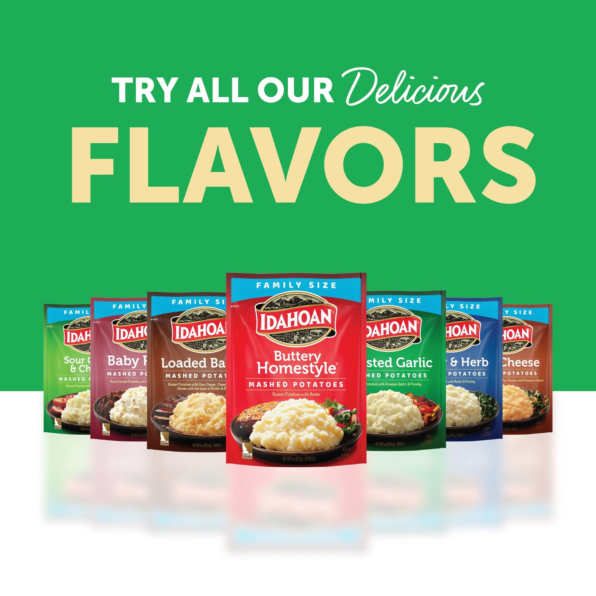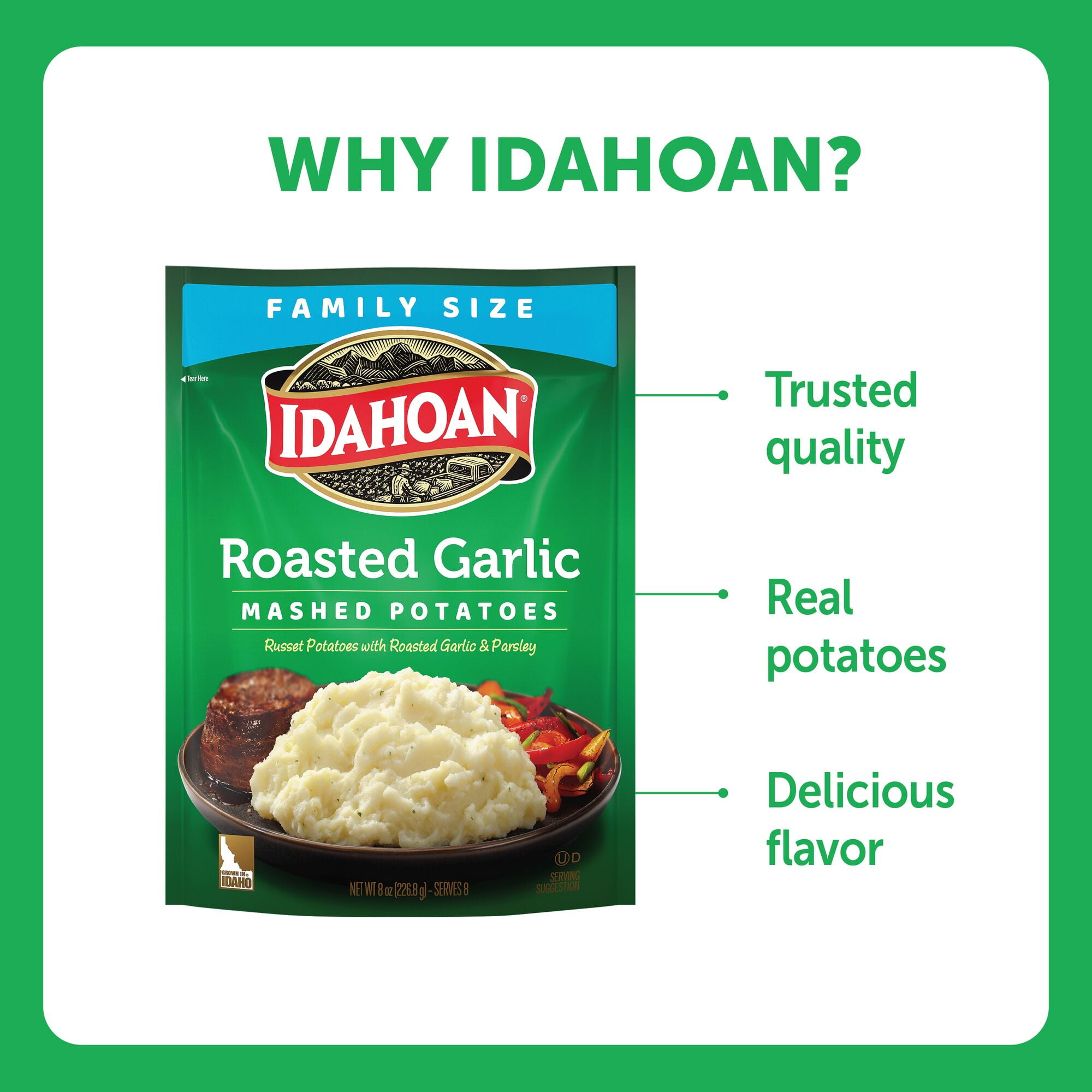Whip up delicious, rich mashed potatoes in minutes with Idahoan Roasted Garlic Mashed Potatoes! Our mashed potatoes are always made with 100% real Idaho potatoes. Perfect for a variety of wholesome recipes, Idahoan Roasted Garlic Mashed Potatoes are easy to prepare and ready in minutes. Simply heat water on stovetop or in a microwave, add the entire pouch of mashed potatoes, and voilà! Each 8oz pouch has eight (half cup) servings. Whether you’re looking for traditional comfort food, or wanting a modern spin on classic dishes, Idahoan delivers Homemade Taste—Every Time.