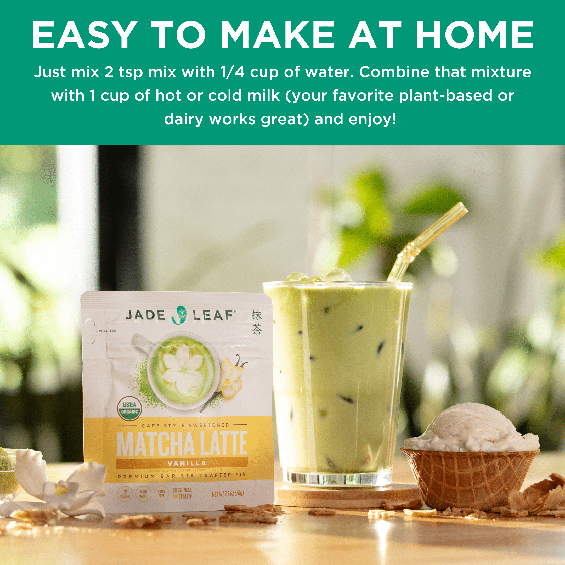 Make your own deliciously creamy vanilla matcha lattes at home using our Café Style Vanilla Matcha Latte Green Tea Powder Mix. Made from a unique fusion of matcha grades to elevate the flavor profile of café-inspired vanilla lattes within the comfort of your own home. Just mix one scoop of vanilla matcha latte powder with 1/4 cup of water. Combine that mixture with one cup of hot or cold milk (your favorite plant-based or dairy works great) and enjoy! It’s organic, vegan, gluten-free, gmo-free…and absolutely delicious.