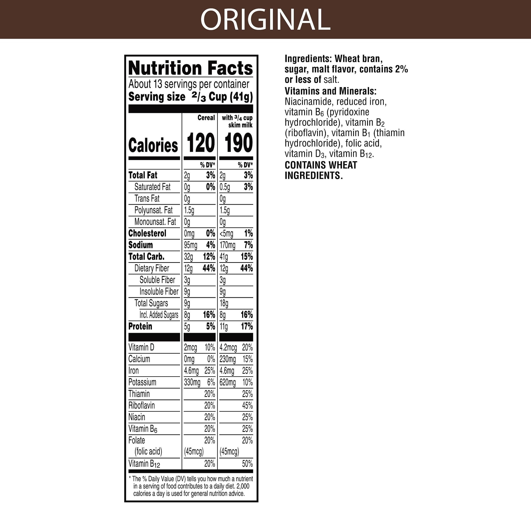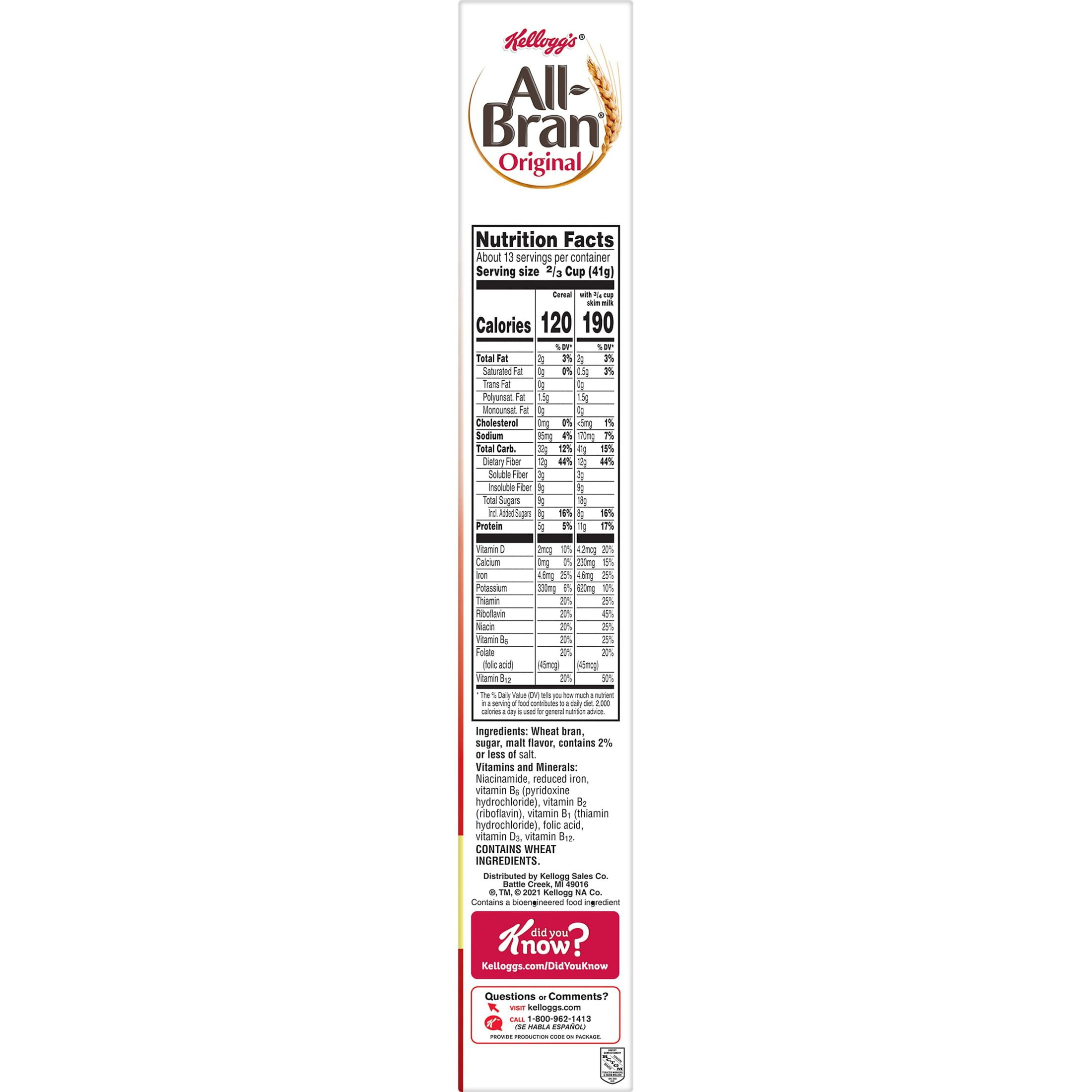 Greet your morning with Kellogg’s All-Bran, a delicious, low-fat breakfast cereal made with simple, wholesome ingredients. A healthy, family-favorite cereal, Kellogg’s All-Bran Original is made to enjoy by the bowlful. Each serving provides a good source of 8 vitamins and minerals, is an excellent source of fiber and contains no artificial colors or flavors. A travel-ready food, Kellogg’s All-Bran is an ideal companion for lunchboxes, after-school snacks, and busy, on-the-go moments. Just add your favorite dairy or nut-milk or enjoy as a crispy treat straight from the box. Kellogg’s All-Bran, the goodness of a simple grain.