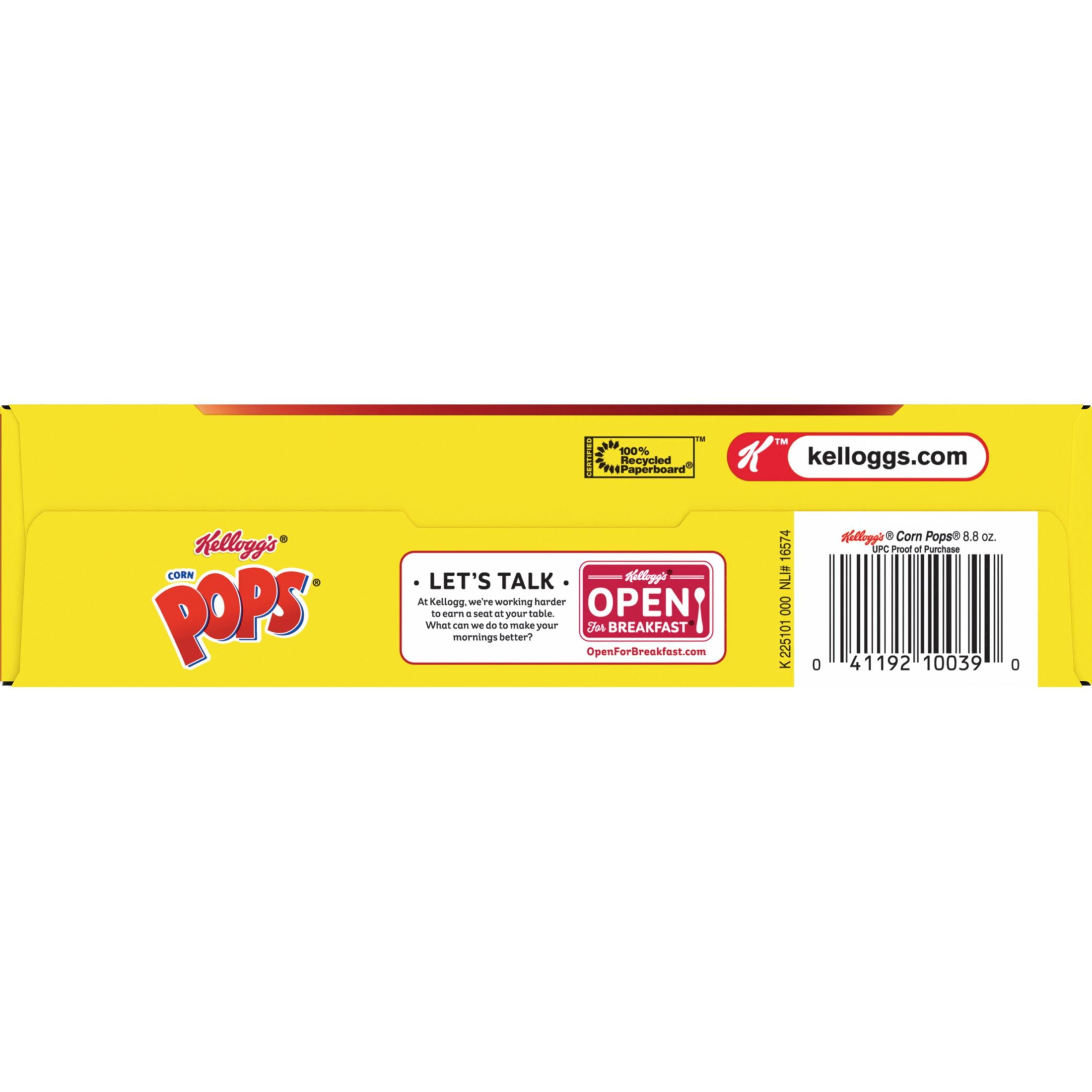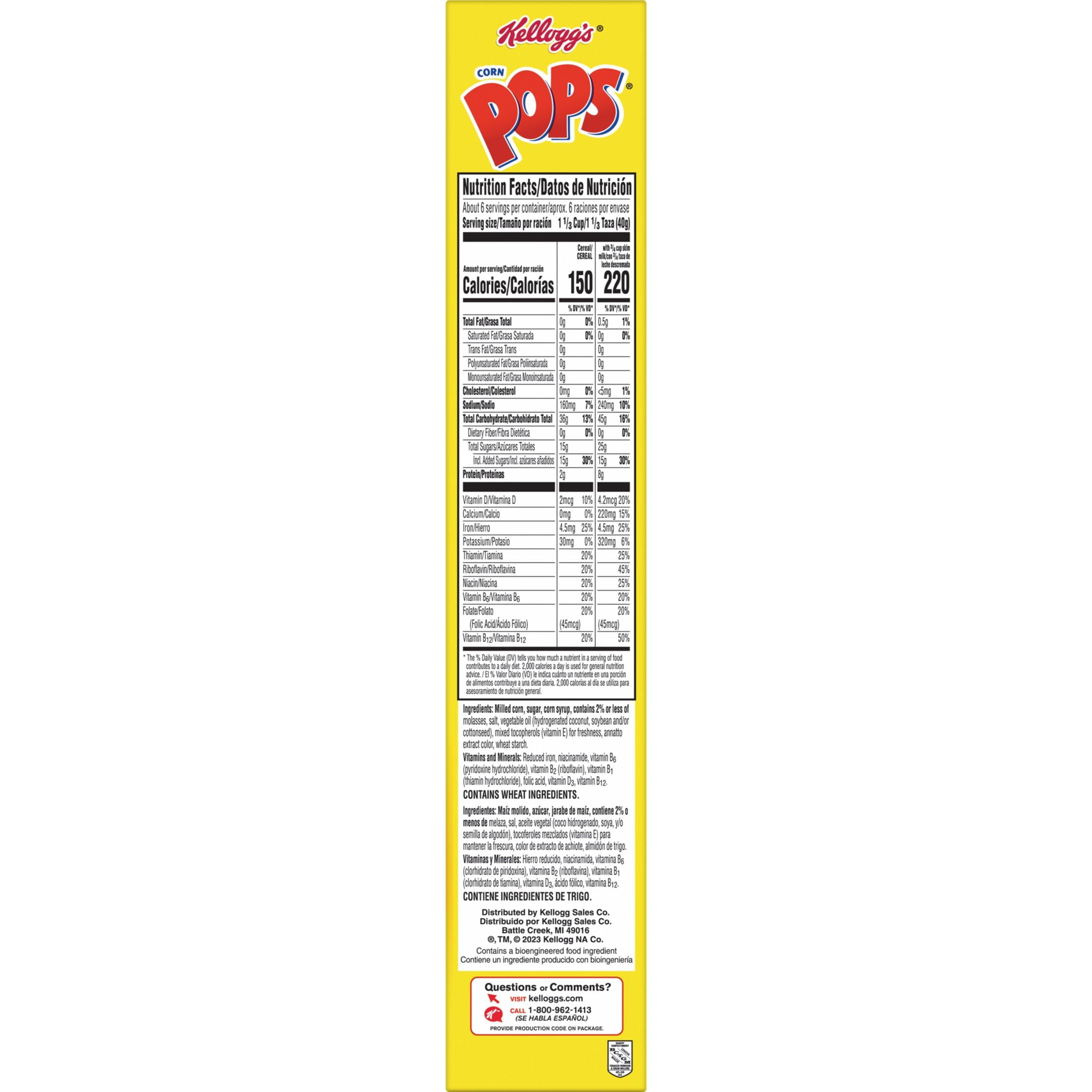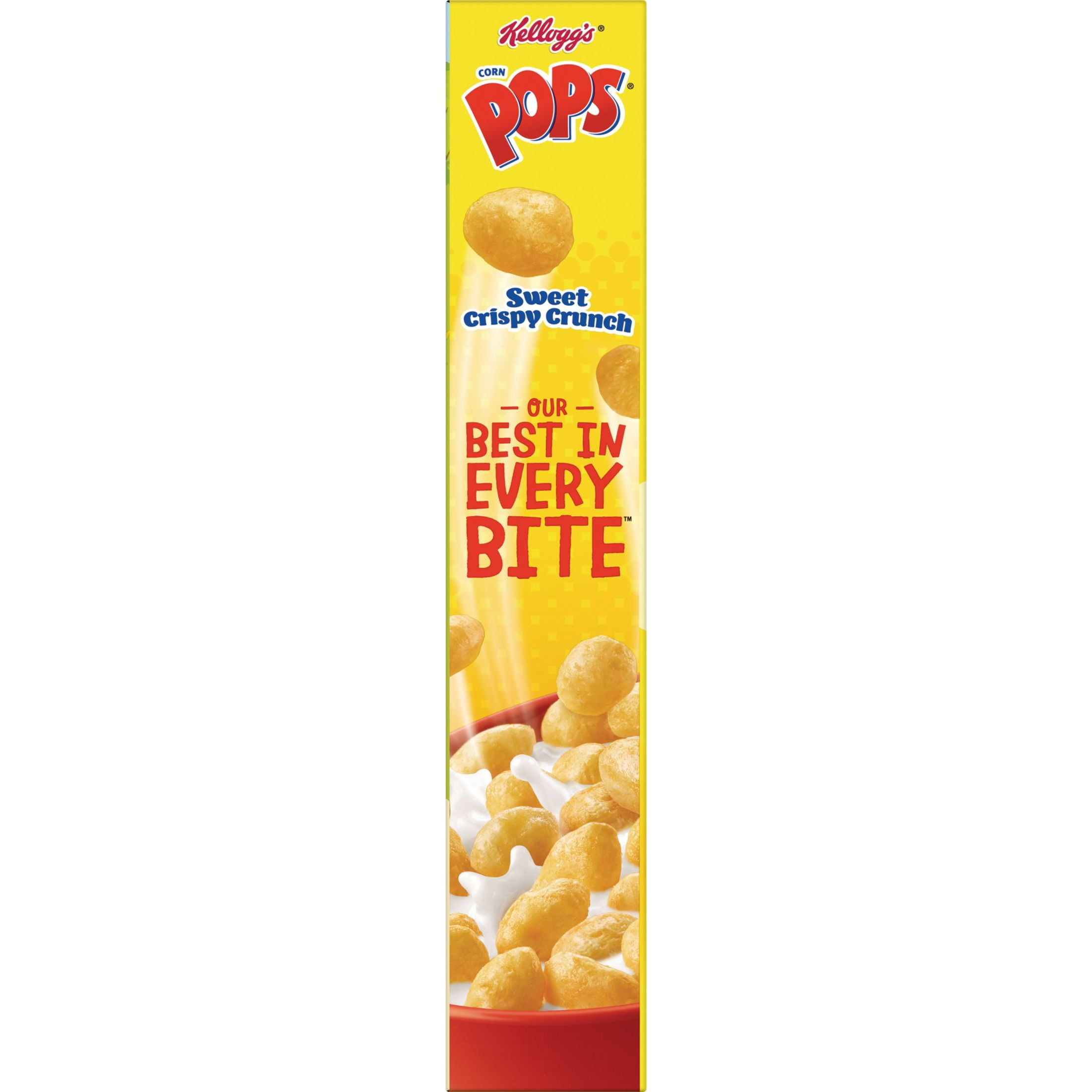 Wake up to sweet, crispy Kellogg’s Corn Pops. Every irresistible bowl delivers the consistently crunchy, sweetened popped-up corn experience that’s been serving up smiles for years. Corn Pops cereal provides a good source of 8 vitamins and minerals and is made with colors and flavors from natural sources. We’re proud to say corn is the first ingredient. Corn Pops are fun to eat for the family as a quick breakfast; Serve them in a bowl with milk or your favorite dairy alternative and indulge in a late-night bowlful of sweet, crunchy cereal and finish off with sweet cereal milk. Stash in a small bag for a school snack or in a lunch box as a portable treat. Pour them into a snack bowl for family, game or TV time. Pack a box when you travel or run errands. The delicious sweet, crispy crunch makes Corn Pops cereal a tasty pick-me-up at home or on the move. Any time, any place, “Gotta have my Pops!”