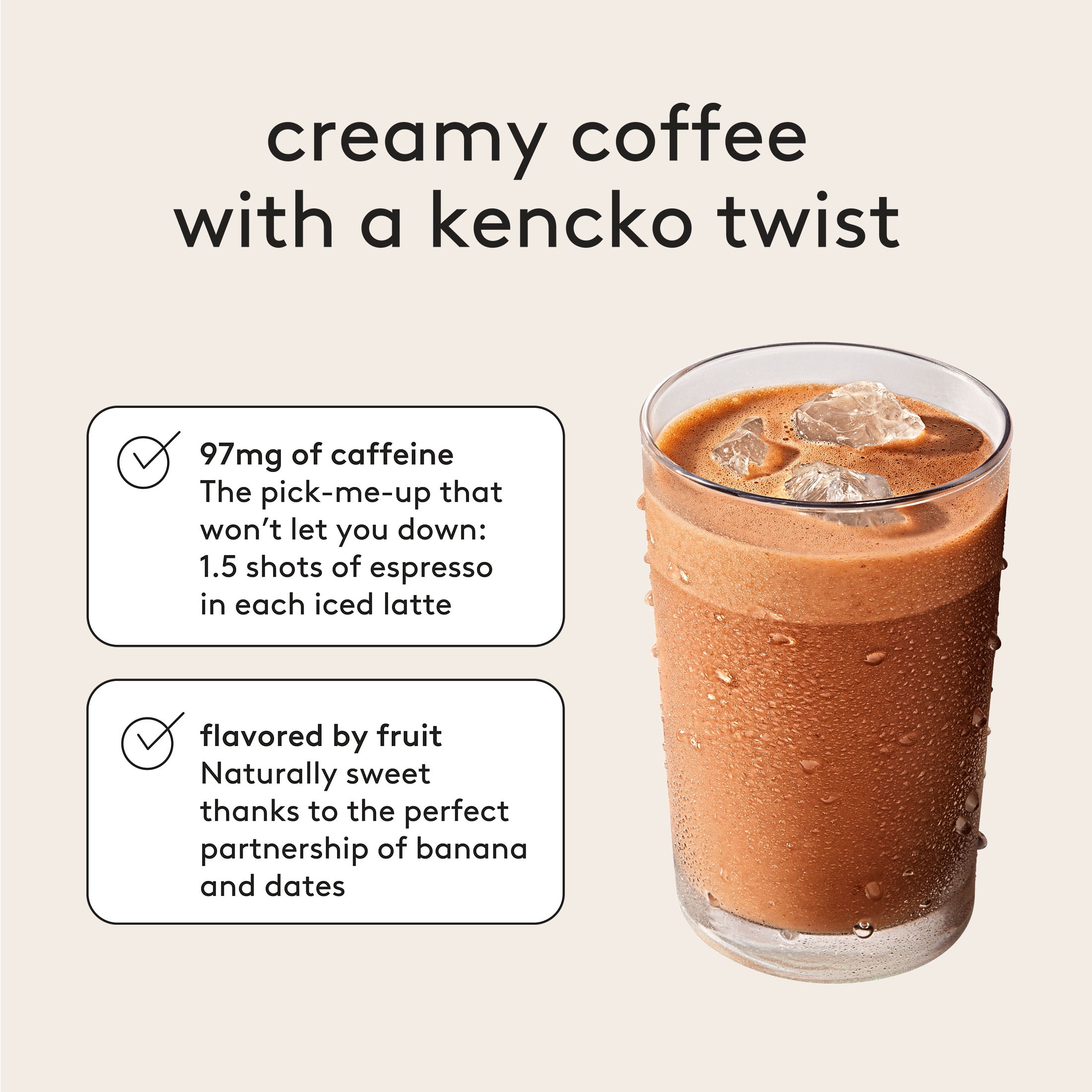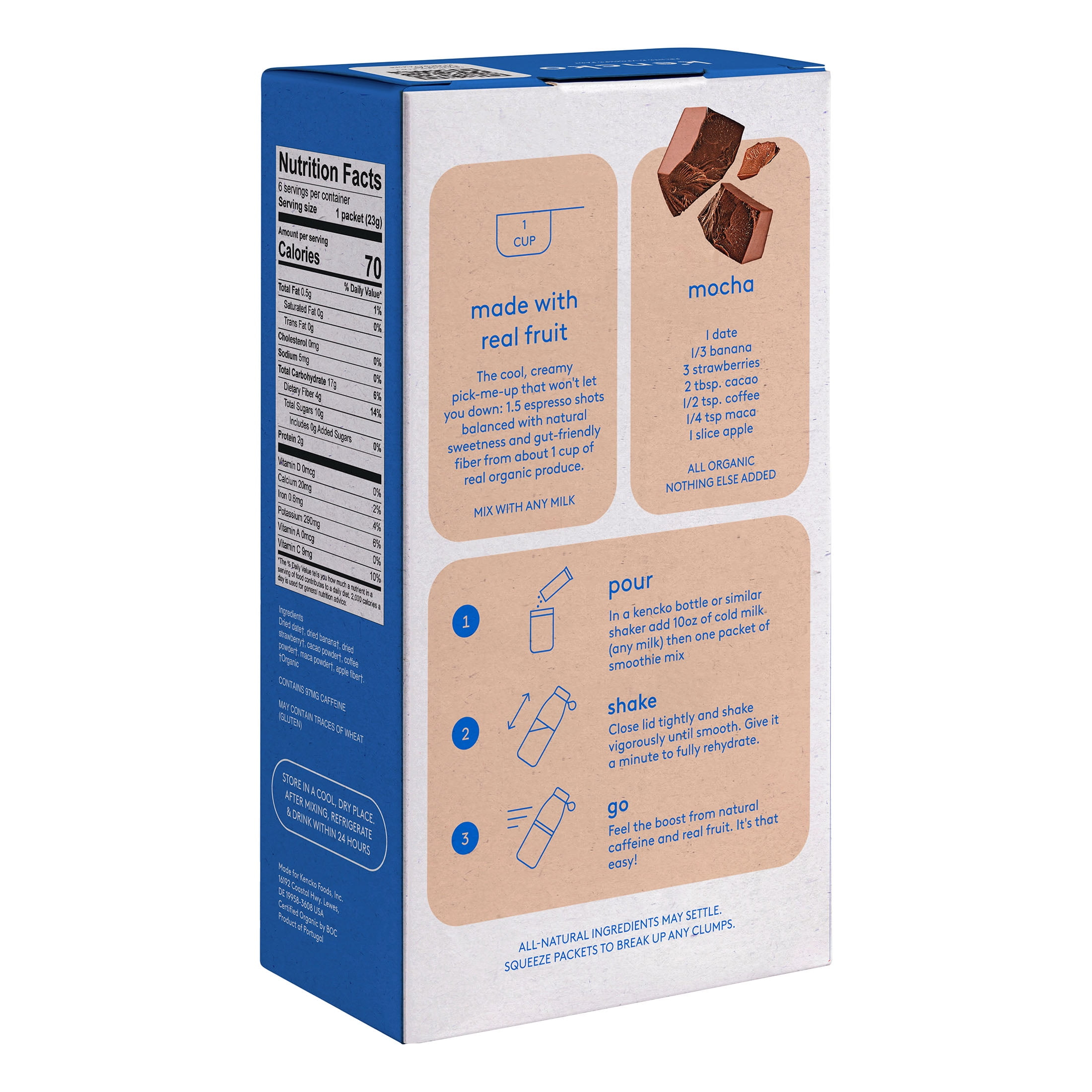 Who says chocolate isn’t a breakfast food? Not us. We blend organic cacao with dates and coffee to recreate your favorite indulgent mocha latte, minus the refined sugar. Just a delicious jump start to your day that gets all its flavor and kick from organic plants. We’ve packed 1.5 espresso shots and 4g of gut-friendly fiber from 1 cup of organic fruit into each tasty, convenient, and invigorating Kencko Mocha Instant Iced Latte. And they can be prepared in seconds. Eating more fruits and veggies has never been more convenient!
