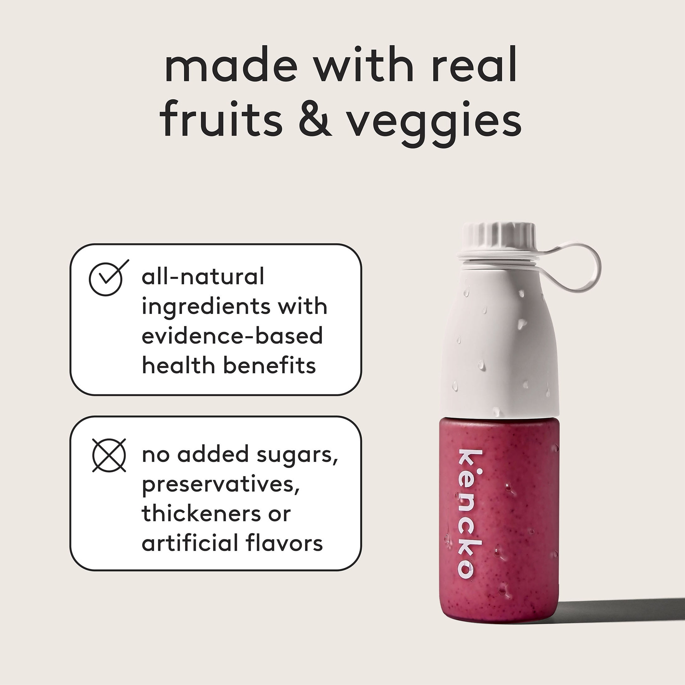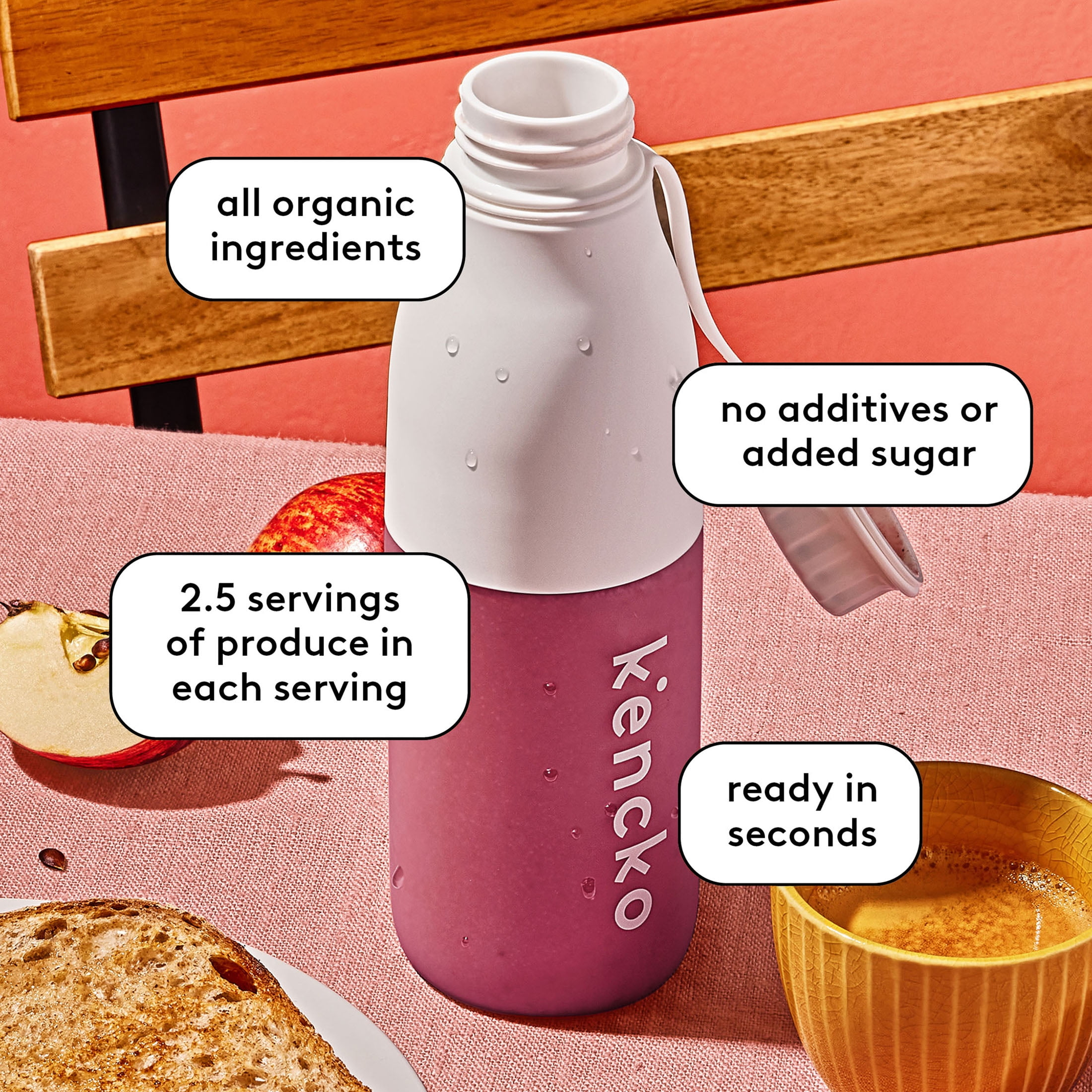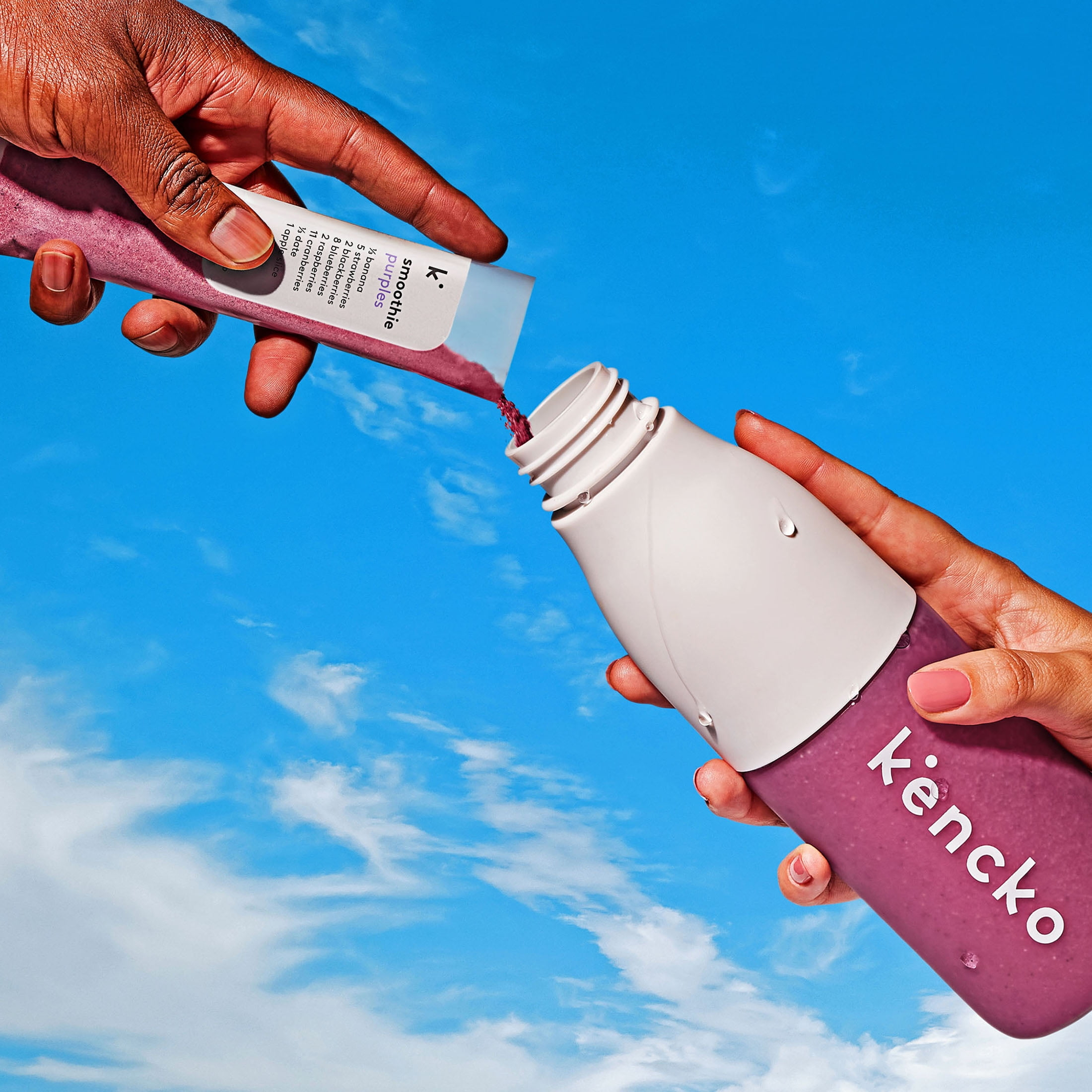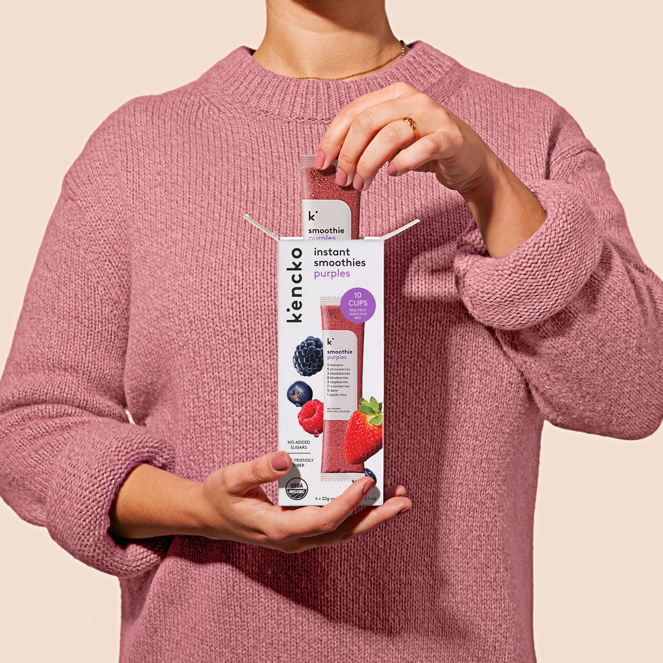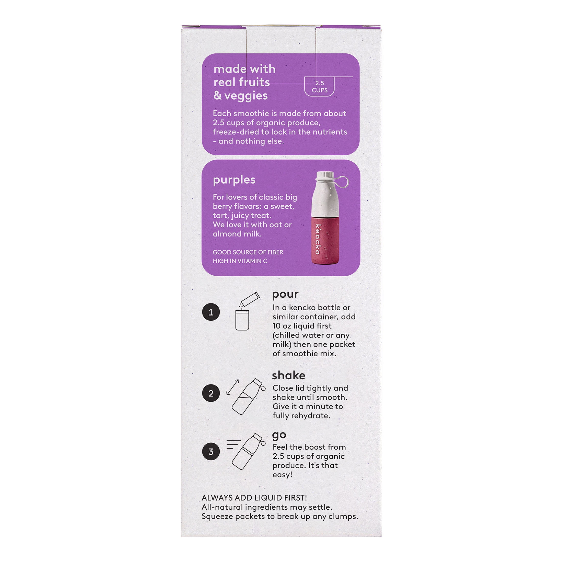 Kencko Purples is one berry nice smoothie. Refreshingly sweet and balanced with a touch of tartness, Purples is a good source of fiber and vitamin C. Loaded with banana, strawberry, blackberry, blueberry, date, raspberry, cranberry, and apple, each Purples instant smoothie tastes great and can be prepared in seconds. And since every Kencko smoothie provides you with 2.5 servings of organic produce, drinking one puts you halfway to reaching your five recommended servings of fruits and veggies a day. Just add water or your favorite milk, shake, blend, or stir, let sit for a moment, and enjoy. Toss ‘em in your backpack, your kids’ lunchbox, your gym bag, or even your back pocket. Eating more fruits and veggies has never been more convenient.