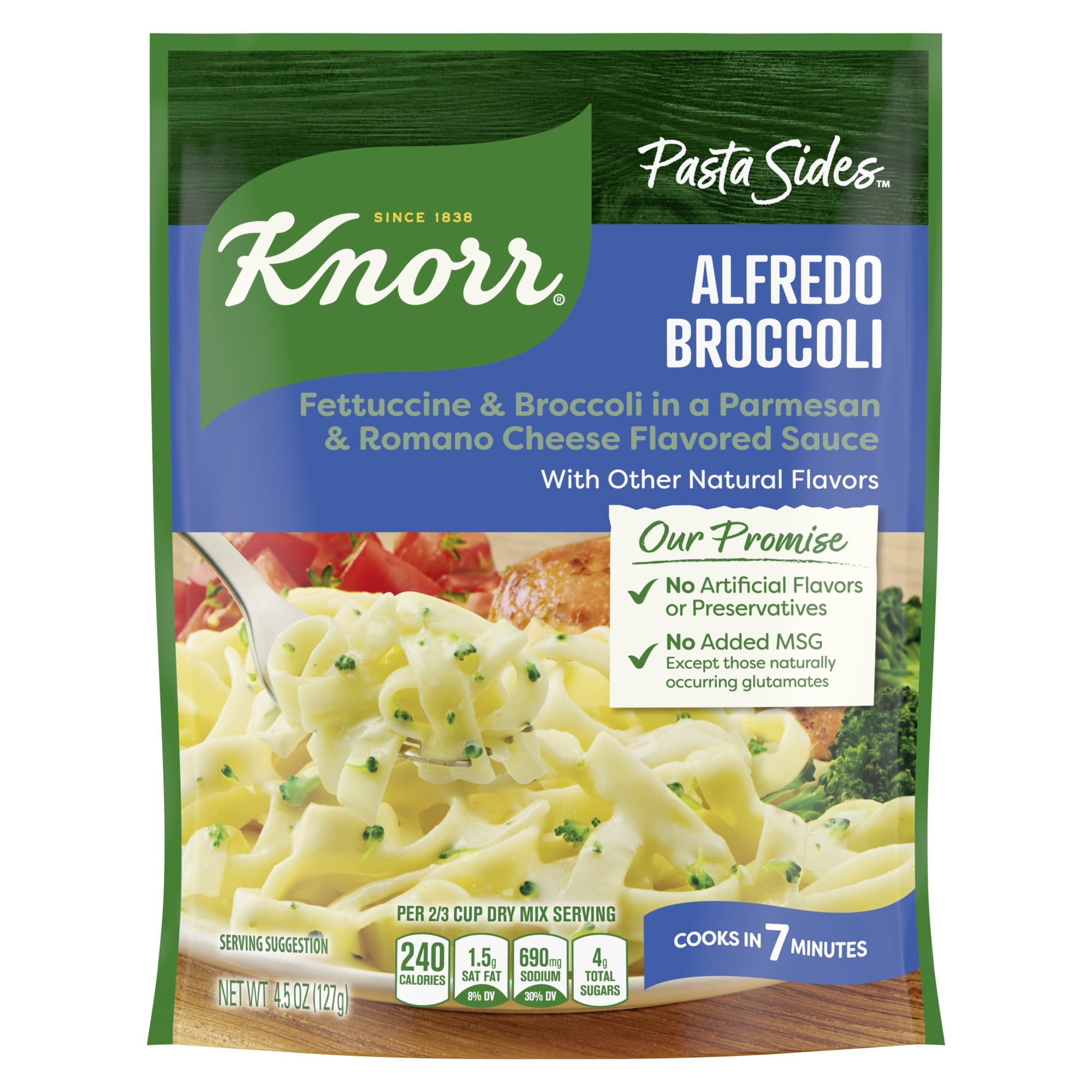 Knorr No Artificial Flavors Alfredo Broccoli Fettuccine Pasta Sides, 7 Minute Cook Time, Treat your taste buds with Knorr Pasta Sides Alfredo Broccoli Fettuccine (Shelf-Stable). Our pasta side dish expertly combines Parmesan and Romano cheese-flavored sauce with broccoli florets. Our deliciously seasoned pasta side dishes are great as part of a delicious main dish or as a standalone side dish. Make Knorr Pasta Sides the foundation of a crowd-pleasing dinner. Your family is sure to love the Parmesan and Romano cheese-flavored sauce of Knorr Pasta Sides Alfredo Broccoli. On top of tasting delicious, our Alfredo Broccoli Pasta is quick and easy to prepare. Knorr easy pasta dishes cook in just 7 minutes on the stovetop or in the microwave. Knorr Pasta Sides have no artificial flavors, no preservatives, and no added MSG, except those naturally occurring glutamates, making it an excellent choice for creating a family-favorite meal. Use Knorr Sides to create a mouth-watering main dish. Simply prepare Knorr Pasta Sides and add your favorite meat and vegetables to make a dinner your family is sure to love.