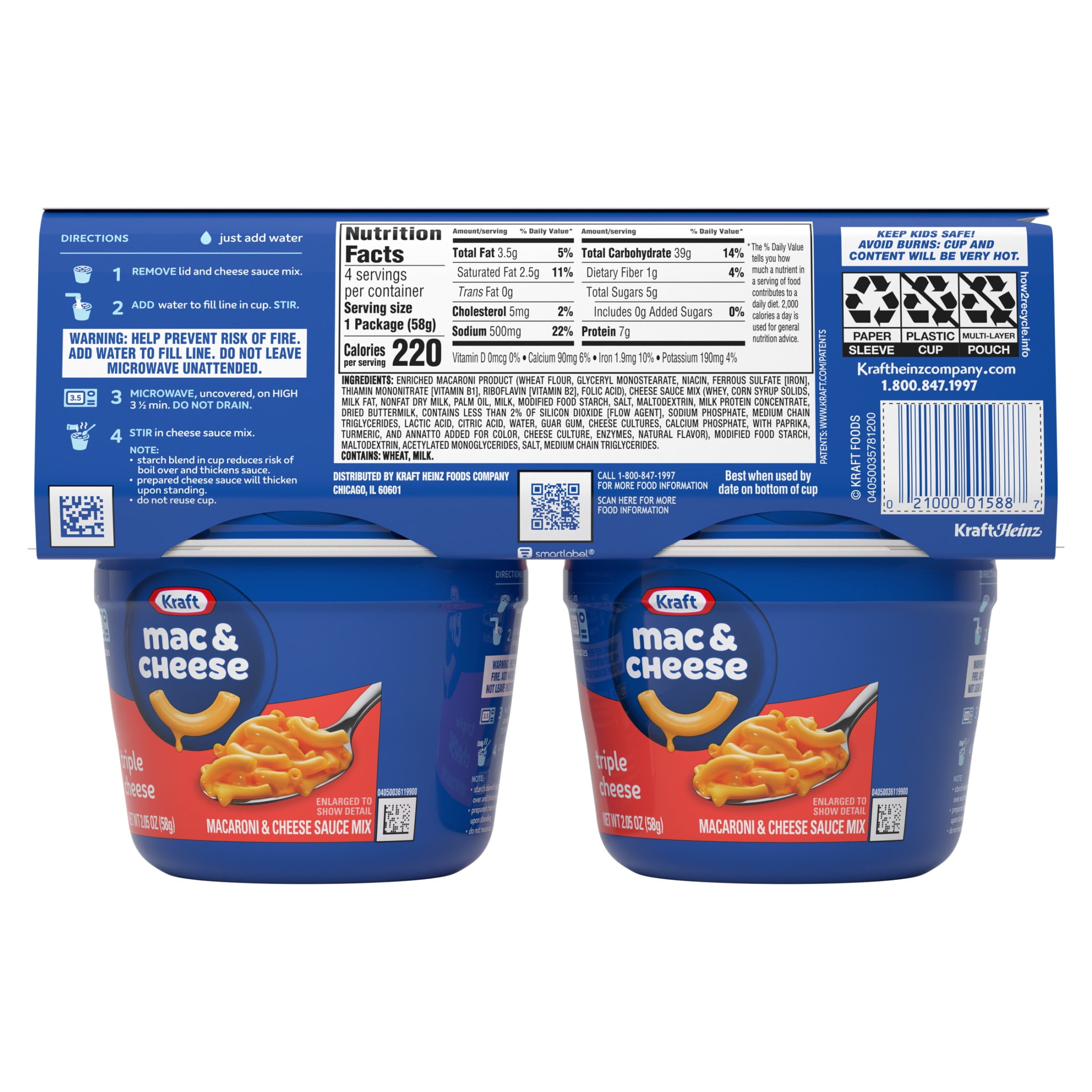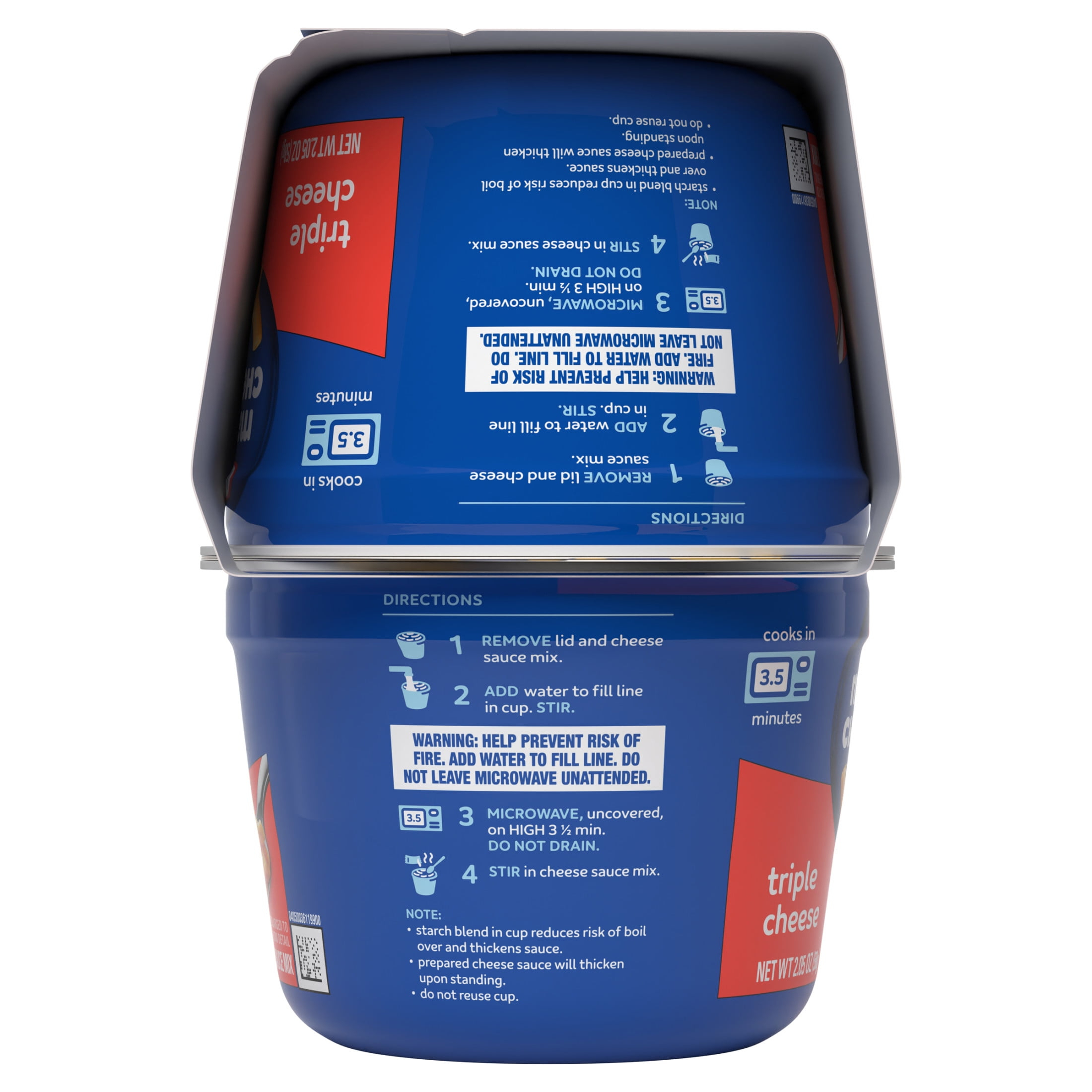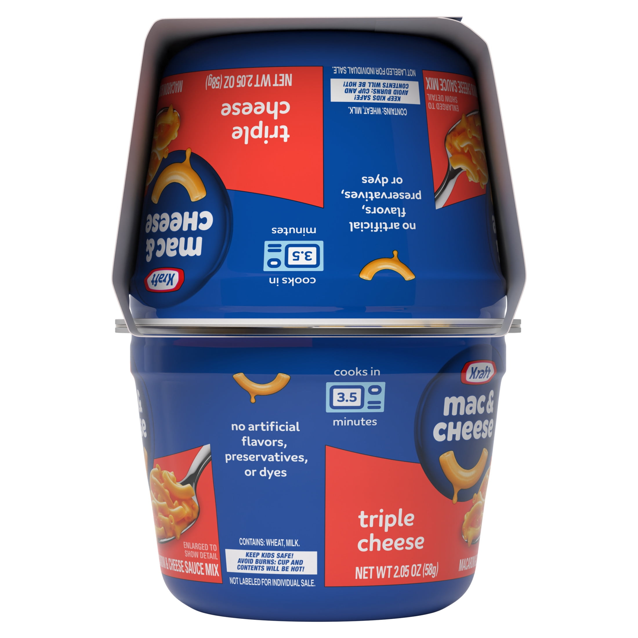- Each macaroni and cheese cup includes macaroni pasta and triple cheese sauce mix