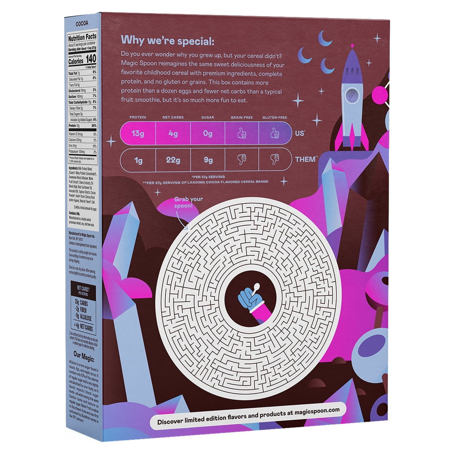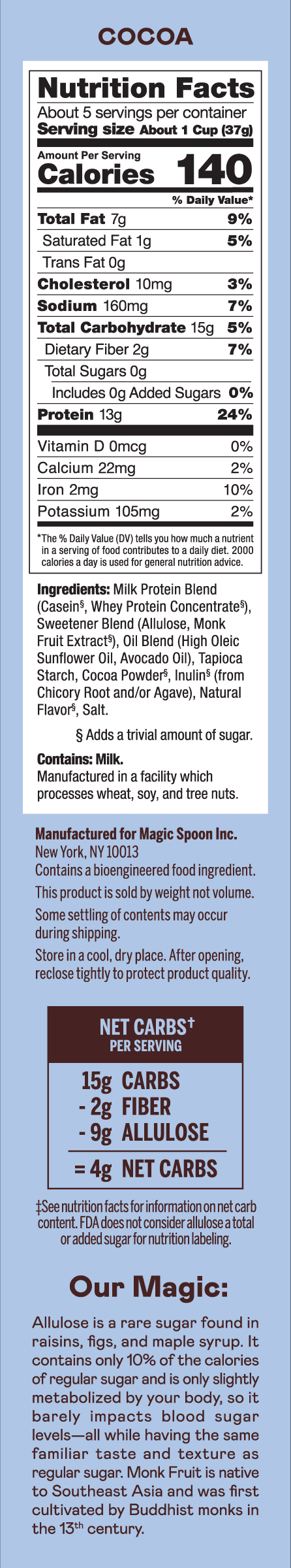 Remember the carefree days of childhood, when you didn’t feel guilty about eating mountains of cereal with questionable nutrition? Well, now you can have your cereal and eat it too. Magic Spoon Cocoa Grain-Free Cereal reimagines breakfast, so you don’t have to choose between healthy and deliciously sweet. Magic Spoon Cocoa Cereal is made with real cocoa and tastes like rich, dark chocolate cake – except healthier! We’ve reimagined your favorite chocolate-flavored cereal with only 4g net carbs, 13g complete protein, 140 calories, and nothing artificial. Magic Spoon offers a protein-rich and low-carb breakfast cereal entirely free of sugar. Each Magic Spoon Cereal is made with a milk protein blend, tapioca starch, chicory root fiber, and natural flavors. Our sweet little secret: We use a natural blend of monk fruit and allulose, a rare sugar found in things like figs and maple syrup with almost zero glycemic impact and almost zero calories. Magic Spoon Cereal is grain-free, gluten-free, wheat-free, rice-free, and soy-free, ensuring a breakfast of champions that tastes too good to be true.