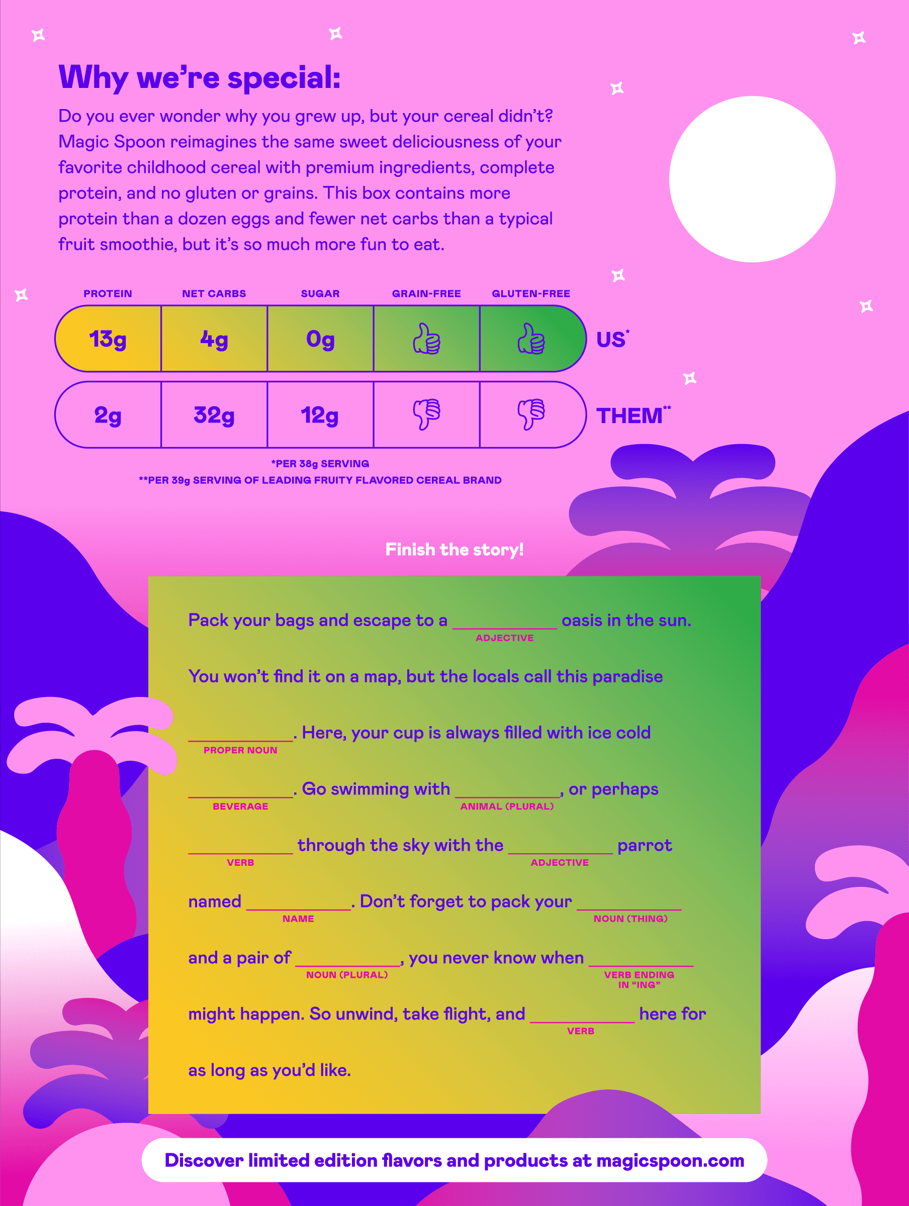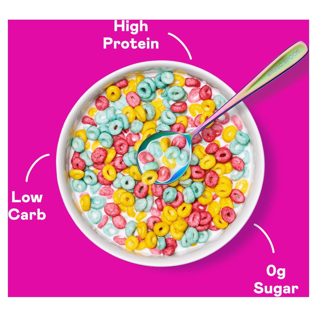 Remember the carefree days of childhood, when you didn’t feel guilty about eating mountains of cereal with questionable nutrition? Well, now you can have your cereal and eat it too. Magic Spoon Fruity Grain-Free Cereal reimagines breakfast, so you don’t have to choose between healthy and deliciously sweet. Magic Spoon Fruity Cereal combines fruity flavors for a cereal that tastes like dessert – except healthier! We’ve reimagined your favorite fruit-forward cereal with only 5g net carbs, 13g complete protein, 150 calories, and nothing artificial. Magic Spoon offers a protein-rich and low-carb breakfast cereal entirely free of sugar. Each Magic Spoon Cereal is made with a milk protein blend, tapioca starch, chicory root fiber, and natural flavors. Our sweet little secret: We use a natural blend of monk fruit and allulose, a rare sugar found in things like figs and maple syrup with almost zero glycemic impact and almost zero calories. Magic Spoon Cereal is grain-free, gluten-free, wheat-free, rice-free, and soy-free, ensuring a breakfast of champions that tastes too good to be true.