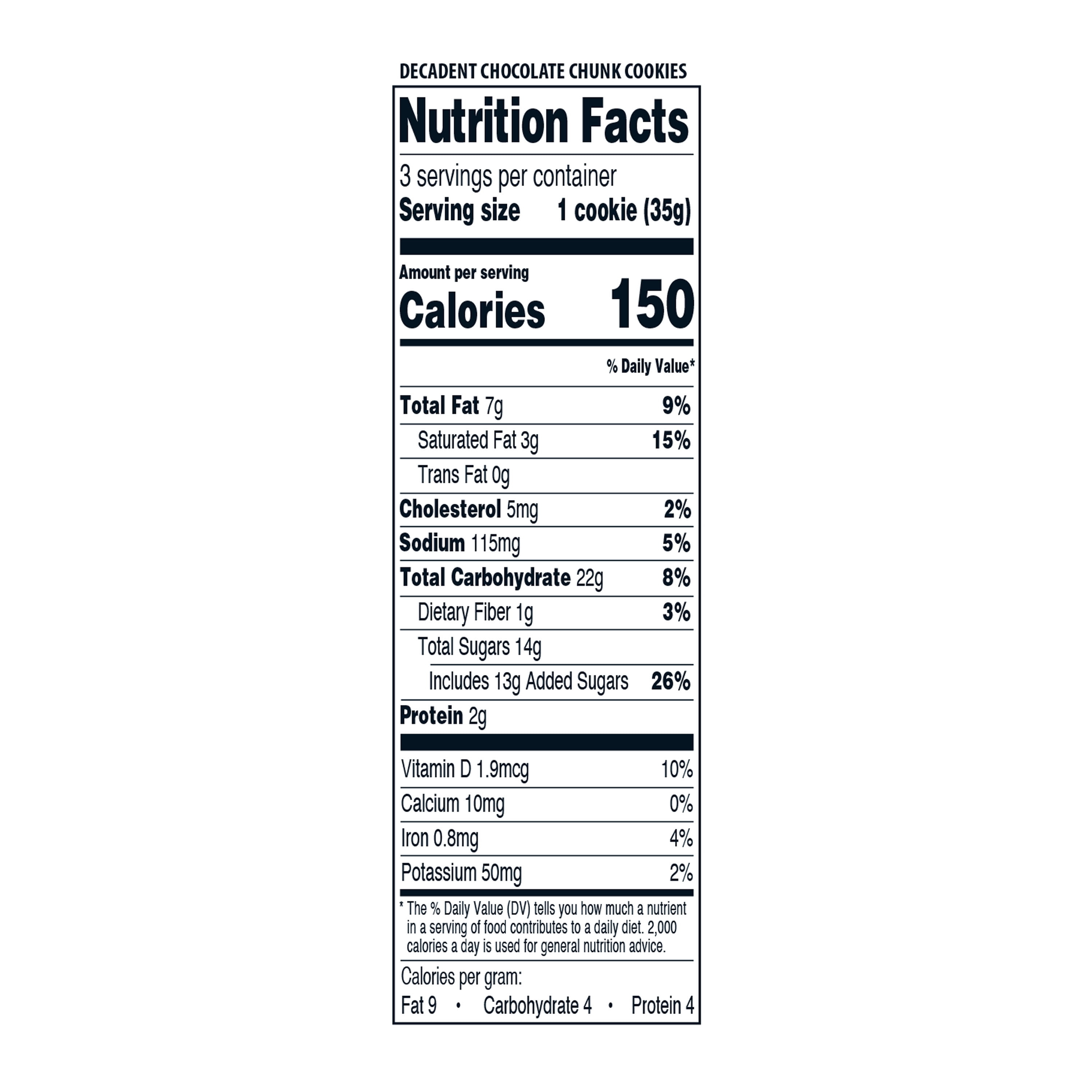 Marketside Decadent Chocolate Chunk Cookies are a great any-time dessert that quickly satisfies your sweet-tooth craving. These soft, chewy cookies are baked with giant semi-sweet chocolate chunks for a pop of chocolate flavor in every bite. Pair with a glass of milk or vanilla ice cream for an extra sweet treat. Bring home the moist, scrumptious Marketside Decadent Chocolate Chunk Cookies for everyone to enjoy today!