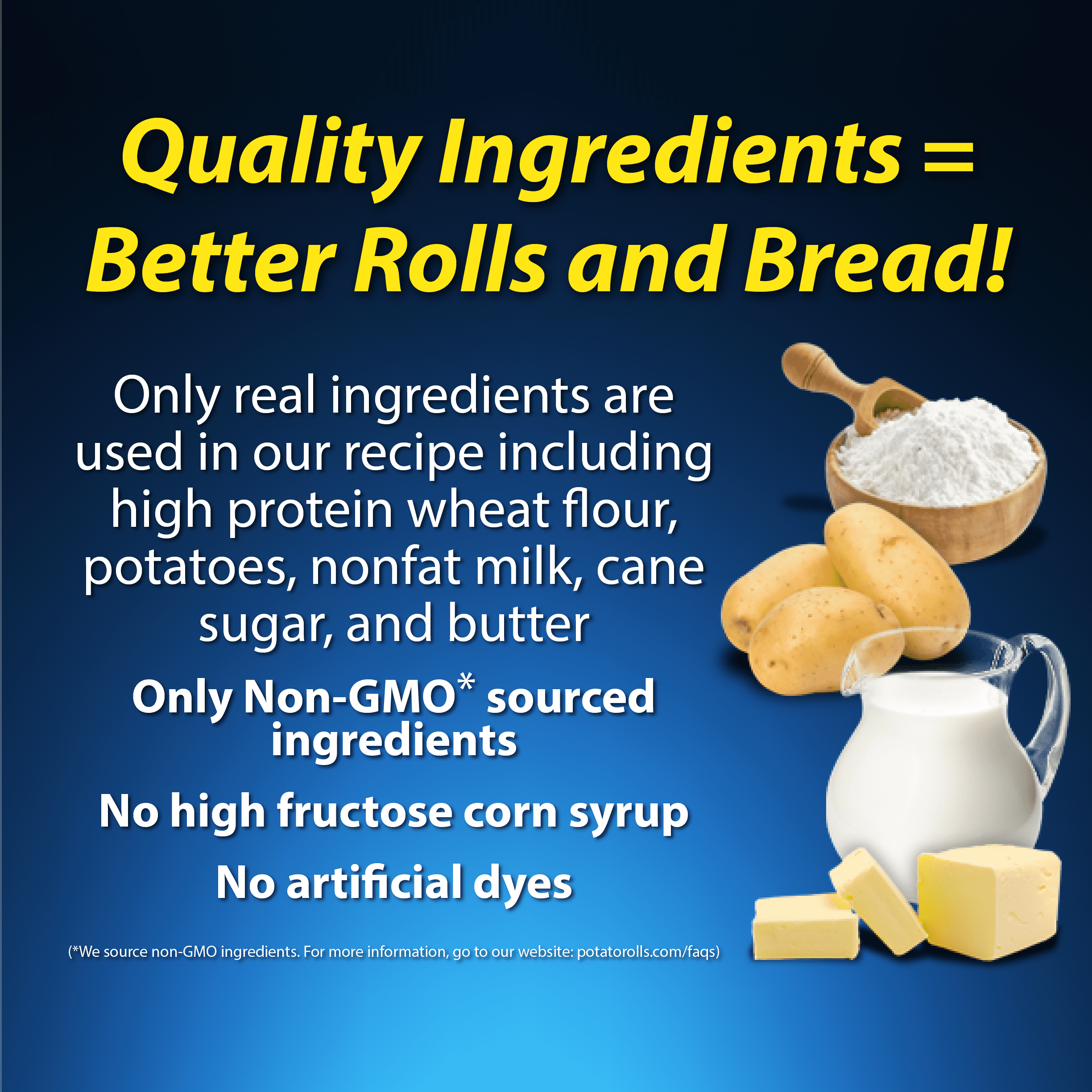 - Made with high quality ingredients such as high protein wheat flour, nonfat milk, real cane sugar, yeast, sesame seeds and real butter. Better ingredients make better bread and rolls! Learn more at www.potatorolls.com