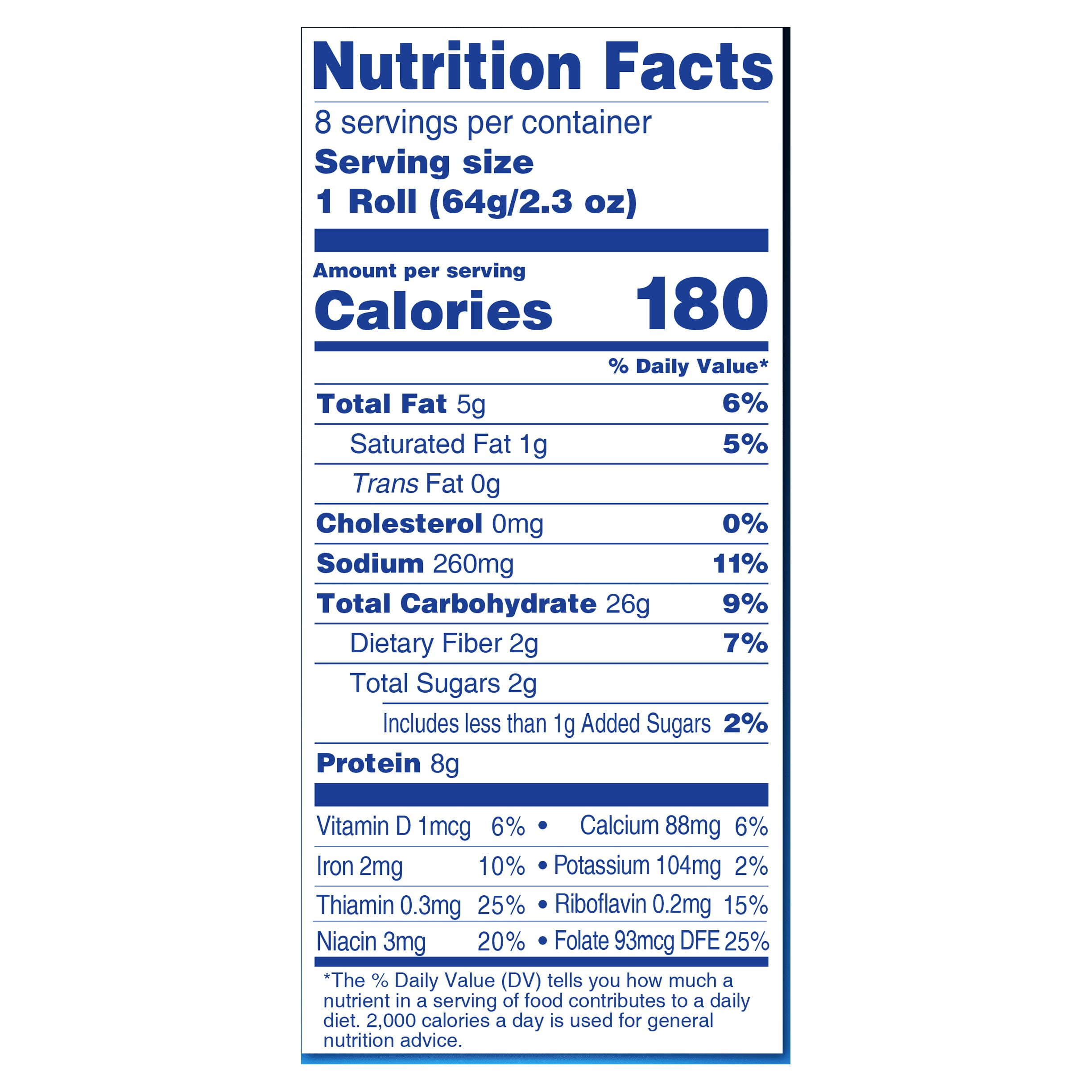 - Per 1 Roll Serving: 180 calories; 1 g sat fat (5% DV); 260 mg sodium (11% DV); 2 g sugars.