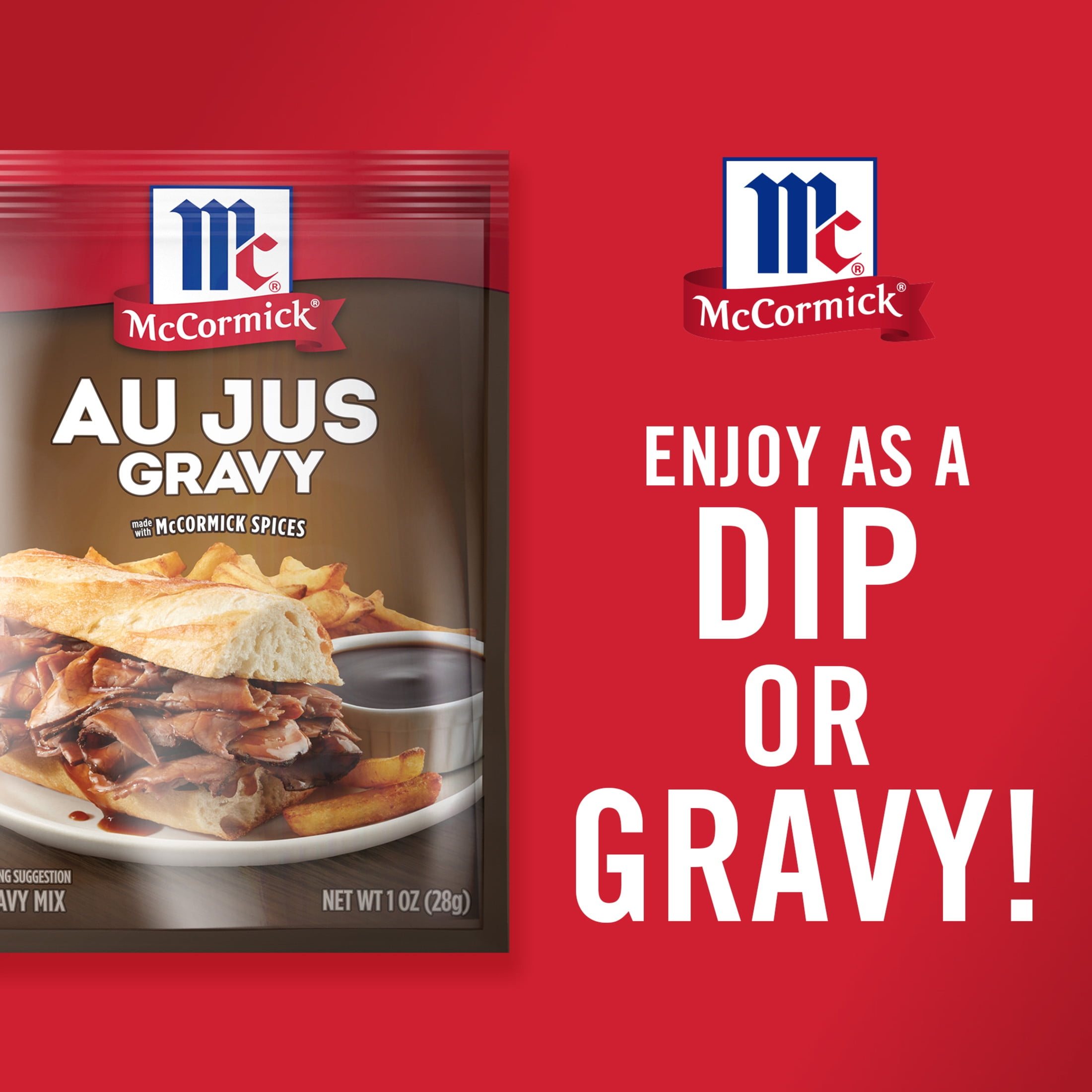 - AU JUS IN MINUTES: Prepare savory au jus gravy in less than 5 minutes with McCormick Au Jus Gravy Mix! Simply mix with water and boil for a savory sauce – the perfect lump-free gravy for prime rib, pork, French Dip sandwiches and more.