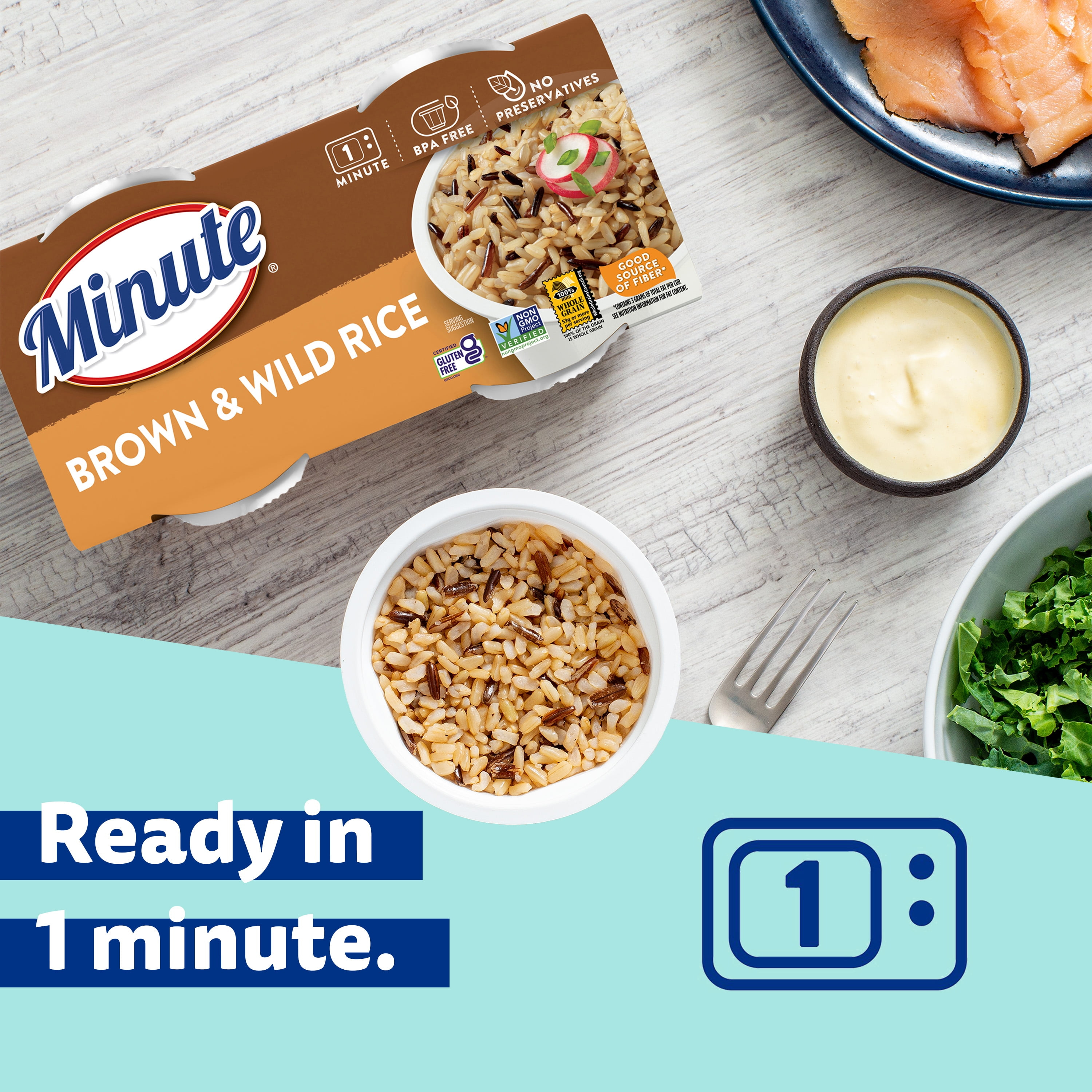 Minute Brown Rice and Wild Rice cups are quality rice known for their chewy consistency and nutty flavor. Fast and delicious, Minute Brown and Wild Rice cups are pre-cooked and ready in 60 seconds, so you can spend less time cooking and have more time to enjoy all the moments that happen when you slow down. Minute Brown and Wild Rice cups are cholesterol-free, made without preservatives, Non-GMO Project Verified, and use BPA-free cups.