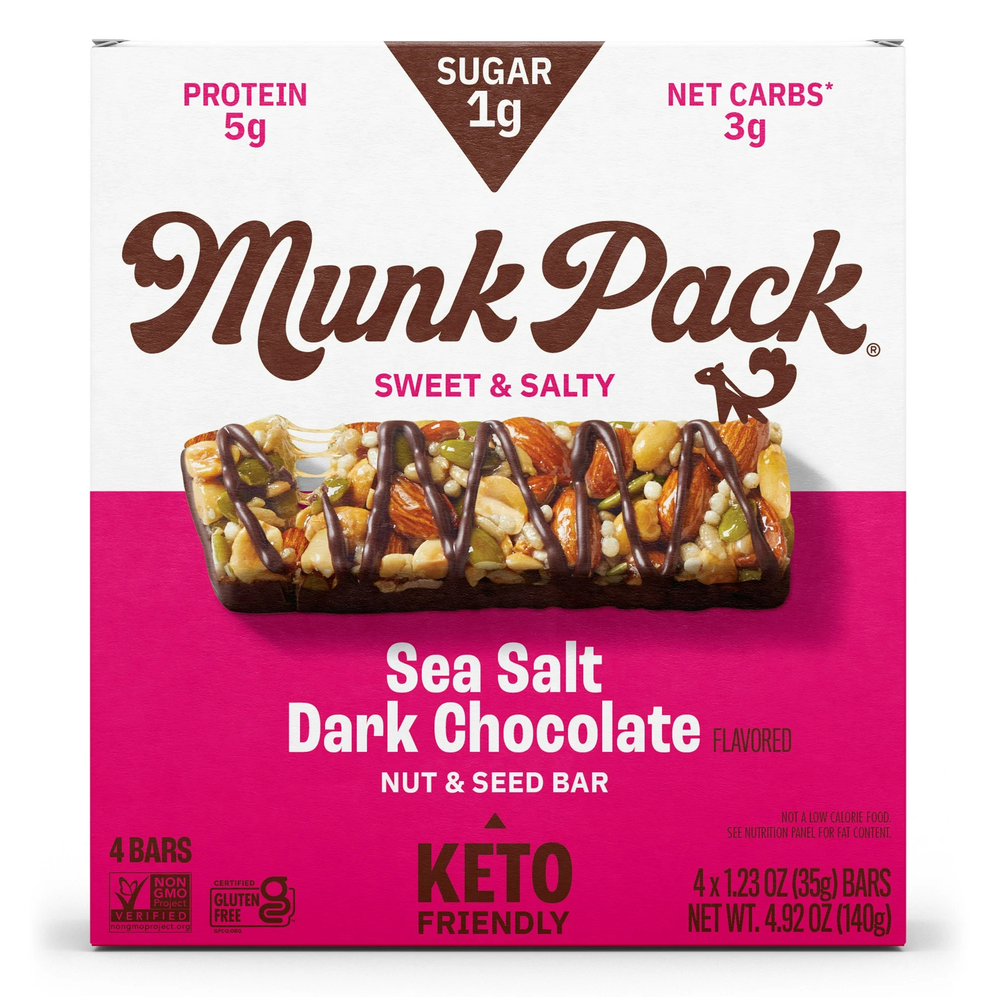 MUNK PACK 1g Sugar Nut & Seed Bars, Sea Salt Dark Chocolate – Low Carb Keto Bars, Low Sugar Snacks, Gluten Free – Box, 4 Count, 1.23oz