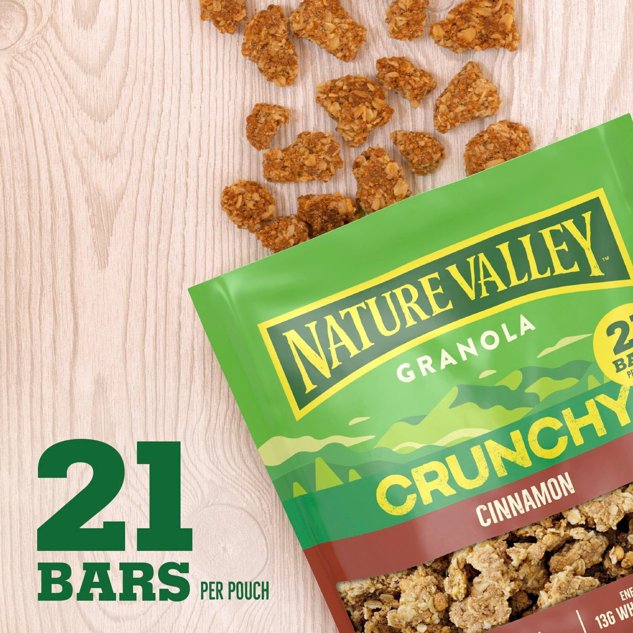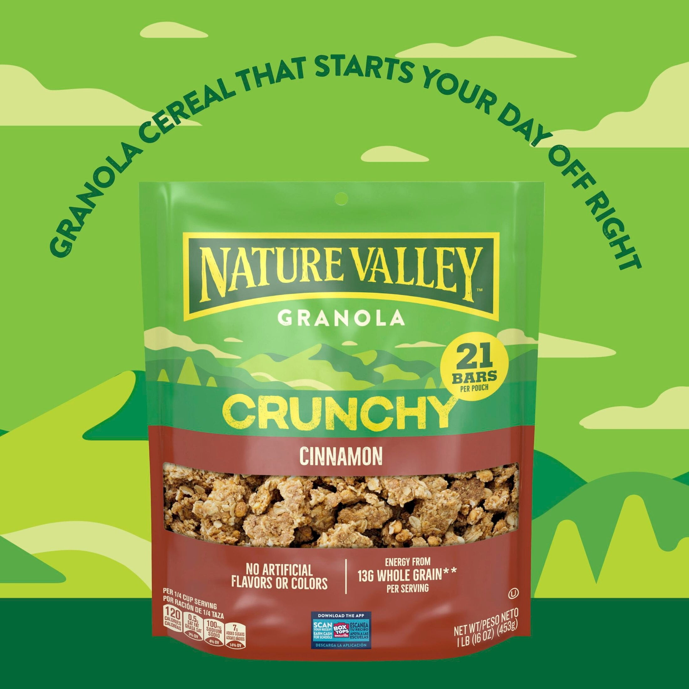 Fuel your adventures any time, any place with Nature Valley Crunchy Cinnamon Granola. This 16 oz pouch has 21 bars’ worth of granola. The taste of cinnamon and the goodness of granola made with whole grain oats are a wholesome way to kick-start your day. Each serving provides energy from 13g whole grain (at least 48g recommended daily). Plus, the crunchy cinnamon granola clusters have no artificial flavors or colors, and no high fructose corn syrup. So whether you enjoy a bowlful as a breakfast cereal or take along the pouch for family snacks on the run, this cinnamon granola delivers on the go energy. Add your own fruit and nut combination for DIY trail mix. Sprinkle the Nature Valley granola clusters over a yogurt parfait or acai bowl for serious crunch. This pouch of loose granola cereal is resealable for easy school snacks or part of breakfast on the go. At Nature Valley, we believe that what you put in is what you get out. So wherever the moment takes you and your family, you can rely on our great-tasting snacks to help keep you going, whenever and wherever you need it. Contains one plastic pouch of crunchy Nature Valley Crunchy Cinnamon Granola, 16 oz; perfect for instant snacking, or a part of breakfast and meals.