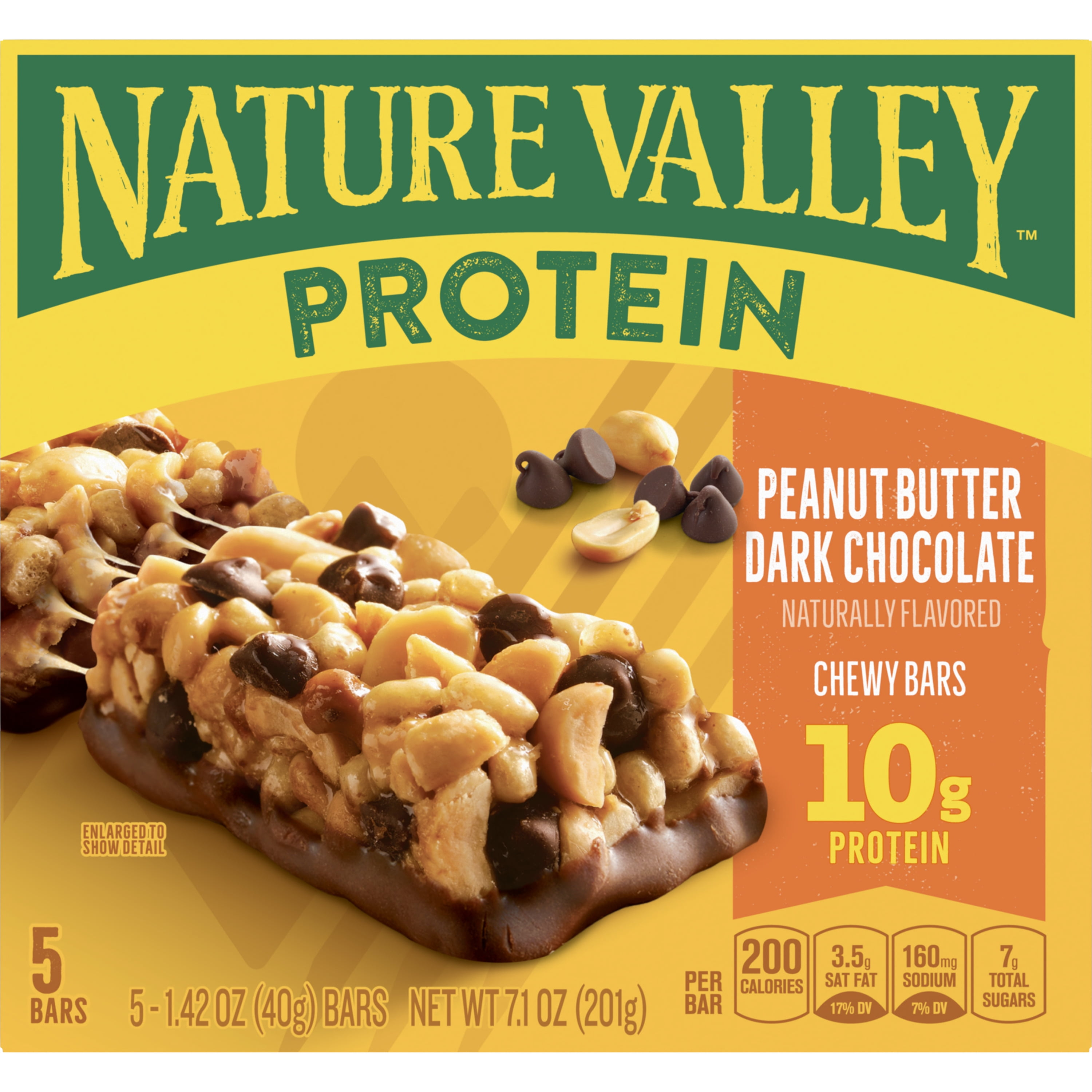 - CONTAINS: One 7.1 oz box of Nature Valley Peanut Butter Dark Chocolate Protein Granola Bars; 5 bars