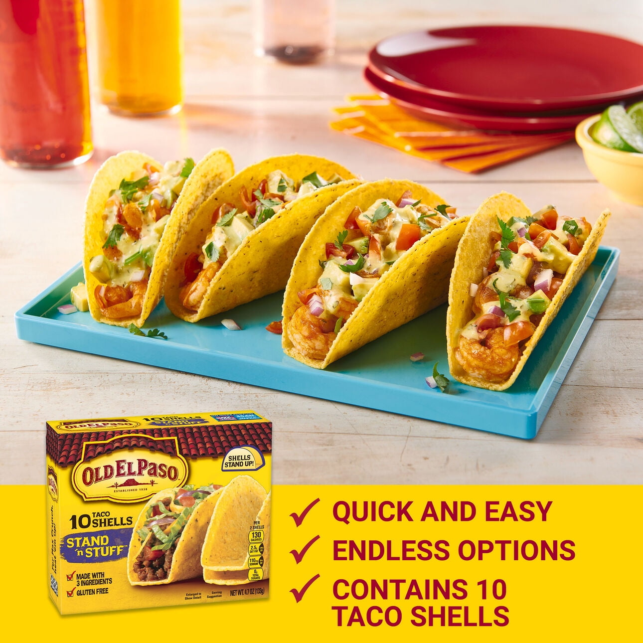 Make taco night a stand’n invitation with 10 Old El Paso Stand ‘N Stuff Crunchy Taco Shells. Stand ‘N Stuff Shells have a flat bottom so they stand up on their own. Fill these gluten-free taco shells up with your favorite meats, cheeses, beans and fresh toppings for a taco fiesta.For more than 80 years, Old El Paso has been bringing families and communities together to celebrate old and new traditions around delicious, Mexican-inspired flavors. We believe that any night can be a taco night, and we’re here to help make it a little easier and a lot more delicious. Our variety of crispy hard taco shells, tasty soft tortillas, flavorful seasonings, and much more help make taco night fun.