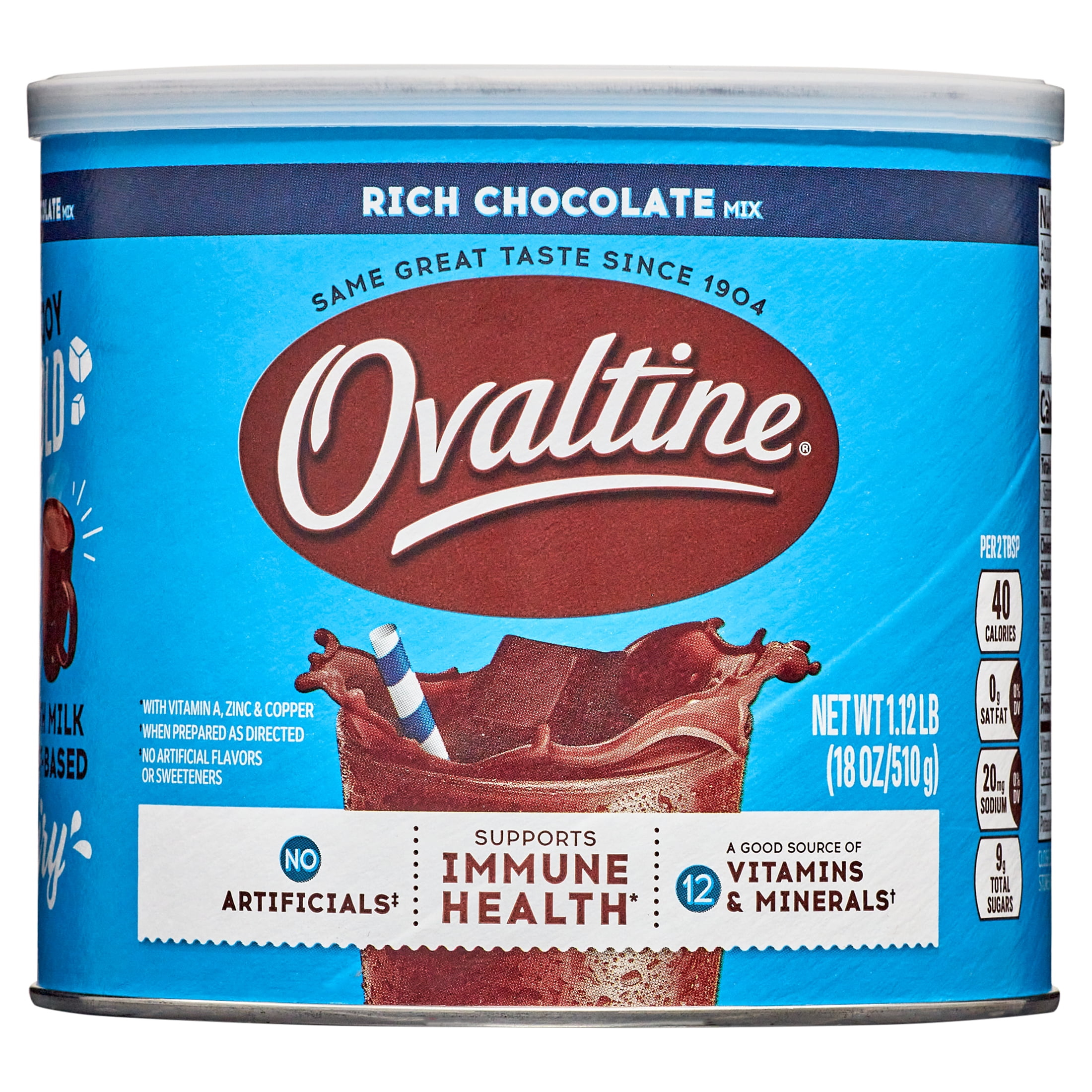 Make your milk work harder with Ovaltine Rich Chocolate Flavored Powdered Drink Mix. A classic addition to milk and plant based dairy, this powder drink mix gives milk a nostalgic chocolate milk taste. Ovaltine Rich Chocolate Mix is a good source of 12 vitamins and minerals per serving, including iron, zinc, Vitamins A, D and E, when prepared as directed. These vitamins and minerals are good additions to the diets of kids and adults alike. Additionally, this rich chocolate drink powder contains no artificial flavors or sweeteners. Rich Chocolate Ovaltine drink mix powder goes great in a cold glass of almond milk for a dairy-free chocolate milk or a warm mug of whole milk for a classic hot chocolate. It is also perfect as an ice cream topping. Use this powdered chocolate milk mix in smoothies and baked goods for a rich chocolatey taste. Ovaltine Rich Chocolate drink mix comes in an 18 ounce canister big enough to share and is shelf stable when stored in a cool dark place with the lid closed tightly. Chocolatey and yummy all in one, Ovaltine has a rich heritage as a trusted provider of great tasting, good for you deliciousness.