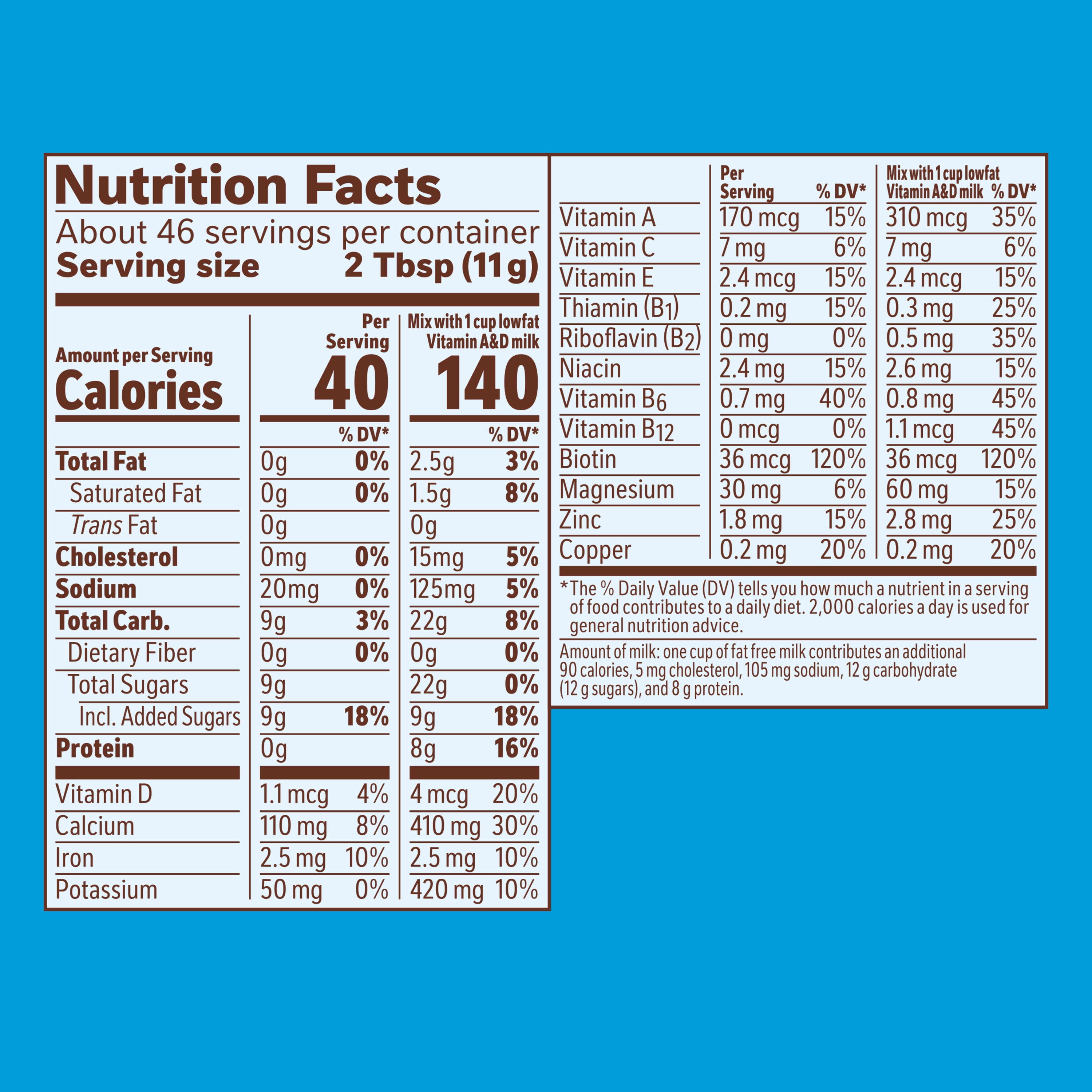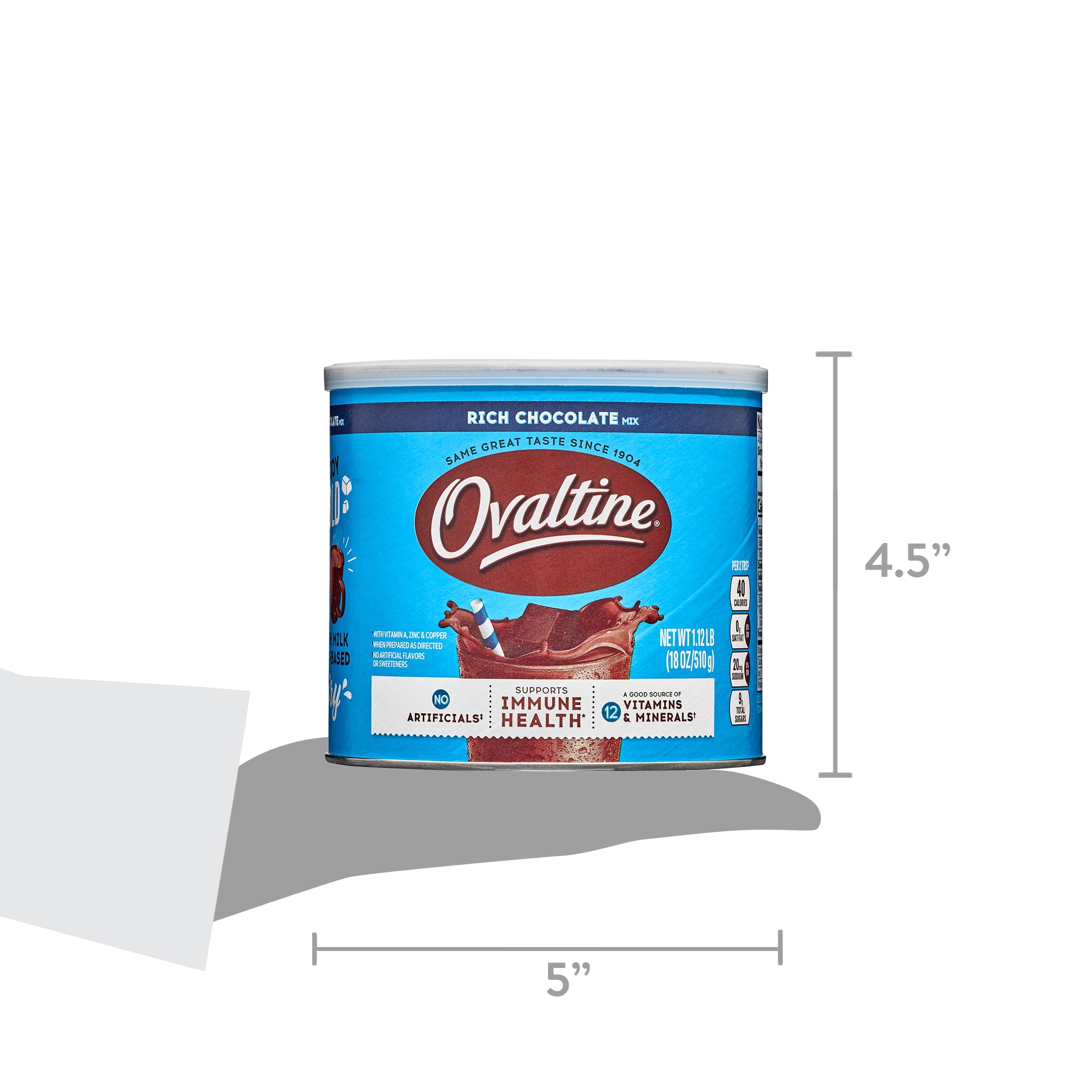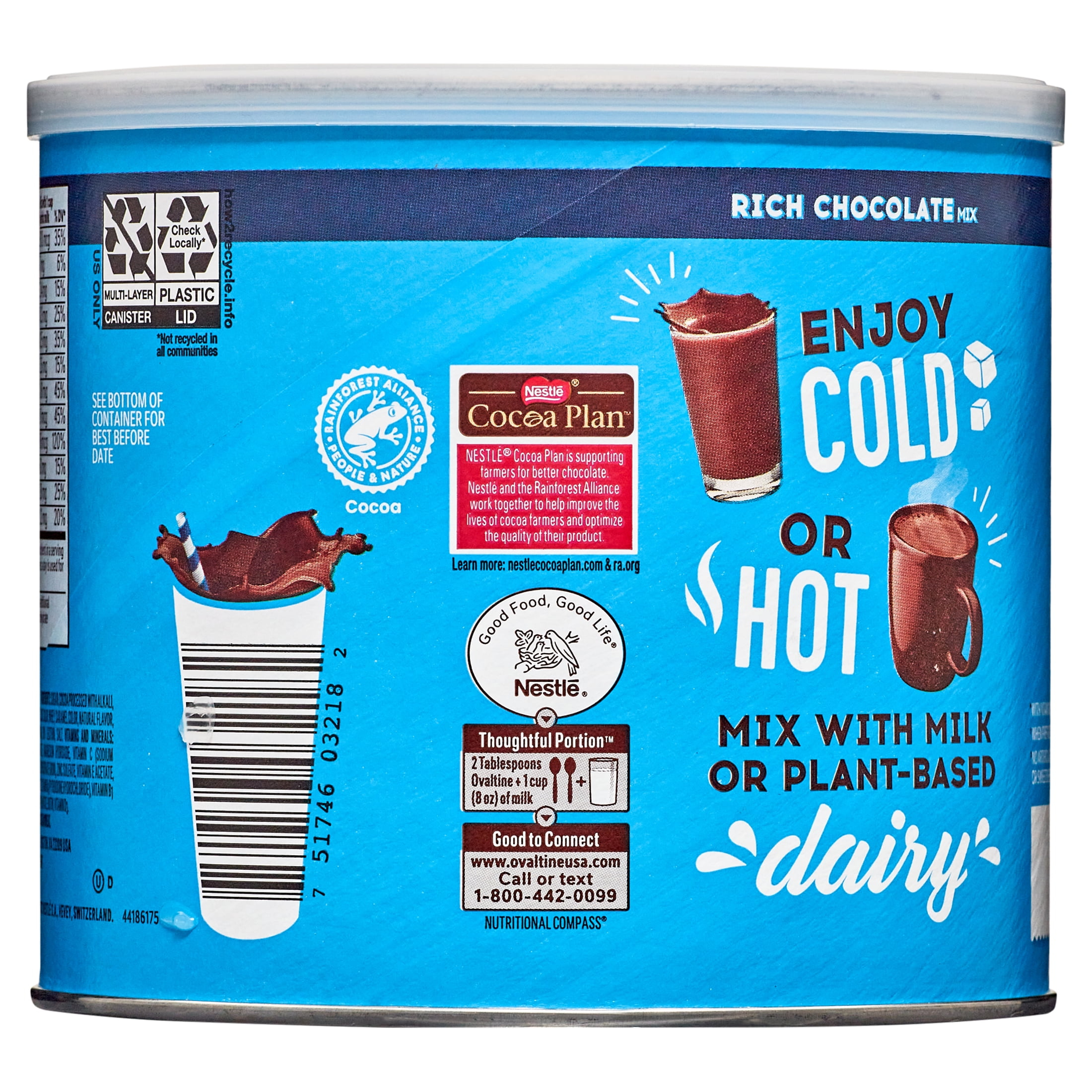 Make your milk work harder with Ovaltine Rich Chocolate Flavored Powdered Drink Mix. A classic addition to milk and plant based dairy, this powder drink mix gives milk a nostalgic chocolate milk taste. Ovaltine Rich Chocolate Mix is a good source of 12 vitamins and minerals per serving, including iron, zinc, Vitamins A, D and E, when prepared as directed. These vitamins and minerals are good additions to the diets of kids and adults alike. Additionally, this rich chocolate drink powder contains no artificial flavors or sweeteners. Rich Chocolate Ovaltine drink mix powder goes great in a cold glass of almond milk for a dairy-free chocolate milk or a warm mug of whole milk for a classic hot chocolate. It is also perfect as an ice cream topping. Use this powdered chocolate milk mix in smoothies and baked goods for a rich chocolatey taste. Ovaltine Rich Chocolate drink mix comes in an 18 ounce canister big enough to share and is shelf stable when stored in a cool dark place with the lid closed tightly. Chocolatey and yummy all in one, Ovaltine has a rich heritage as a trusted provider of great tasting, good for you deliciousness.