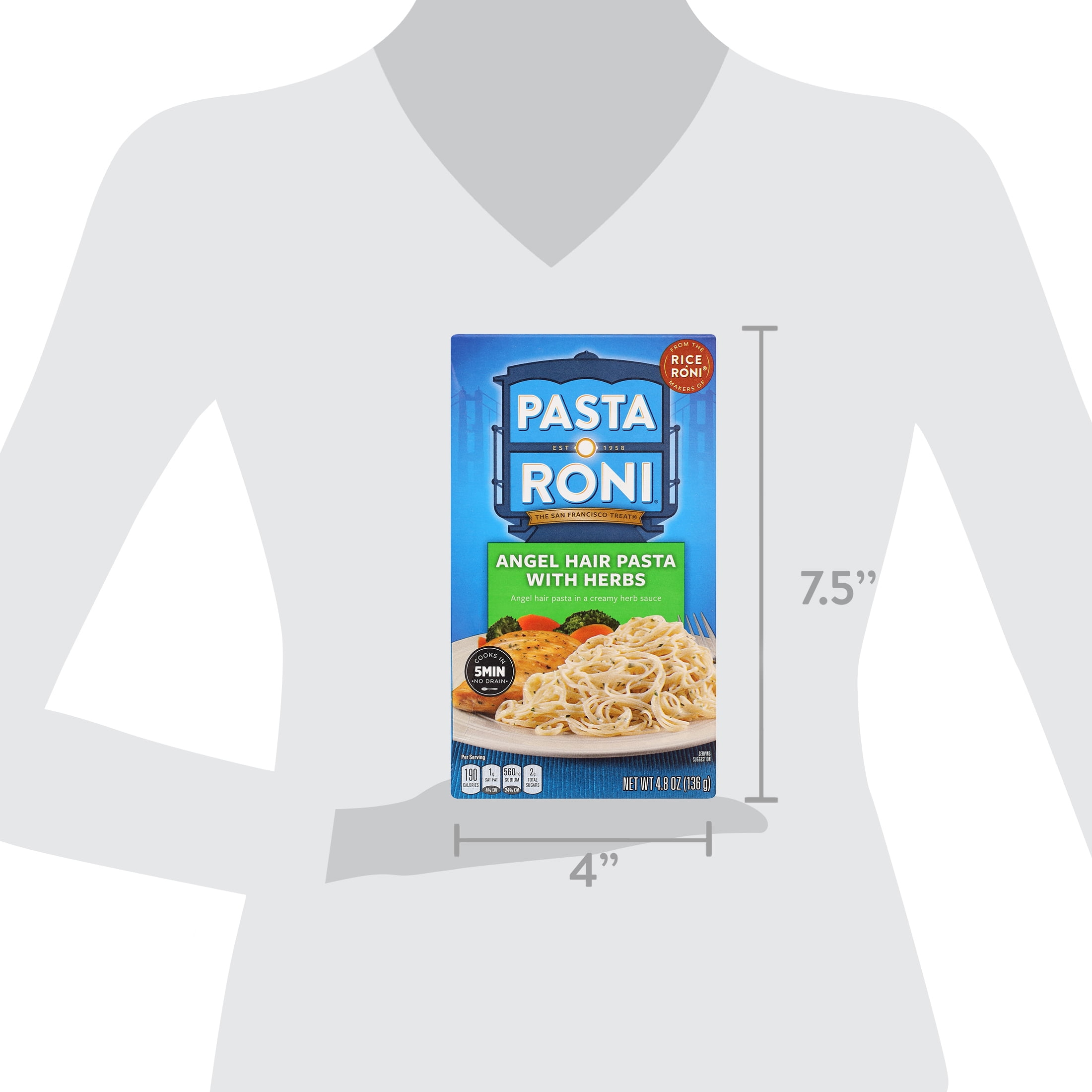 Pasta Roni Angel Hair Pasta With Herbs. Angel hair pasta in a creamy herb sauce. Making homemade easy. Try Rice-A-Roni for another easy homemade meal. Questions or comments? Call 1-800-421-2444. Please have package available when calling. This package is sold by weight, not by volume. Some settling of contents may have occurred during shipment and handling. The San Francisco Treat. Partially produced with genetic engineering. Regular size cardboard box, shelf-stable product. Contains wheat, milk and soy ingredients.