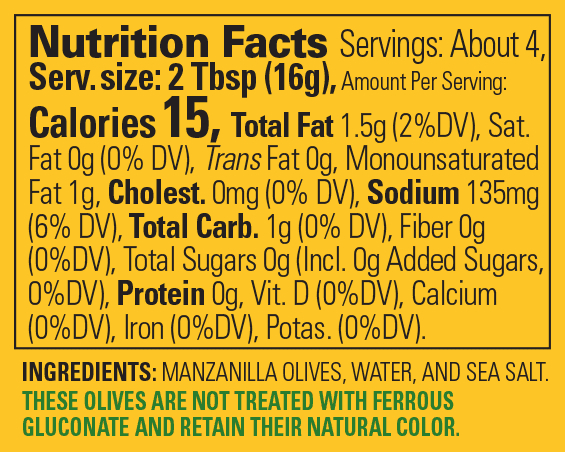Pearls Nothing Artificial Sliced California Ripe Olives 6 oz. Can Non GMO, Gluten Free, Kosher, Vegan, Vegetarian. How do we make the most delicious, natural-ingredient ripe olive? Well, we start with the best trees, from the best orchards in California, growing the best variety of olive — the mighty manzanilla. Then we add nothing but water and sea salt. No additives, preservatives, or artificial colors. Unlike traditional olives, these new Pearls are not treated with ferrous gluconate, preserving the olives’ natural brown-black color. Our “fresh cure” technique is simply the best way to make the most delicious “clean label” olive possible. Ideal for all your meal (pizza, pasta, salads), charcuterie board, and snacking needs.