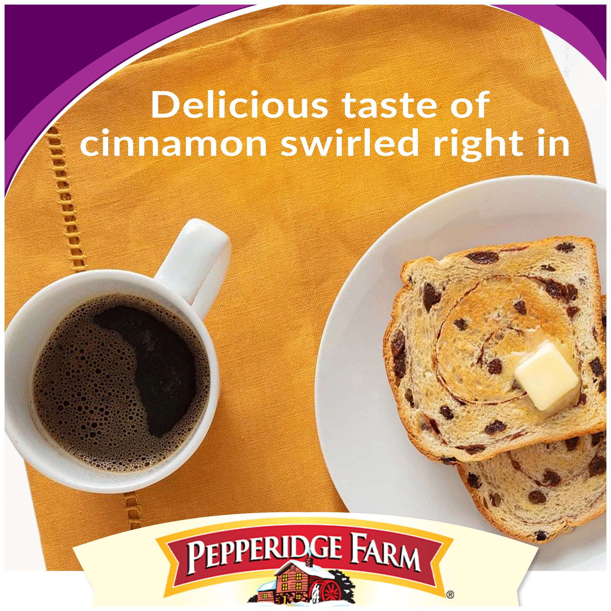 Welcome the day with a slice of Pepperidge Farm Raisin Cinnamon Swirl Bread. Every loaf is baked to perfection with plump, juicy raisins and rich cinnamon swirled right in. It’s lightly sweetened with no high-fructose corn syrup and sliced thick, perfect for toasting. Try it with your favorite spread or use it for your favorite French toast recipe. For Pepperidge Farm, baking is more than a job. To us, it’s a real passion. Each day, our bakers take the time to make every cookie, pastry, cracker, and loaf of bread the best way they know how. They always start with carefully selected, quality ingredients that are blended and baked to perfection, ready to welcome you to your day. From our ovens to your breakfast table, it’s the most delicious way to start your day! Shelf-stable product.