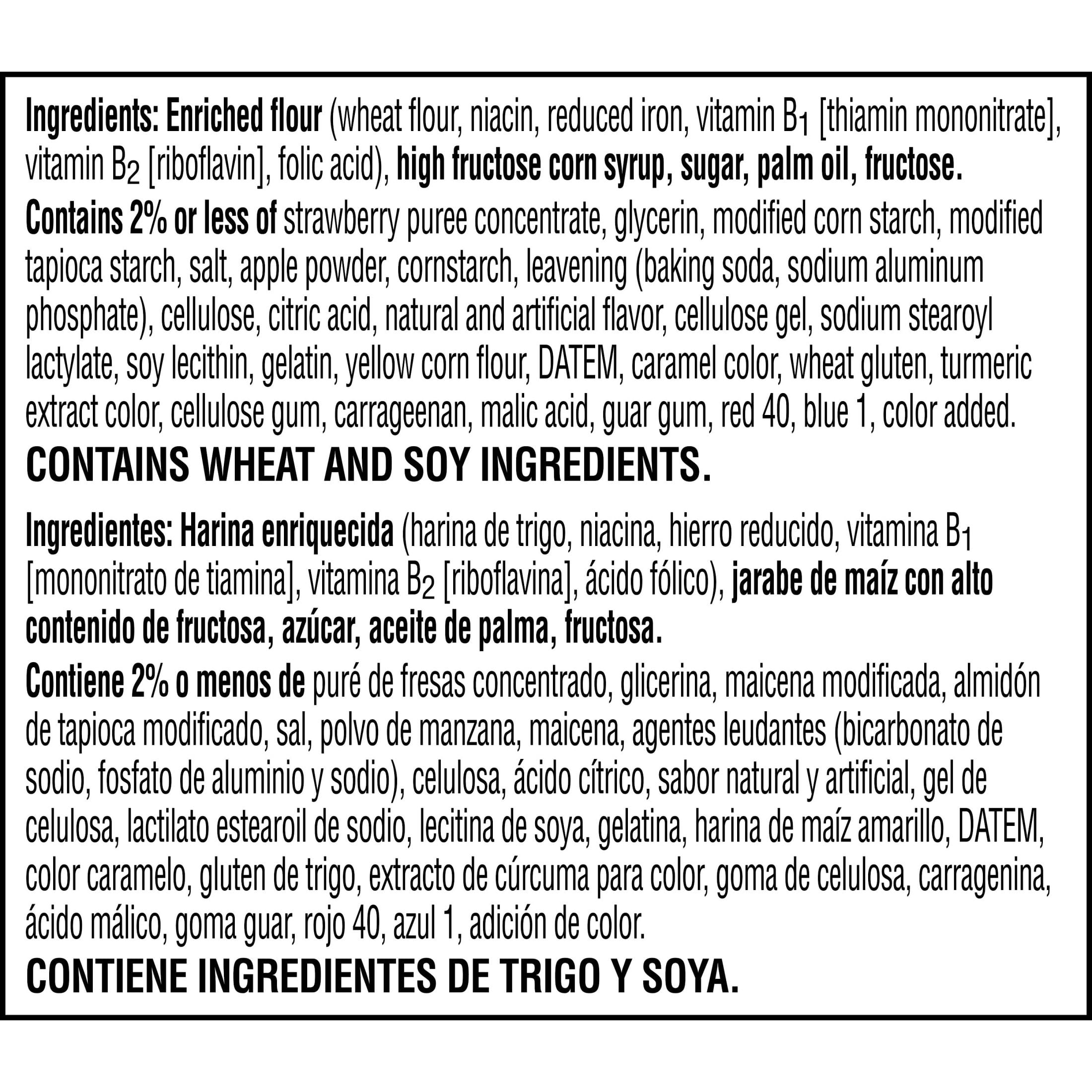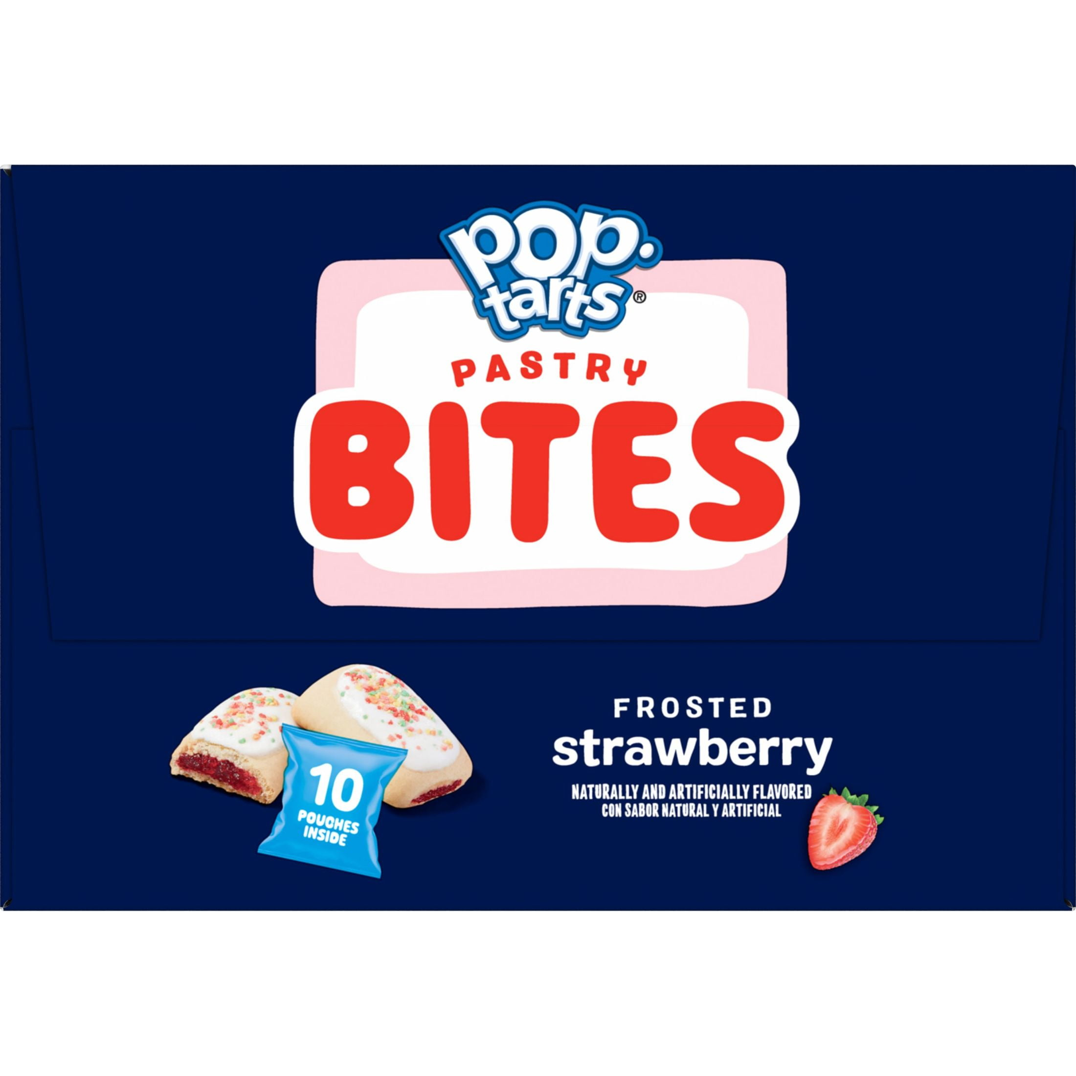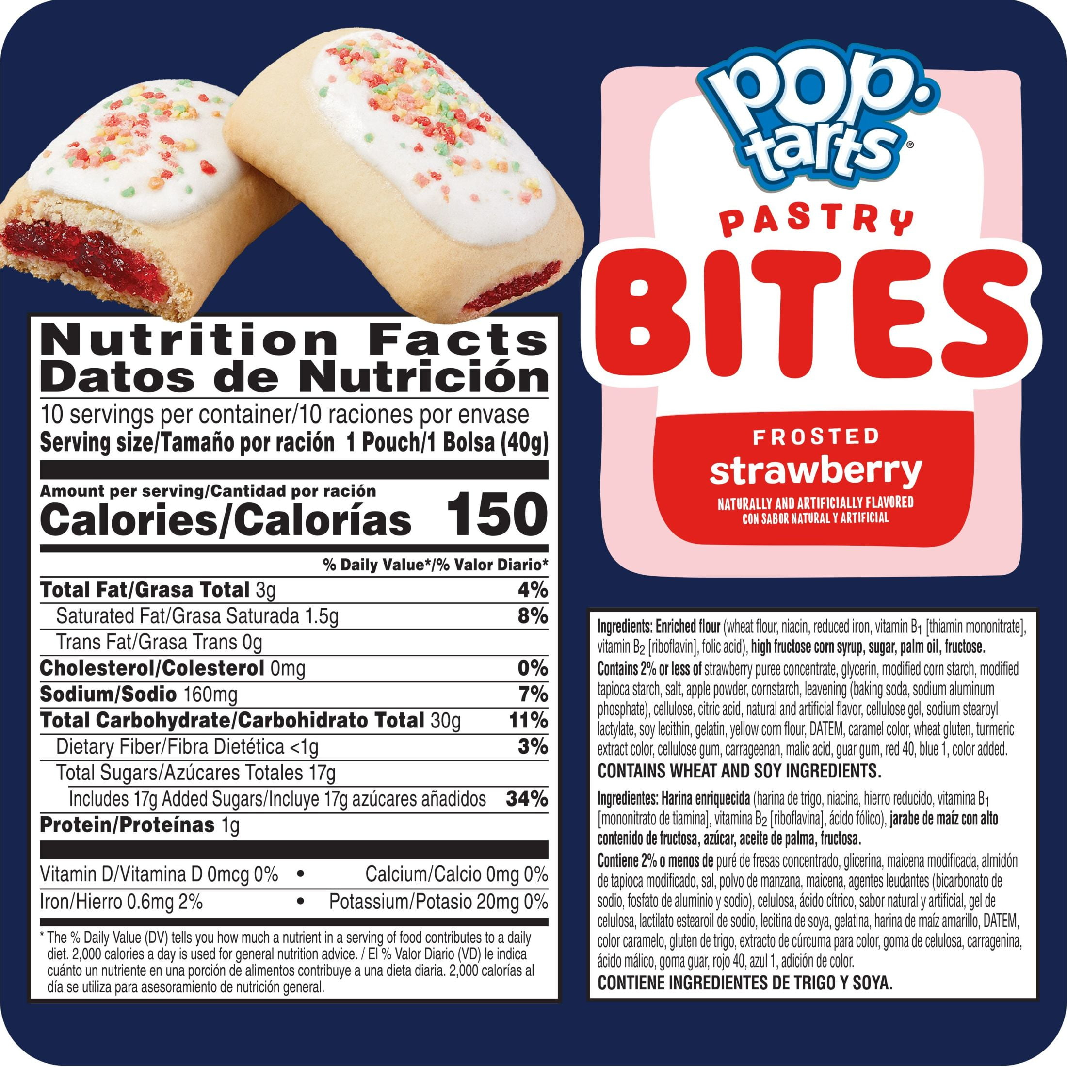 Indulge in a sweet treat with Pop-Tarts Frosted Strawberry soft baked pastry bites. Open a pouch and grab a soft and fluffy pastry, bursting with delicious strawberry flavor. These snack-sized bites are conveniently packaged in portable pouches and are perfect for on the go. Bite into these fun-to-eat pastries anytime, anywhere, no toaster needed! Craveable, fluffy and light, these party-in-a-pack pastry bites have a delicious filling and sweet, sprinkled frosting; A fantastically fun and crazy good snack for the whole family. Pop-Tarts soft baked pastry bites are an easy win for mid-morning snacks and lunchboxes. These ready-to-eat treats are great for your busiest, on-the-go moments. Keep them in your pantry or bring some in the car for a quick snack on the road. Share Pop-Tarts pastry bites and surprise friends and family with a snack they’ll be delighted to try. Just open the pouch and celebrate a moment of joy with Pop-Tarts Frosted Strawberry pastry bites. CONTAINS WHEAT AND SOY INGREDIENTS. Shelf-Stable and Instant.