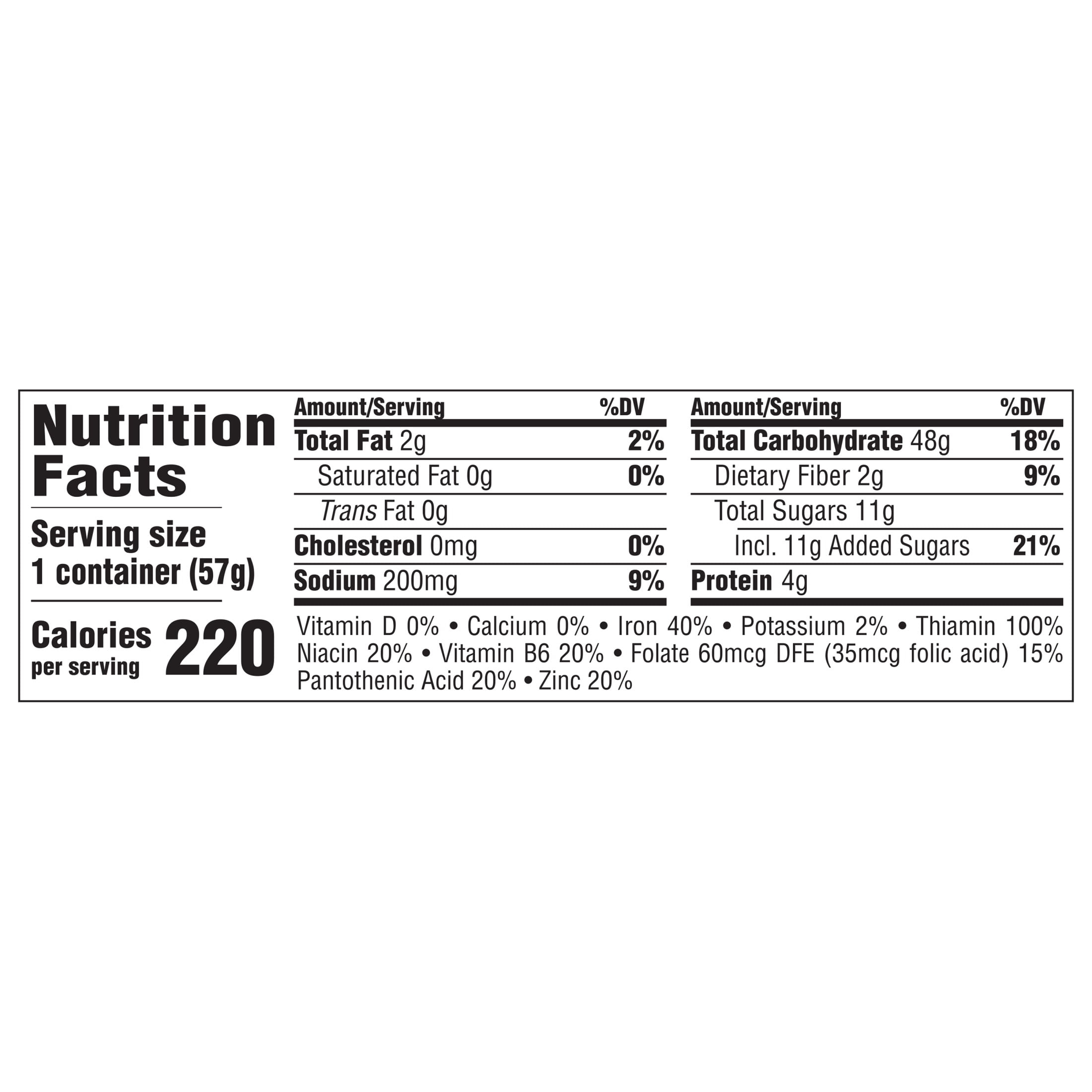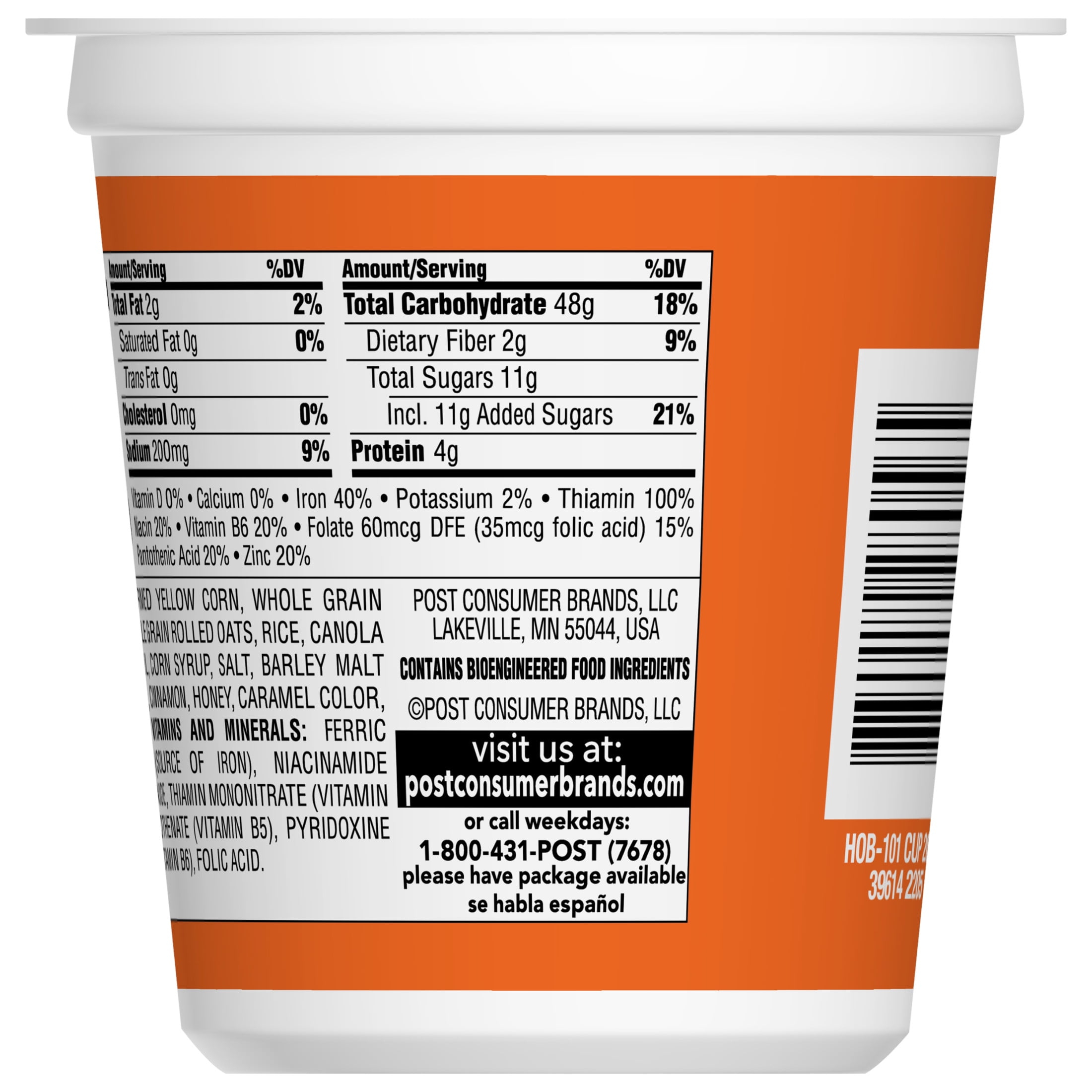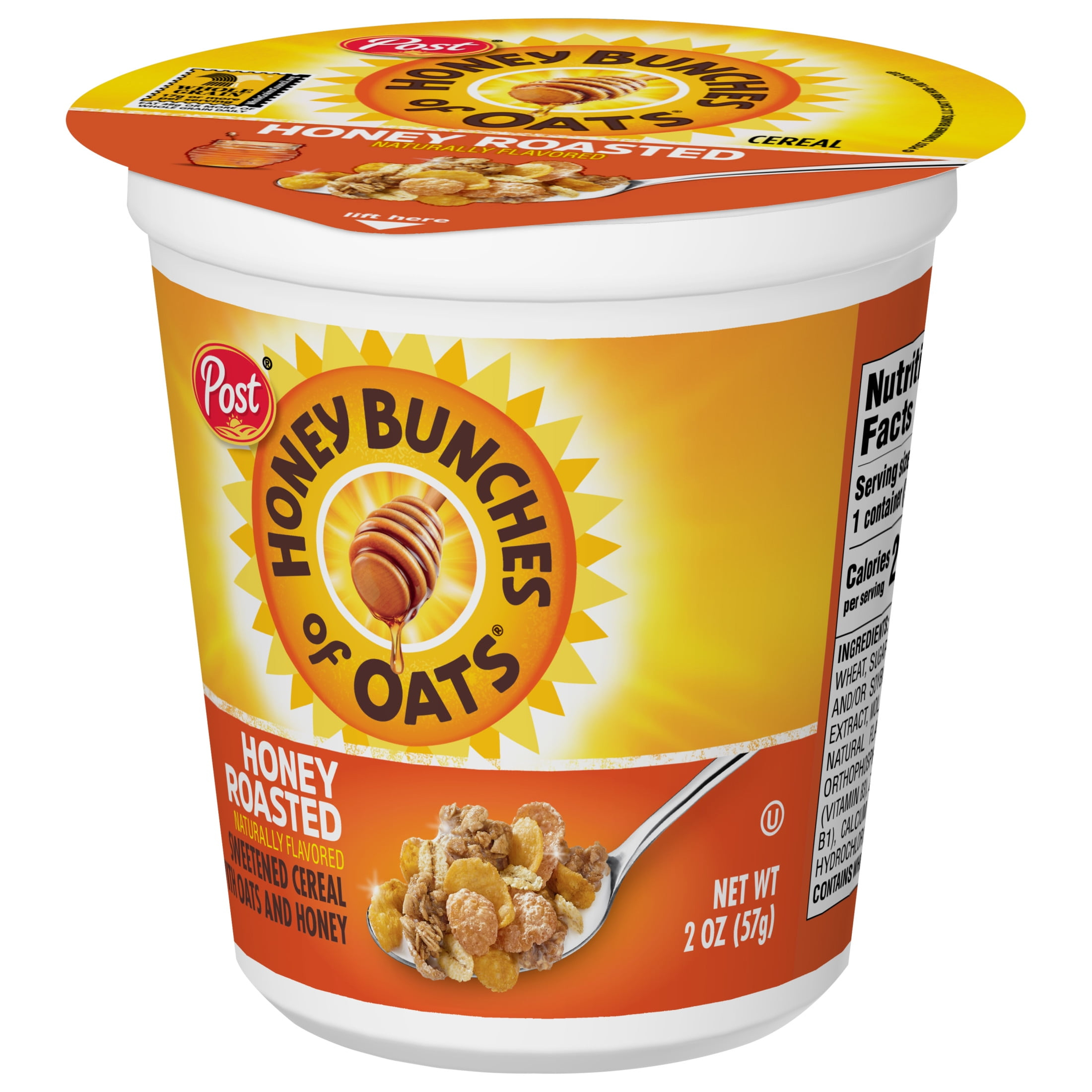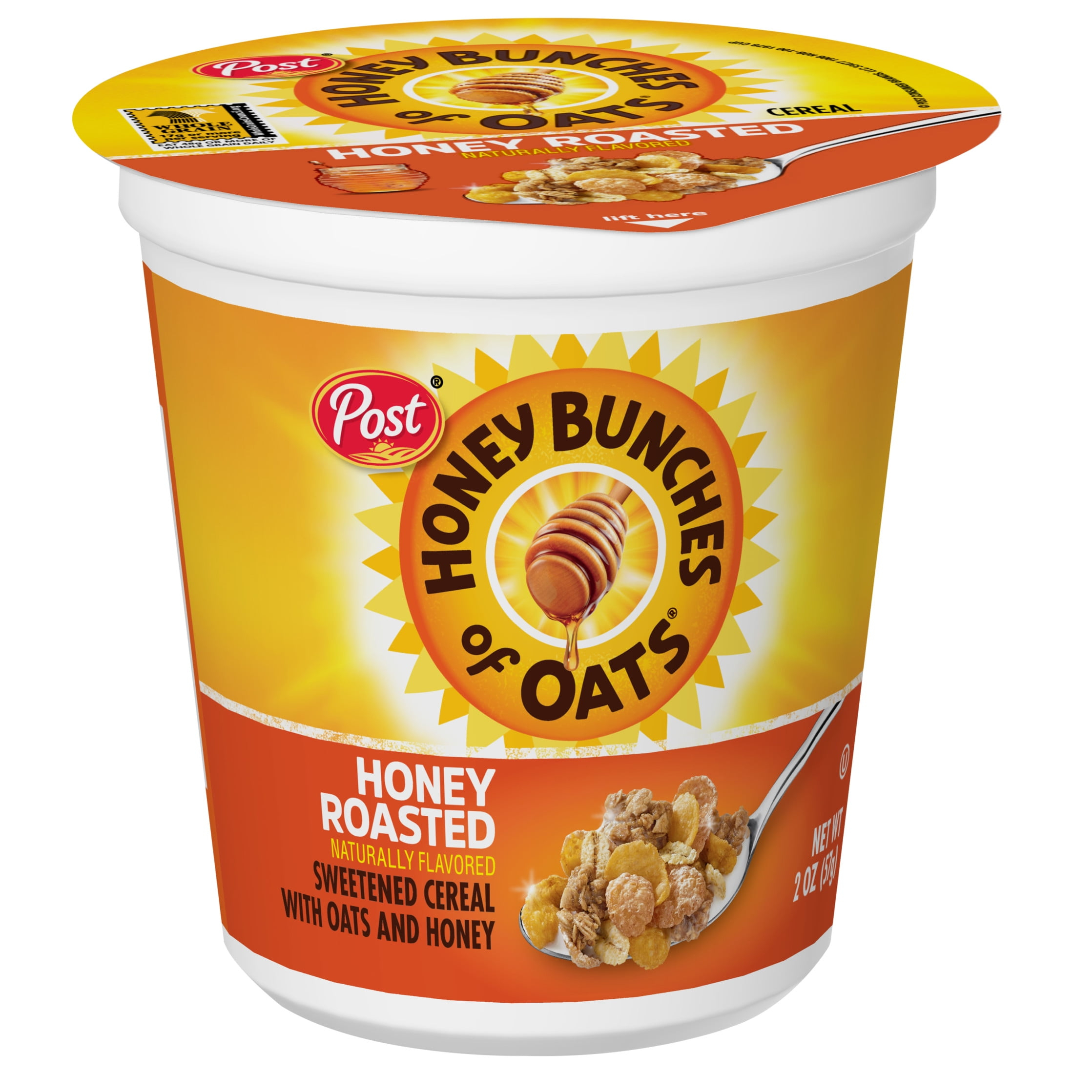 Help start your morning with energy with Honey Bunches of Oats Honey Roasted Breakfast Cereal. This Honey Bunches of Oats honey cereal cup is filled with crispy corn flakes, crunchy oat granola clusters and topped with a touch of honey to help you feel energized in an instant. Make morning me-time a little extra special and enjoy delicious oats and honey cereal with Post Honey Bunches of Oats. This honey roasted cereal contains 17 grams of whole grains per serving (1) and has 7 essential vitamins and minerals for the perfect boost of key nutrients in your morning breakfast cereal in each plastic cup. Add some fresh fruit to this cereal cup or sprinkle a few spoonfuls of this honey flavored cereal atop a yogurt cup or breakfast smoothie for even more fun and delicious flavor. Packaged in a small cereal cup, this honey oats cereal is easy to enjoy as a quick snack anywhere or breakfast on-the-go. Make your bowl and day a whole bunch better with Honey Bunches of Oats Honey Roasted Breakfast Cereal. (1) Nutritionists recommend eating 3 or more servings of whole grain foods per day (about 16g whole grain per serving or at least 48g per day).