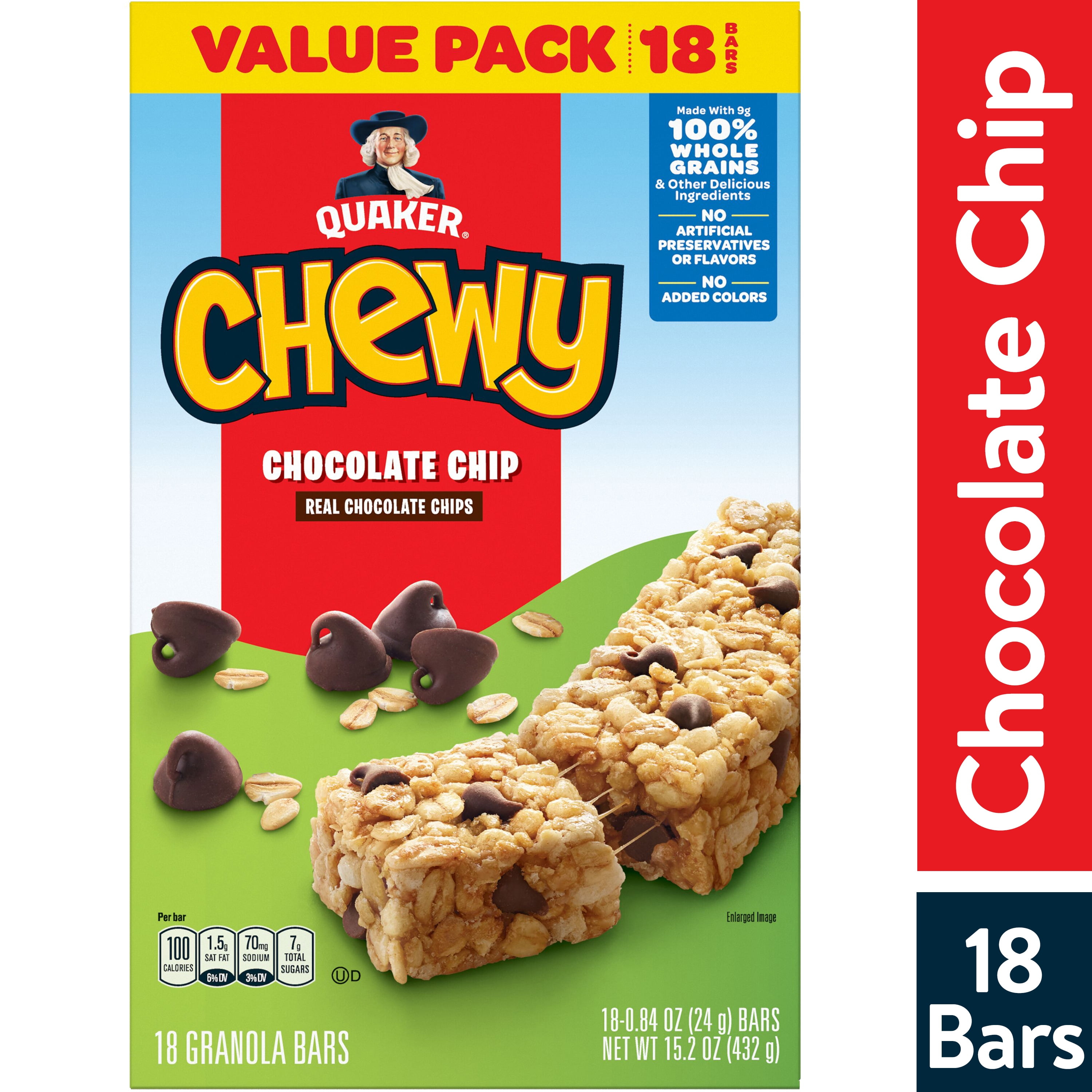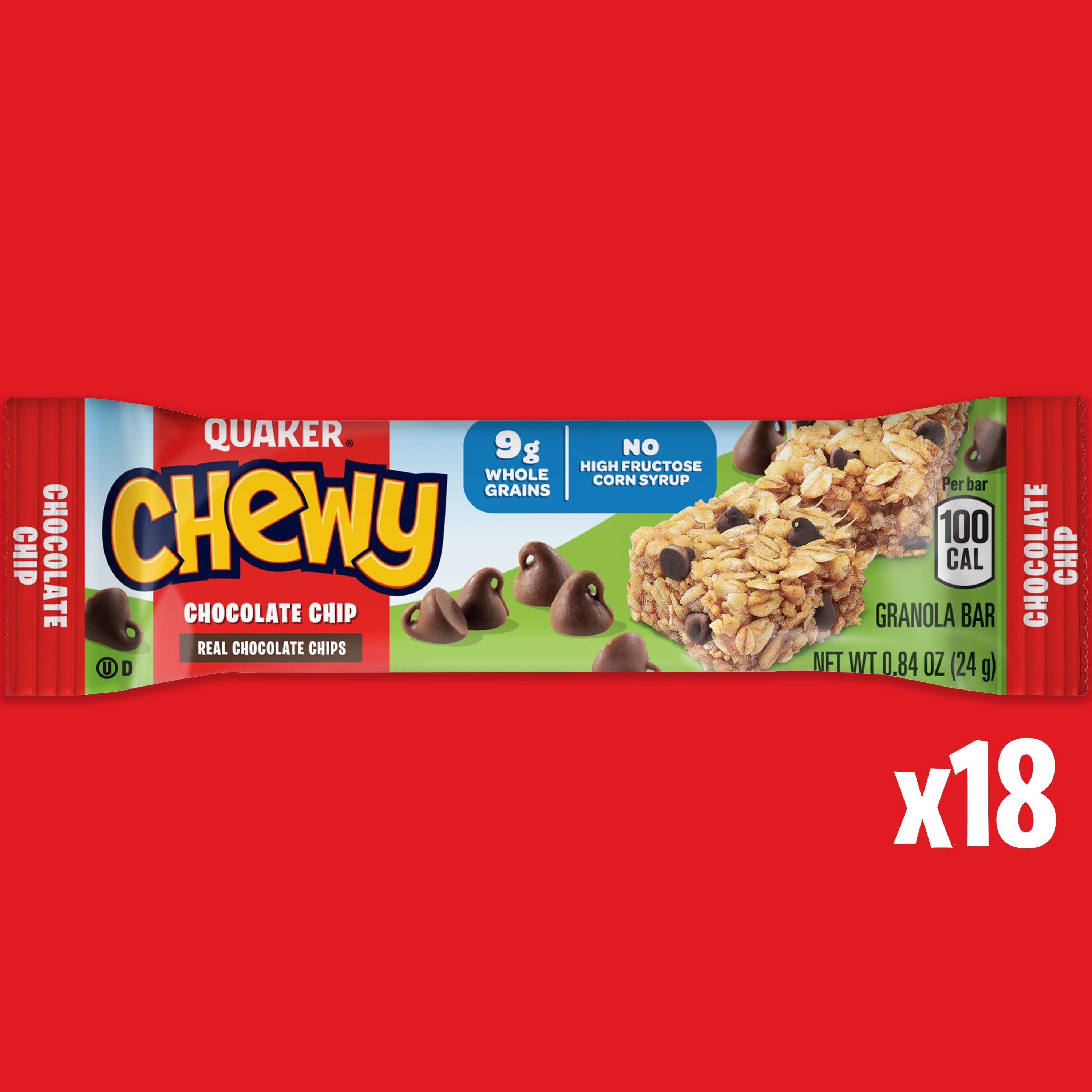 - Includes 18 count of (0.84oz) Quaker Chewy Granola Bars Chocolate Chip flavor