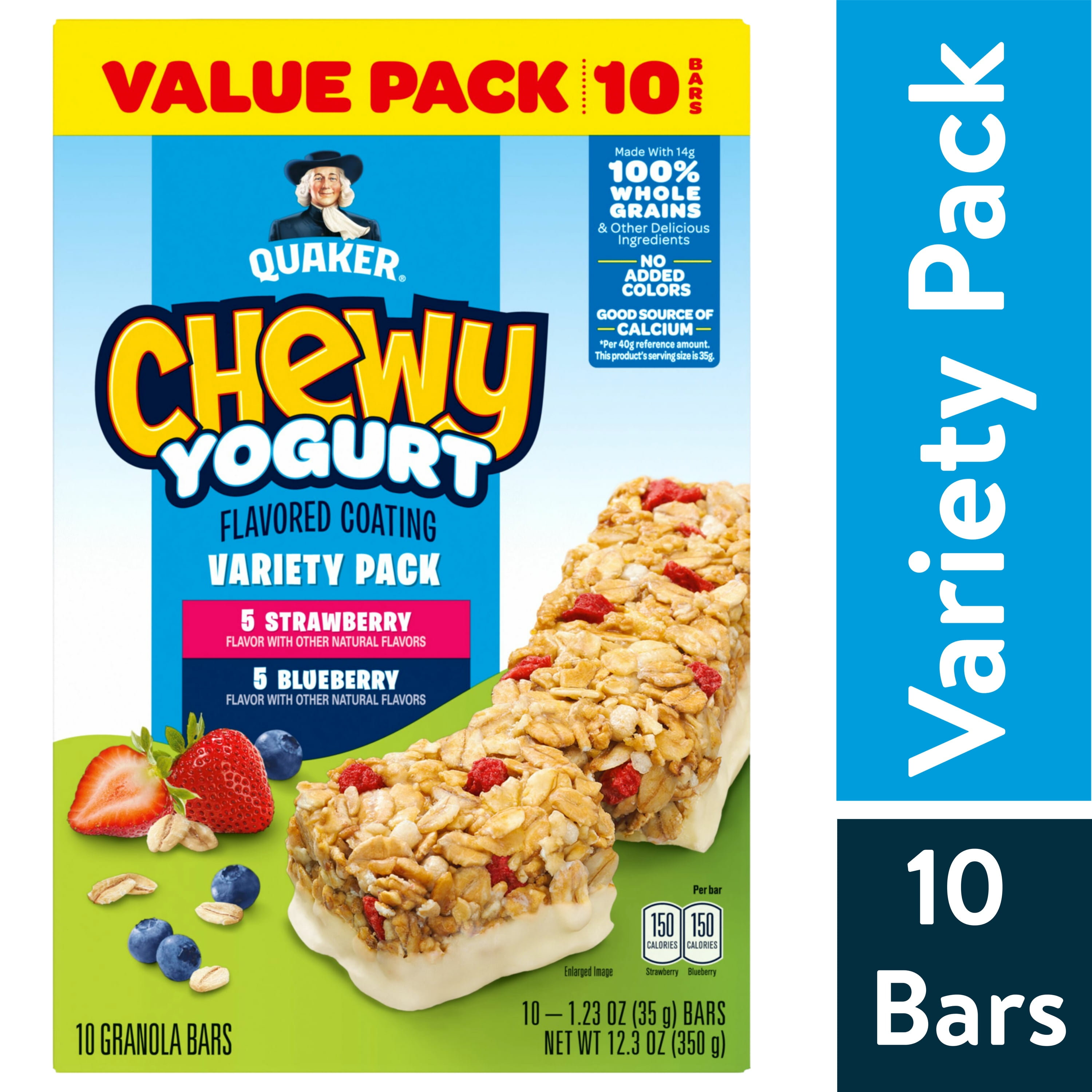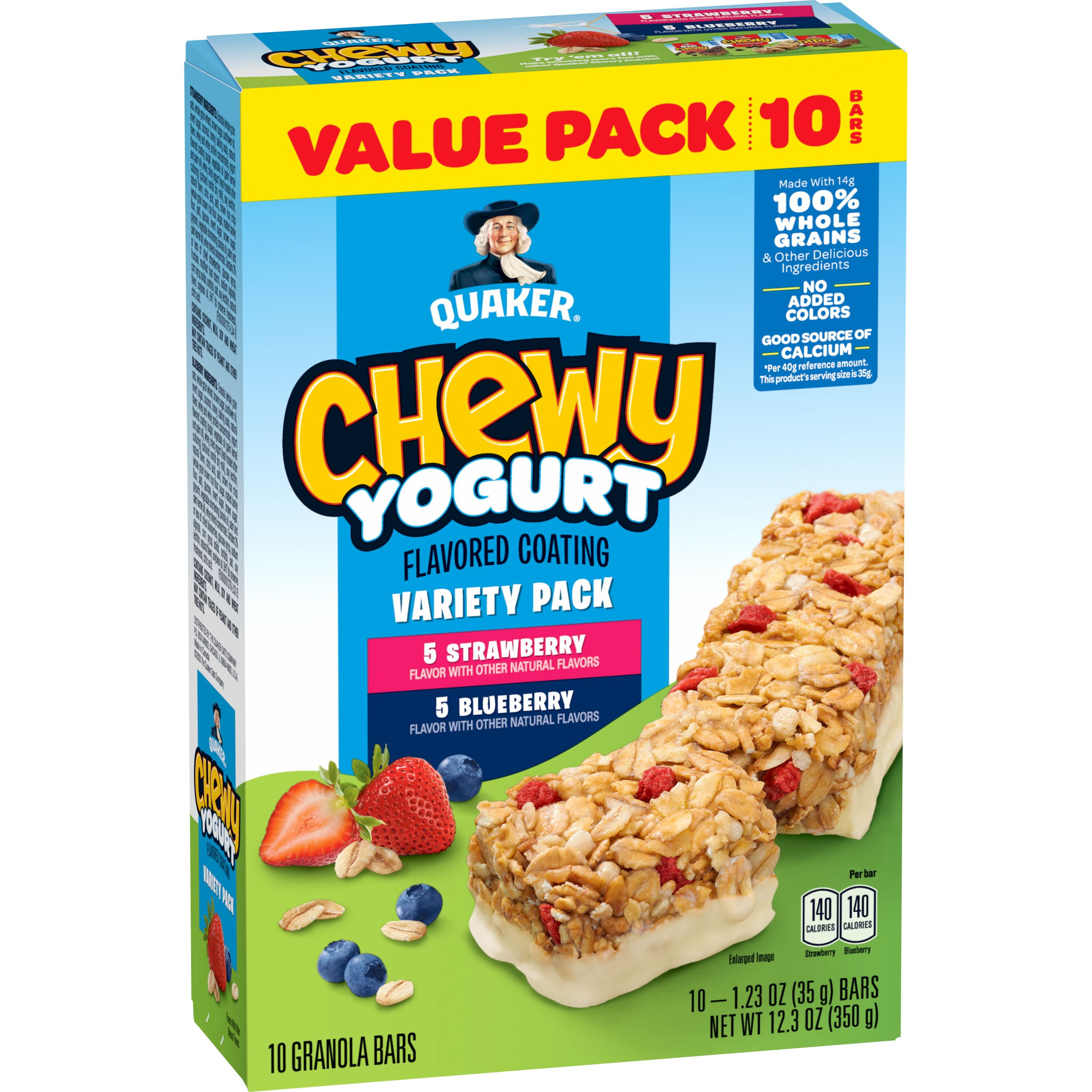 Quaker Chewy Yogurt Strawberry and Blueberry Variety Pack offers a delicious and convenient snack option for any time of day. Each 12.3 oz box contains 10 chewy granola bars, featuring the tasty flavors of strawberry and blueberry, all drizzled with creamy yogurt. These bars are perfect for on-the-go snacking, lunchboxes, or as a sweet treat. Made with wholesome ingredients, they provide a satisfying balance of flavor and nutrition!