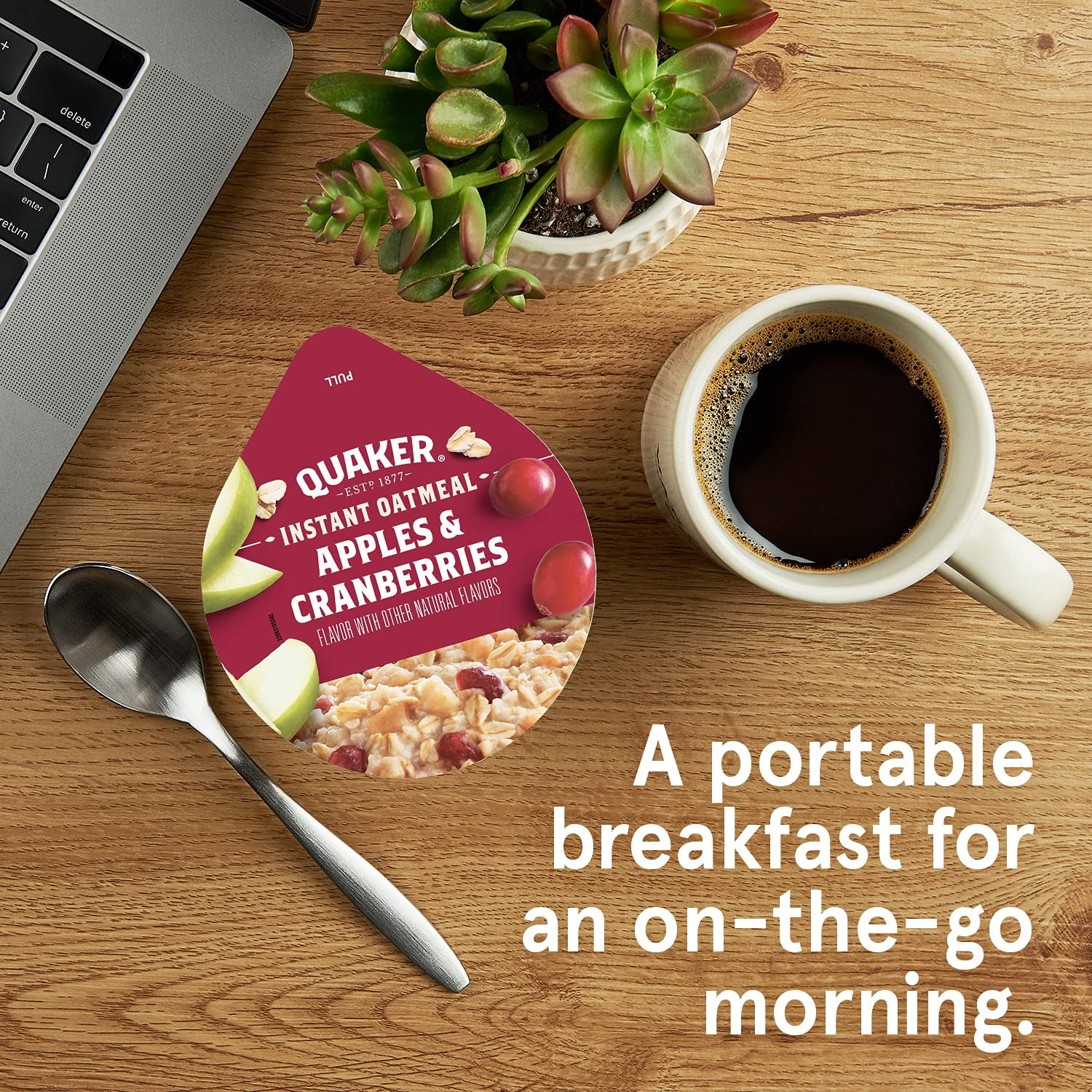 Includes 1 (1.79 oz) Quaker Instant Oatmeal Cup, Apples & Cranberries flavor. Eating nutritious foods doesn’t have to be boring. Enjoy Quaker Oatmeal Apples & Cranberries for a fun twist on a breakfast time favorite with no artificial preservatives or flavors. Sweet and tasty apples & cranberries blended with heart-healthy* whole grains Quaker Oats and other delicious ingredients. 7 grams of protein and 32 grams of whole grains per serving, all in a convenient on-the-go cup. It’ll remind you why breakfast time really is the best! Orthodox Union Kosher Certified. Whole Grain Council Stamp. Shelf-Stable and Ready-to-Microwave.