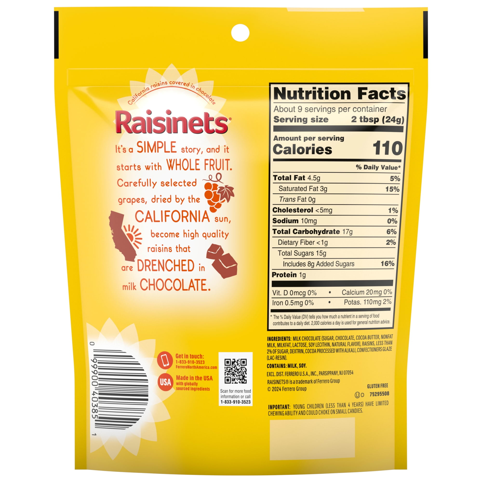 Grab a bag of the perfectly classic, perfectly delicious milk chocolate Raisinets. This classic candy combo of milk chocolate and plump, juicy raisins is a delicious chocolate snack option that can’t be beat. Made with sun-ripened, juicy California raisins and gluten-free chocolate, this delicious treat has 30% less fat than the leading chocolate brands and absolutely no artificial flavors or colors. Perfect for at-home movie nights, Raisinets bring the fun right to your couch. This resealable bag makes sharing with friends, family and coworkers fun and easy. Grab some today and add the delicious taste of Raisinets to your snack time.