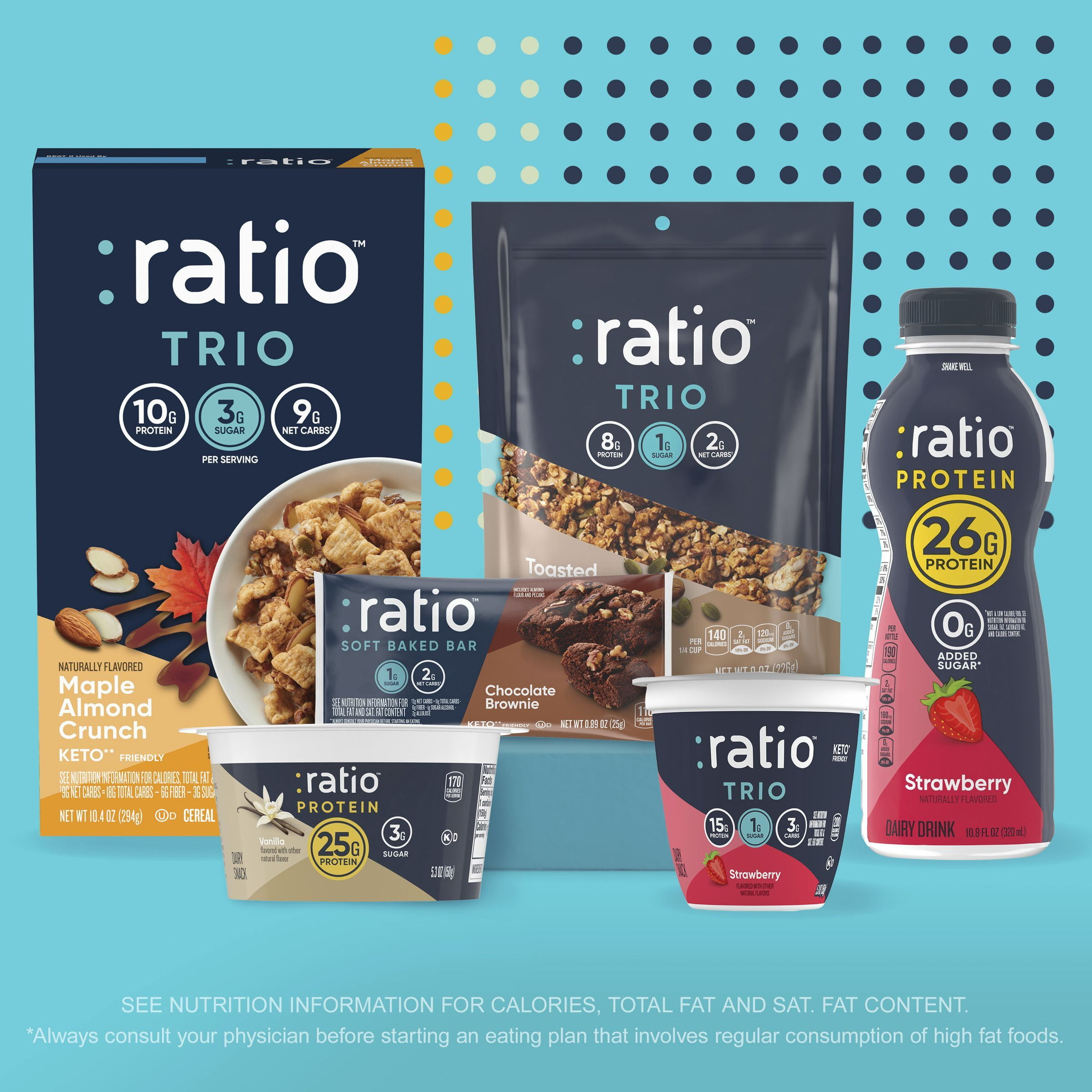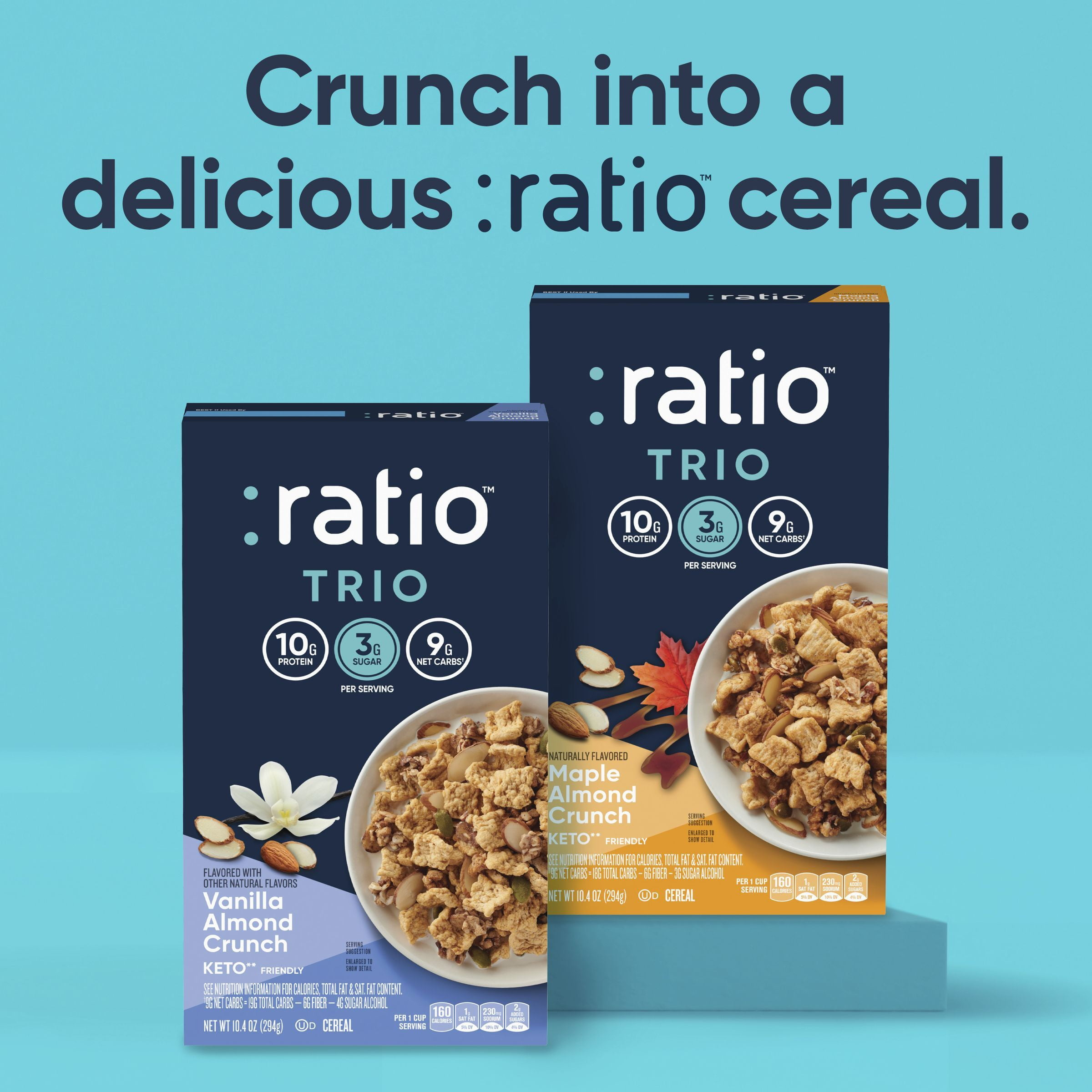 Discover the protein you crave in breakfast food inside every box of Ratio Trio Maple Almond Crunch Cereal. Made with delicious ingredients designed to keep you on track, crunch into this keto* friendly mix of maple flavored cereal squares, nutty clusters, sliced almonds, pumpkin seeds, and other carefully selected ingredients. Our unique trio of 10g protein, 3g sugar, and 9g net carbs† per serving adds up to a crunchy, tasty way to start your day.** Managing net carbs as part of a low carb lifestyle? Consider that this cereal contains 9g net carbs† per serving. Keep a box handy for times you want a quick protein snack. Sprinkle some of this nut cereal on our Ratio Trio Protein Yogurt Cultured Dairy Snacks or Greek yogurt. Pack a serving of this maple flavor cereal in a small bag as part of breakfast to go. Have a bowl of cold cereal with dairy or nut milk as a snack anytime. Add some to homemade snack mix or yogurt parfait recipes for tasty individual snacks. A 10.4-ounce box contains about 7 servings of maple almond cereal. Whether you want a protein cereal or a crunchy, flavorful snack between meetings and errands, General Mills cereals are made to spread goodness. *Always consult your physician before starting an eating plan that involves the regular consumption of high fat foods. **Includes 7g total fat and 1g saturated fat. See nutrition information for calories, total fat, and saturated fat content. †9g net carbs = 18g total carbs – 6g fiber – 3g sugar alcohol.
