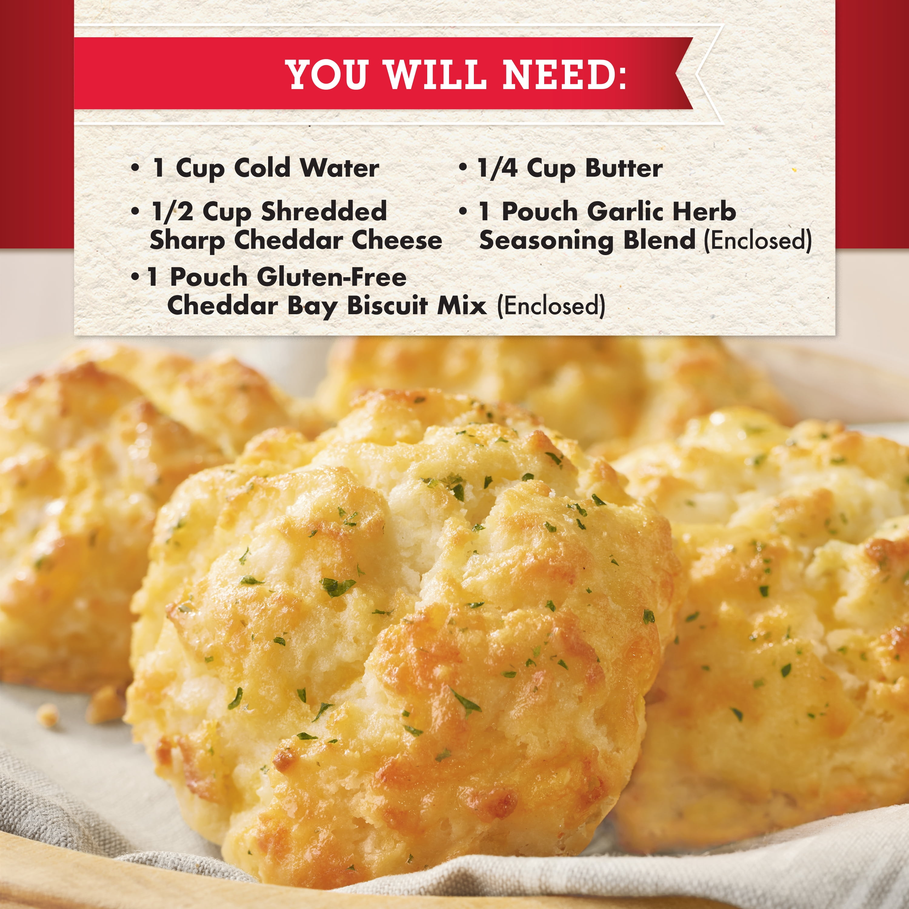 Red Lobster Gluten-Free Cheddar Bay Biscuits are a savory family favorite that comes straight from our kitchen to yours. They’re not only delicious, they’re incredibly easy to make and gluten-free! Simply add shredded cheddar and water to the mix and bake. Before serving, mix the contents of the enclosed herb pouch with melted butter and brush or spoon it on your freshly baked biscuits. Then sit back…and enjoy! This order includes one 11.36-ounce box.