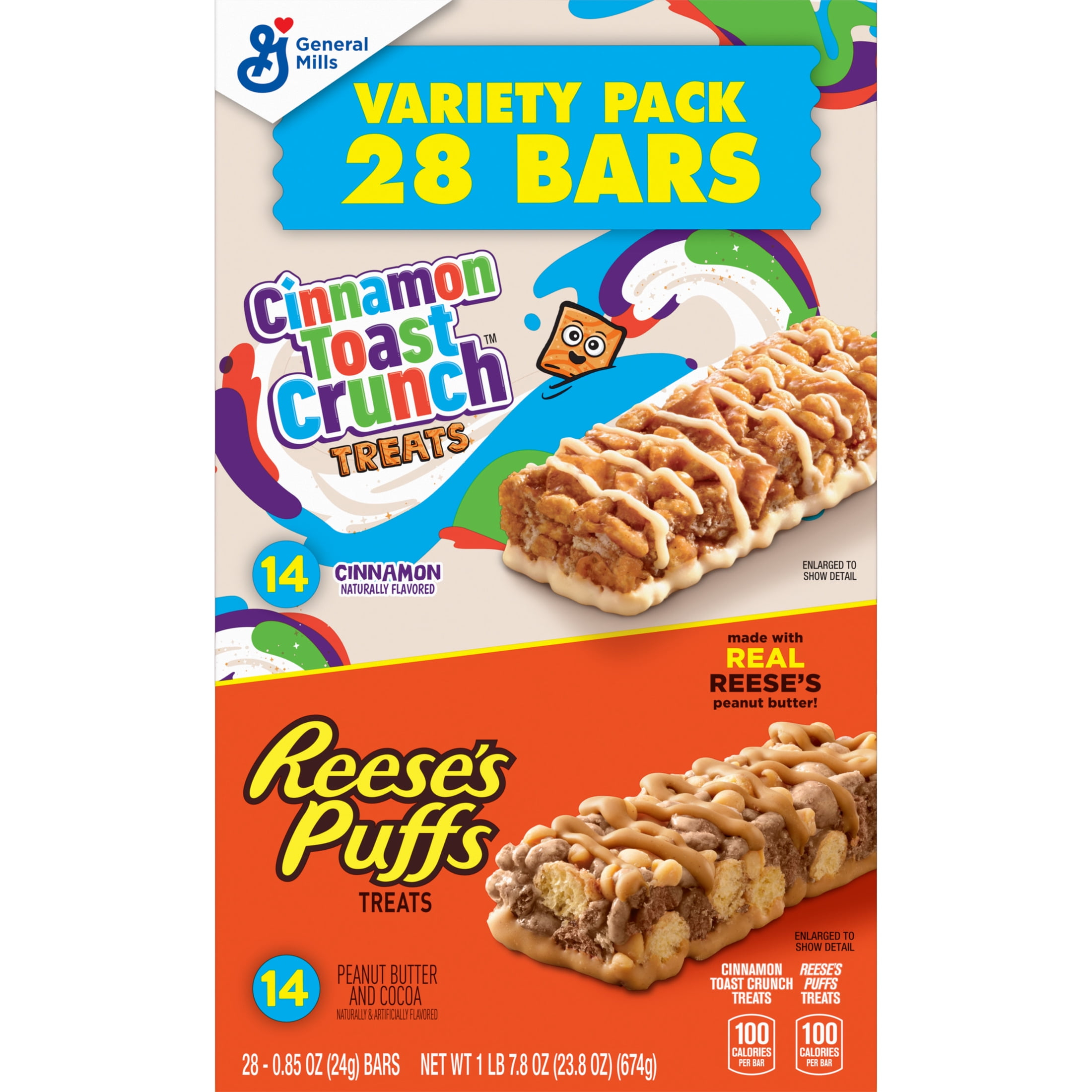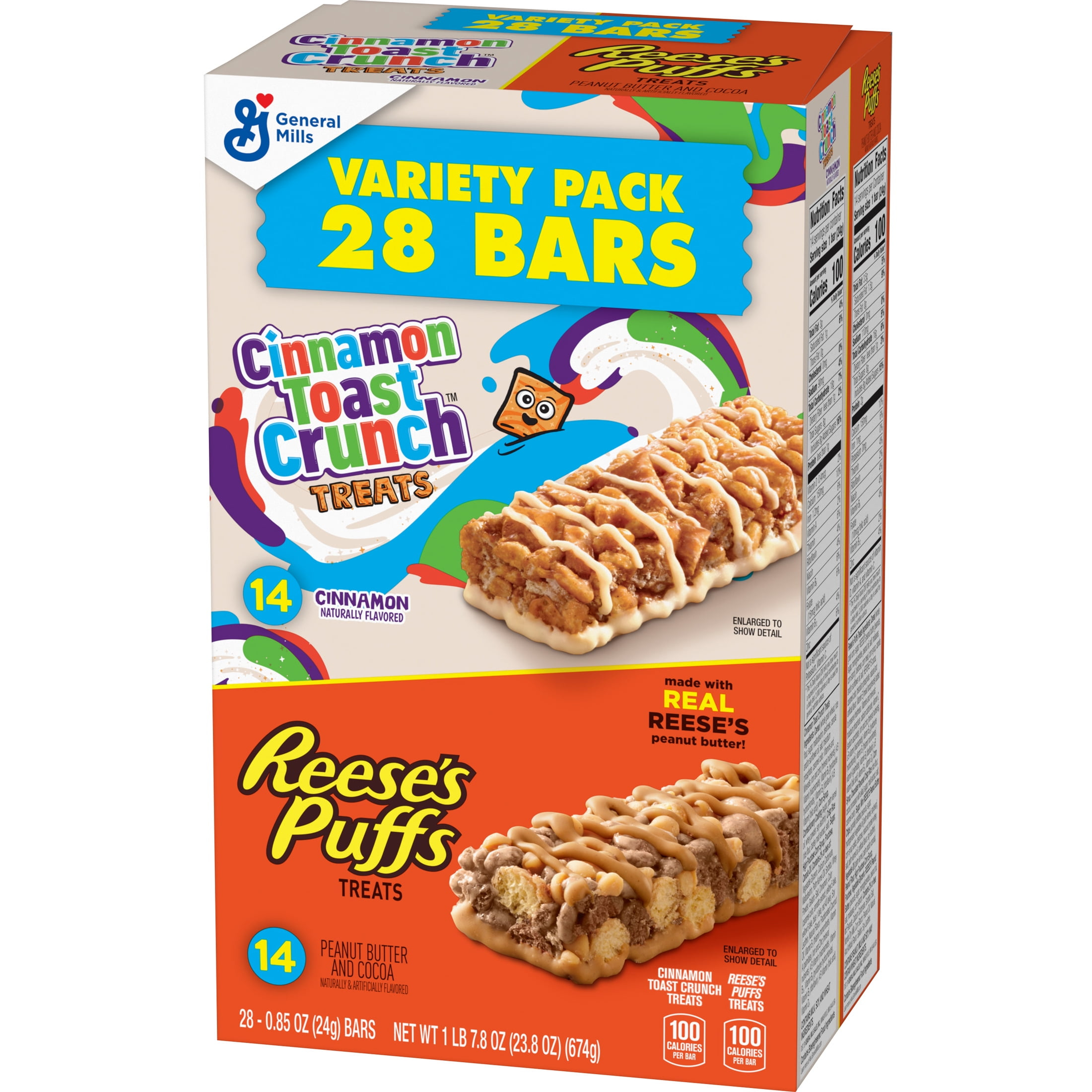 - VARIETY PACK: A portable snack perfect for the pantry, lunch box, and breakfast treat; Includes 14 Peanut Butter & Cocoa Reese’s Puffs bars and 14 Cinnamon Toast Crunch bars