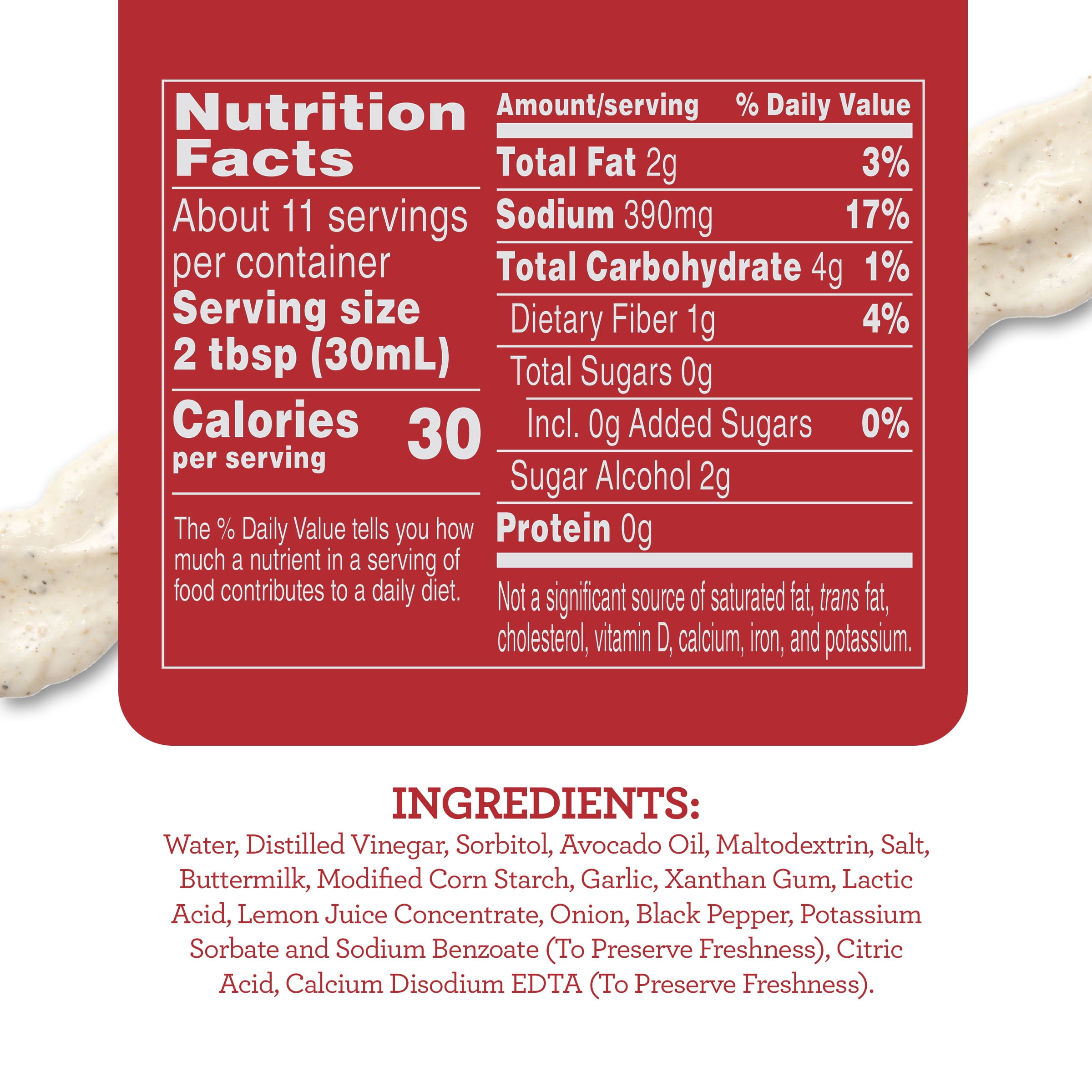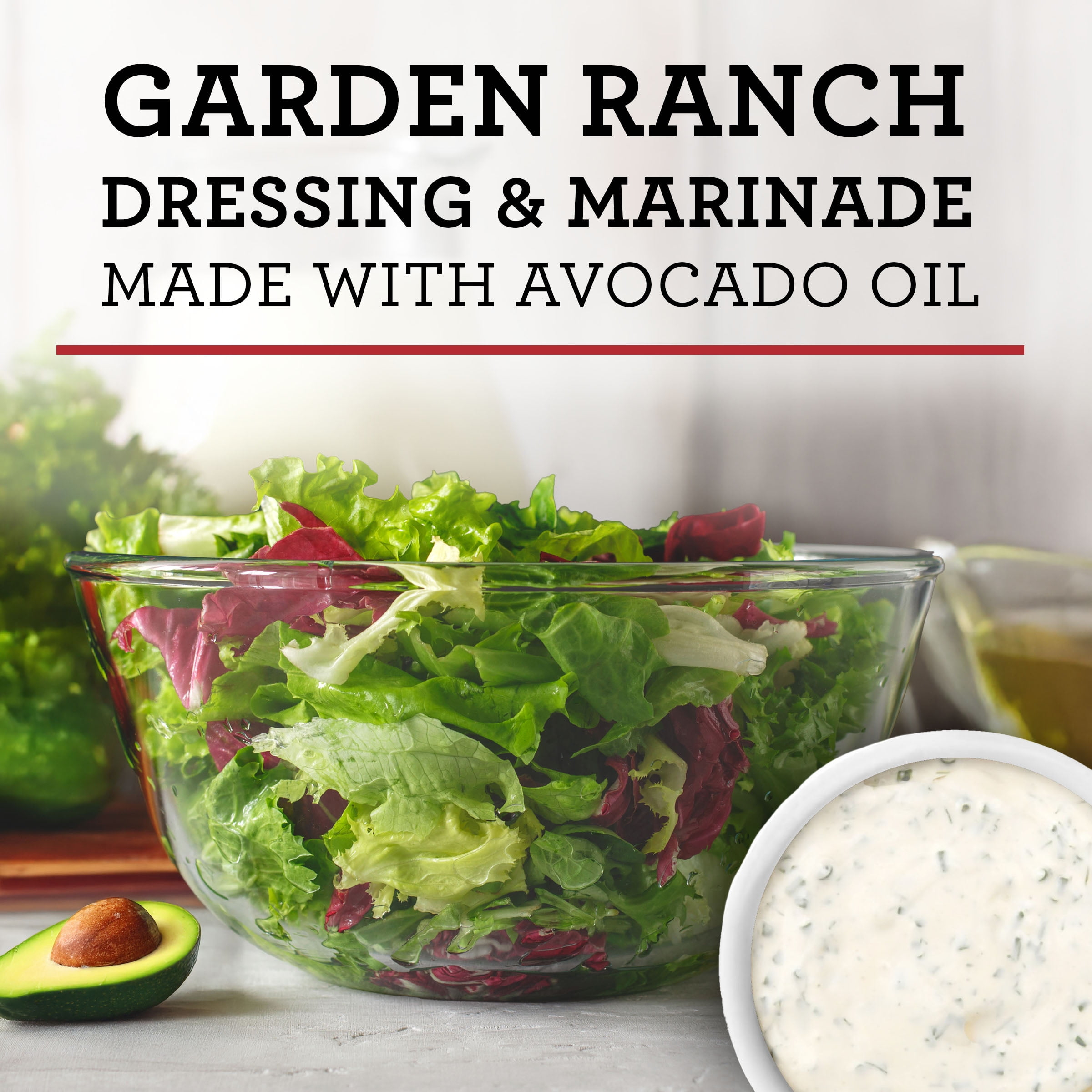 - A gluten free avocado oil-based ranch dressing packed with bold flavors and only 30kcal per serving—75% fewer than the leading brand’s with 120kcal