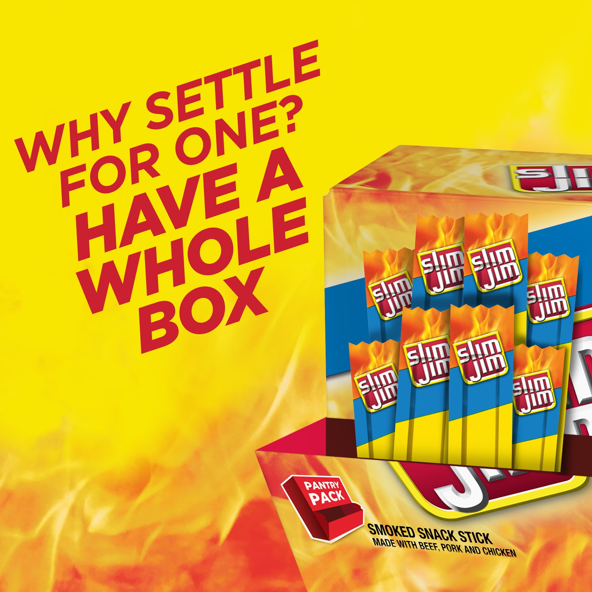 Experience intense, smoky flavor with delicious Slim Jim Mild Snack Size Sticks. Made with beef, pork and chicken, these meat sticks contain no artificial flavors or colors for full meaty flavor everyone can love. Each meat stick serving is loaded with 6 grams of protein, ideal for protein snacks that kick hunger to the curb and leave you feeling satisfied. These individually wrapped snacks go where you go and are perfect as travel snacks, school snacks or anywhere meat snacks. Slim Jim Mild Snack Size Sticks offer a bold and tasty way to take on the day. This box contains 46 individual snacks, so you are ready to hit back when savory cravings hit. Slim Jim keeps it interesting with a full line of beef sticks, snack sticks, pork rinds and jerky. Snap into a Slim Jim(R)!