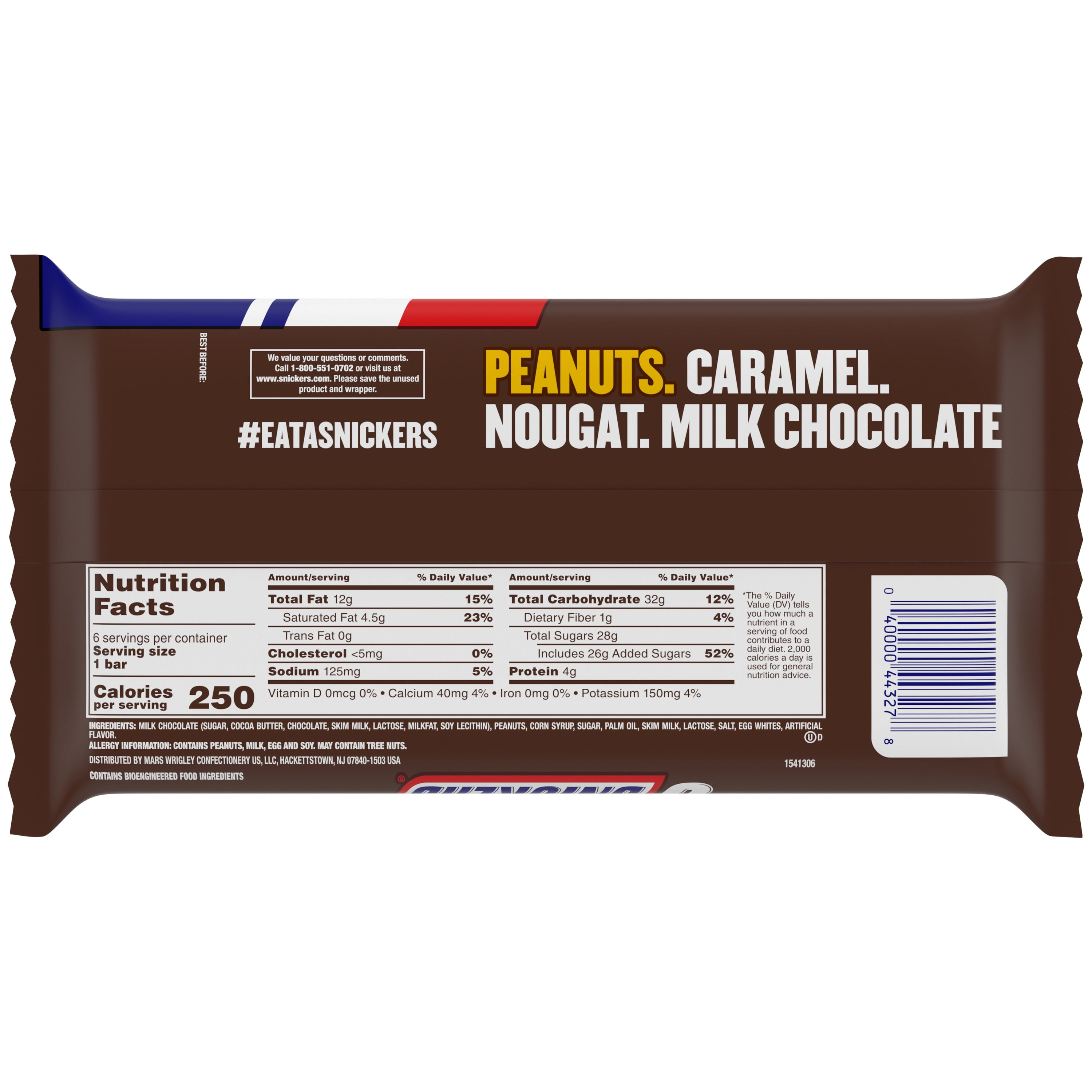 Packed full of peanuts, caramel and nougat cloaked in creamy milk chocolate, Snickers Full Size Candy Bars, 11.16 oz help satisfy hanger. Stock up on Full Size candy satisfaction with this six-count SNICKERS Full Size candy bar pack. Fill the pantry at home or in the office with peanut-packed chocolate candy treats. They’re great packed together with lunches, as a work time pick-me-up or simply enjoyed as a dessert. With six Full Size bars in each pack, you’ll have plenty to satisfy your sweet tooth and share with friends. Bulk candy is great to have on hand for holidays and small celebrations, craft gift bags and care packages full of SNICKERS candy bars. No matter how you enjoy bulk Full Size SNICKERS chocolate candy, they’re guaranteed to satisfy.