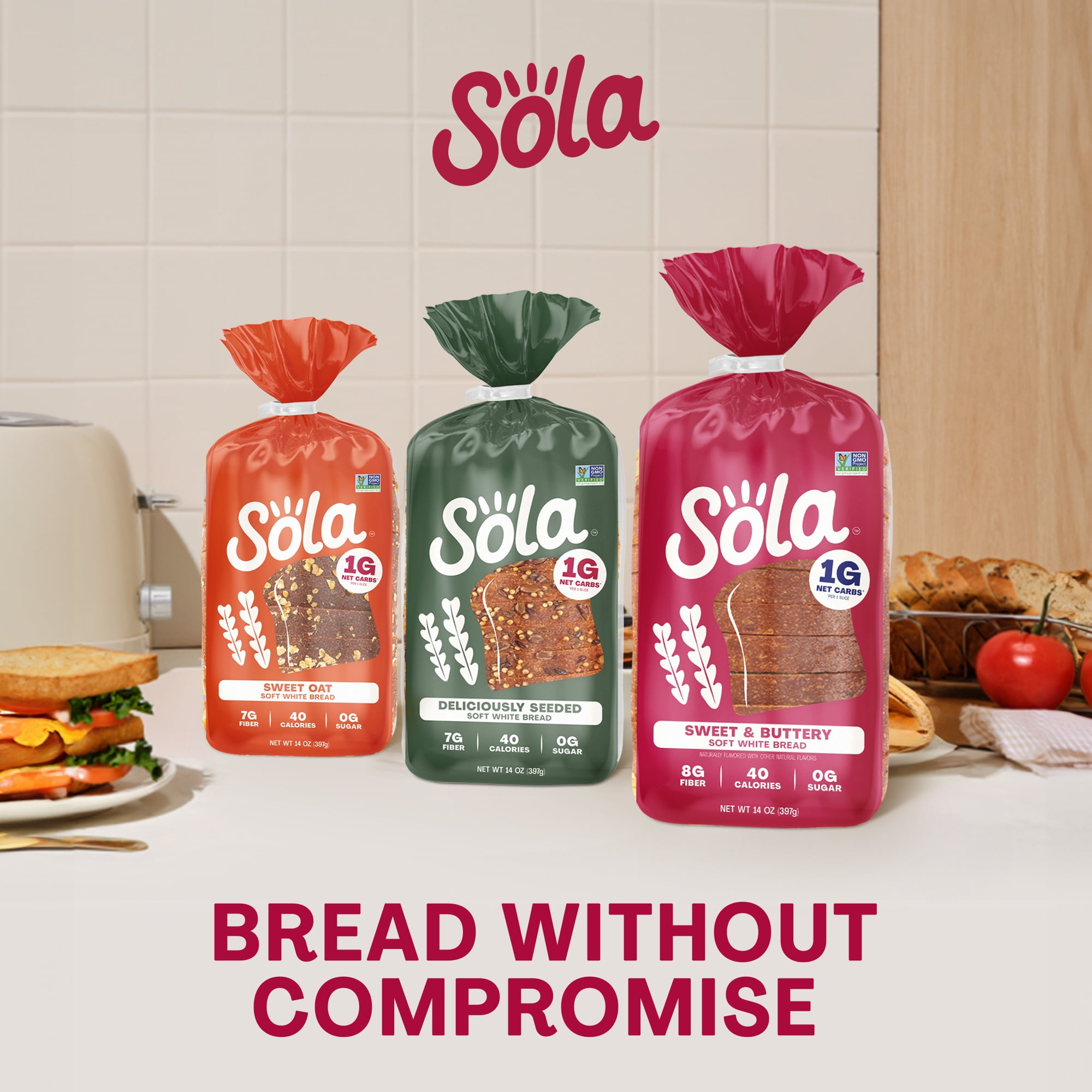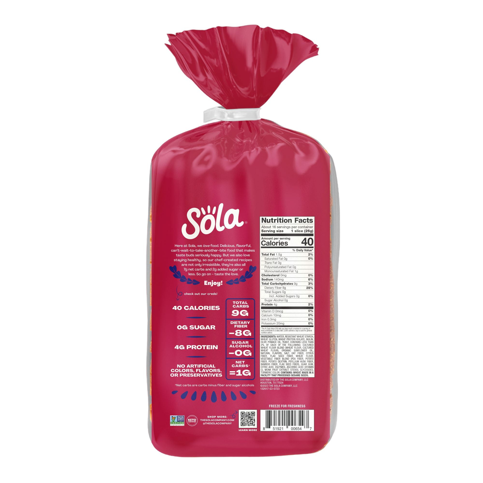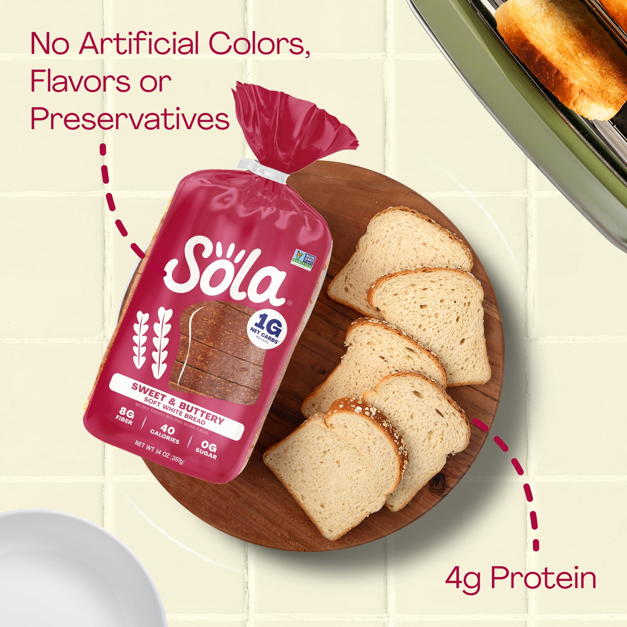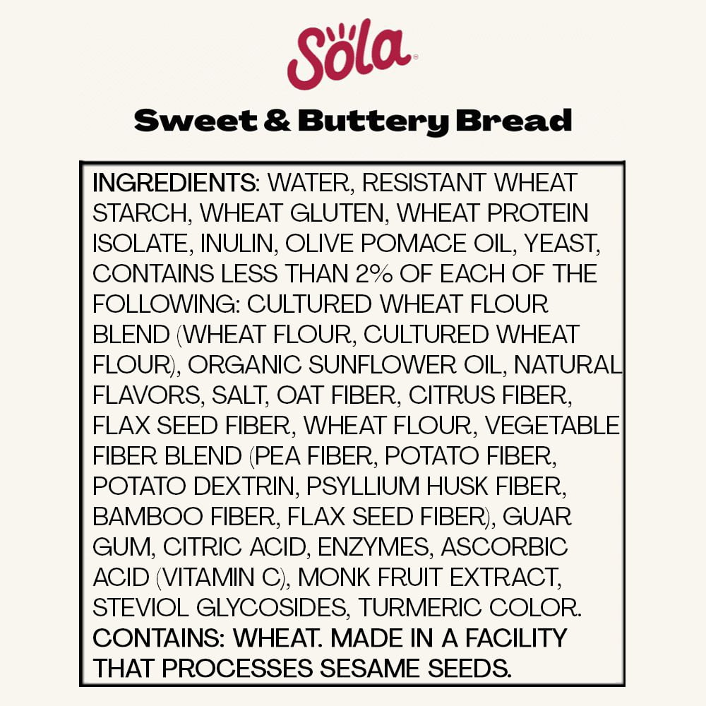 Help yourself to a slice of Sola Sweet & Buttery Bread to experience the perfect mix of slight saltiness with a hint of sweetness. Make every meal a moment to savor with high-quality non-GMO ingredients, no artificial colors, flavors or preservatives and zero grams of added sugars. Each slice checks all the boxes with 4 grams of protein, 1 gram of net carbs and 8 grams of dietary fiber. This delicious low-carb loaf is the smart choice for those who want the same great taste without the guilt. Sola Sweet & Buttery Bread is a yummy, delicious way to keep your carbs low and your satisfaction high. When it comes to low-carb breads, this decadent one hits the mark without sacrificing taste or texture. Embrace a healthier, tastier lifestyle with chef-crafted flavors that will make your tastebuds seriously happy. 14oz. loaf. Shelf-stable. Regular size slices.