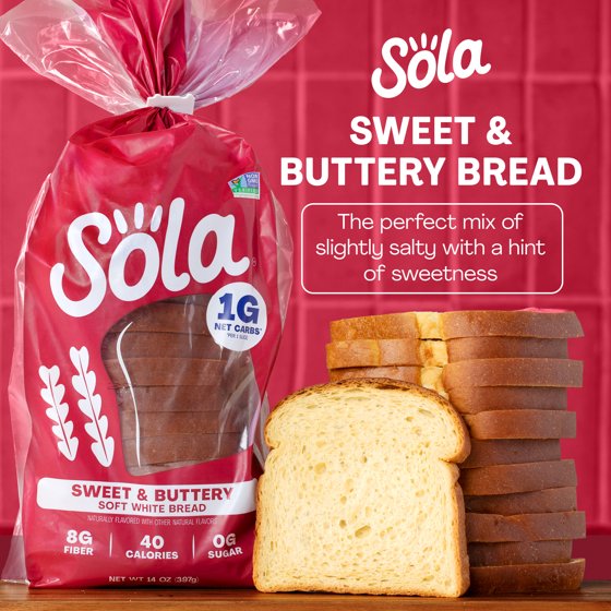 Help yourself to a slice of Sola Sweet & Buttery Bread to experience the perfect mix of slight saltiness with a hint of sweetness. Make every meal a moment to savor with high-quality non-GMO ingredients, no artificial colors, flavors or preservatives and zero grams of added sugars. Each slice checks all the boxes with 4 grams of protein, 1 gram of net carbs and 8 grams of dietary fiber. This delicious low-carb loaf is the smart choice for those who want the same great taste without the guilt. Sola Sweet & Buttery Bread is a yummy, delicious way to keep your carbs low and your satisfaction high. When it comes to low-carb breads, this decadent one hits the mark without sacrificing taste or texture. Embrace a healthier, tastier lifestyle with chef-crafted flavors that will make your tastebuds seriously happy. 14oz. loaf. Shelf-stable.