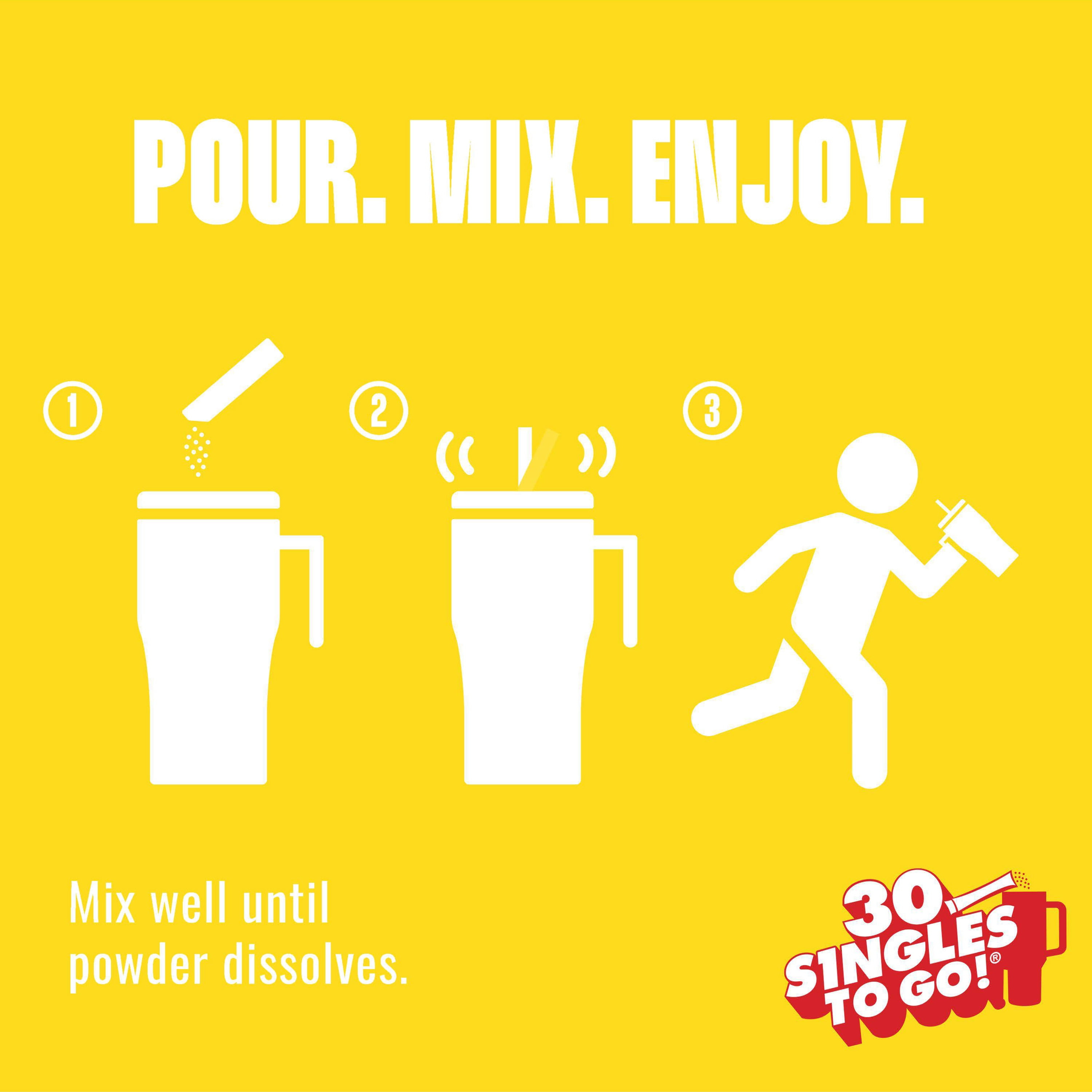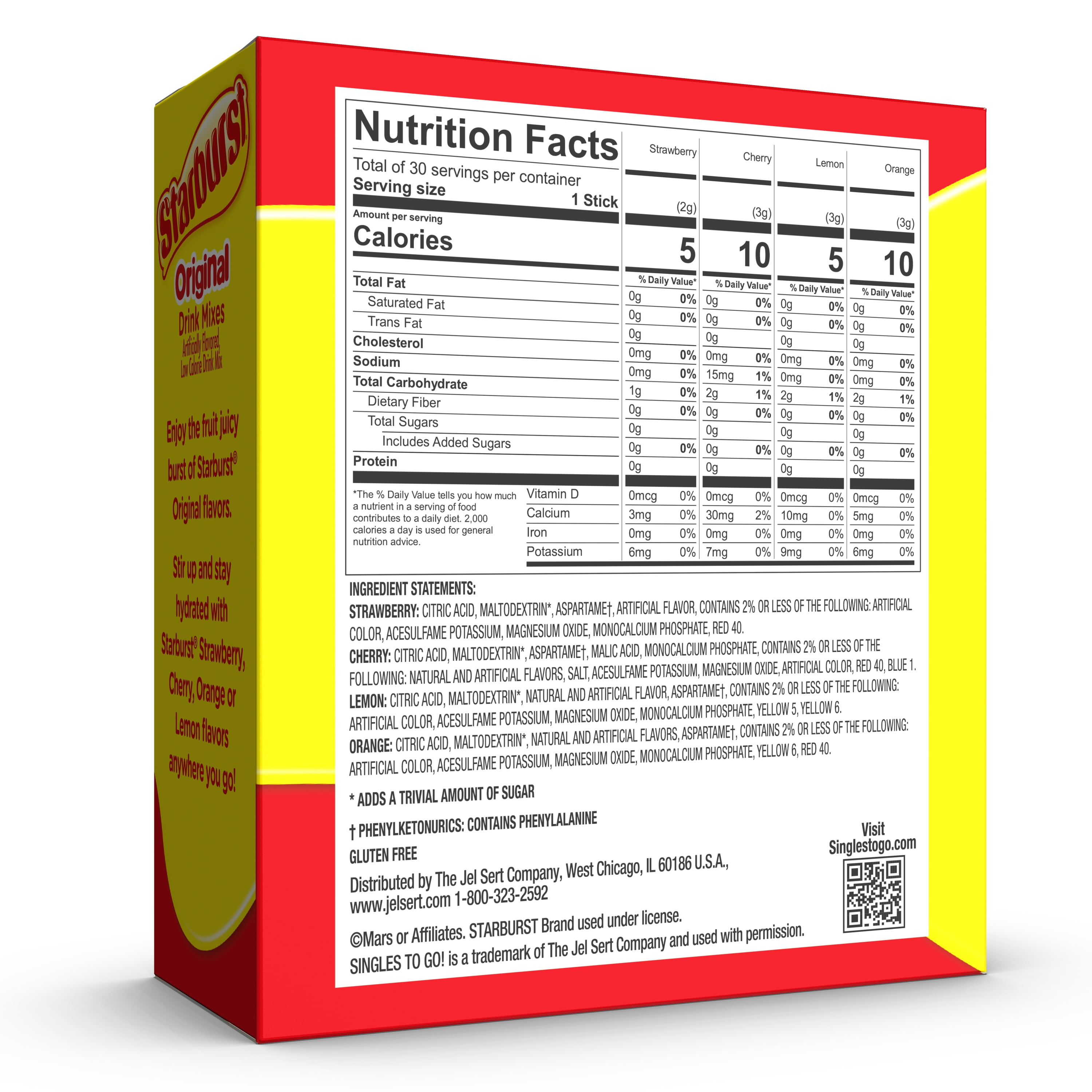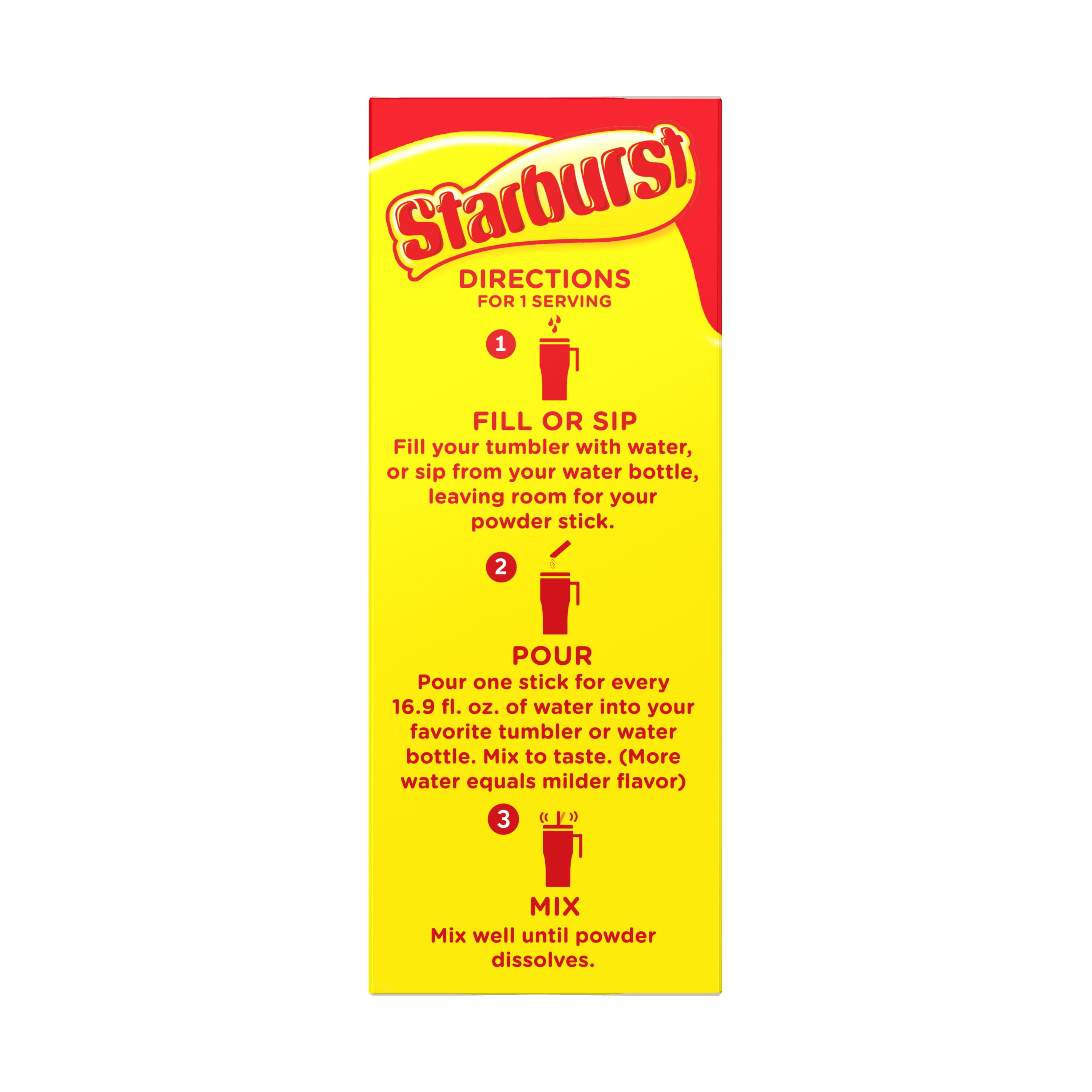 Bring the unexplainably juicy flavor with you everywhere you go! The Starburst Singles To Go powdered drink mixes are a quick and easy way to add exciting flavor to plain water. Each box contains 30 powdered drink mixes that are individually portioned and easy to take with you on the go. Whether in the car, on a plane, or sitting at work or school, the single stick convenience makes a great tasting drink anytime, anywhere. It’s easy to mix this low-calorie, zero sugar drink enhancer into your day. Simply take a sip from a full water bottle to make room for powder. Pour one stick into a 16. 9 fl. oz. bottle of water, shake until well mixed, and enjoy!