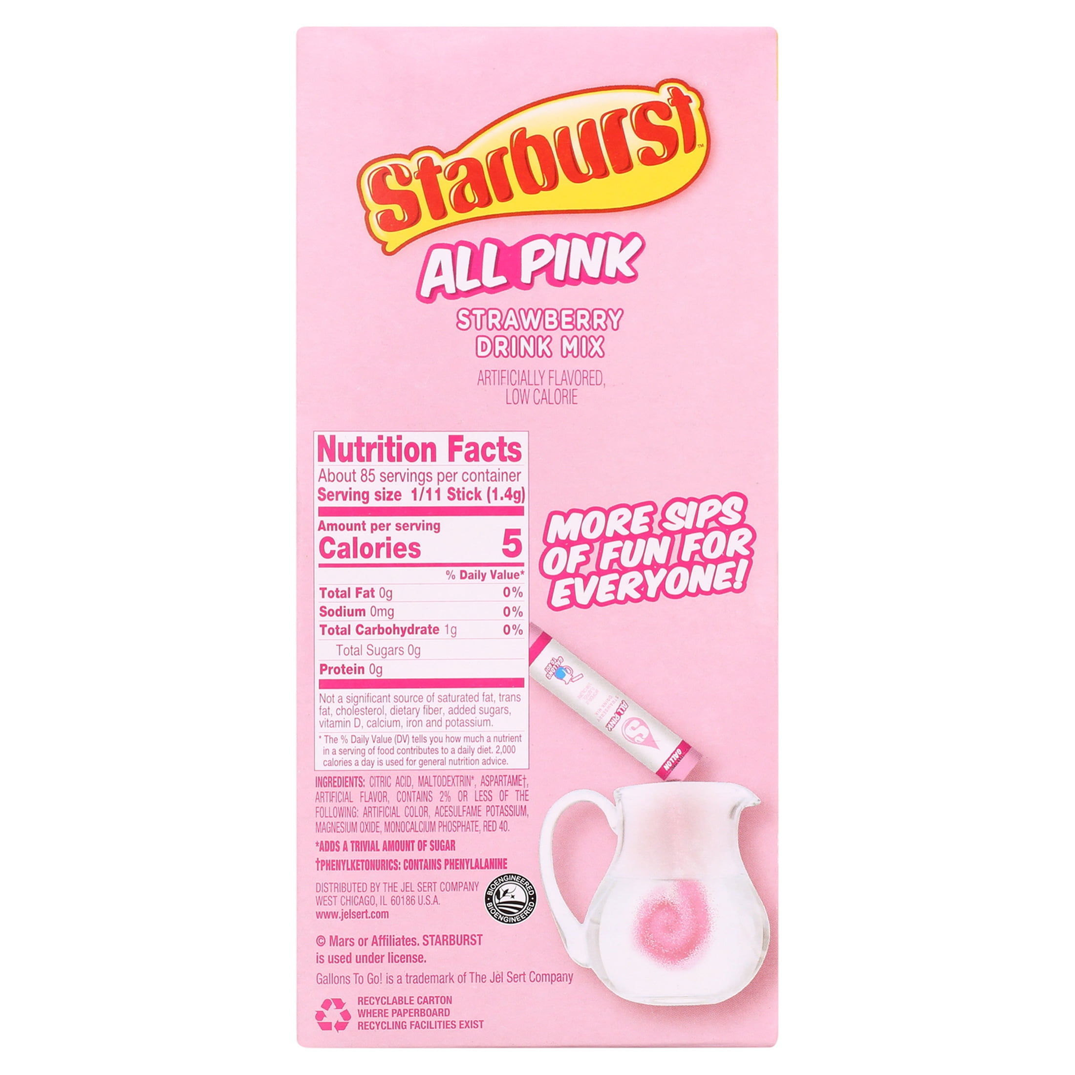 Starburst Drink Mix is a delicious treat for kids and adults alike. This pack includes eight individual packets, enough to make one gallon of flavored water each, in All-Pink Strawberry Starburst flavor. Starburst All-Pink Strawberry Drink Mix is sugar-free, caffeine-free, lactose-free, and fat-free, with only 5 calories per serving. Perfect for after-school snacks, pool days, or picnics, this flavored drink mix is easy to prepare and easy to sip on. Add to a pitcher of water, stir in the drink mix, and enjoy. The whole family will love Starburst Powdered Drink Mix!