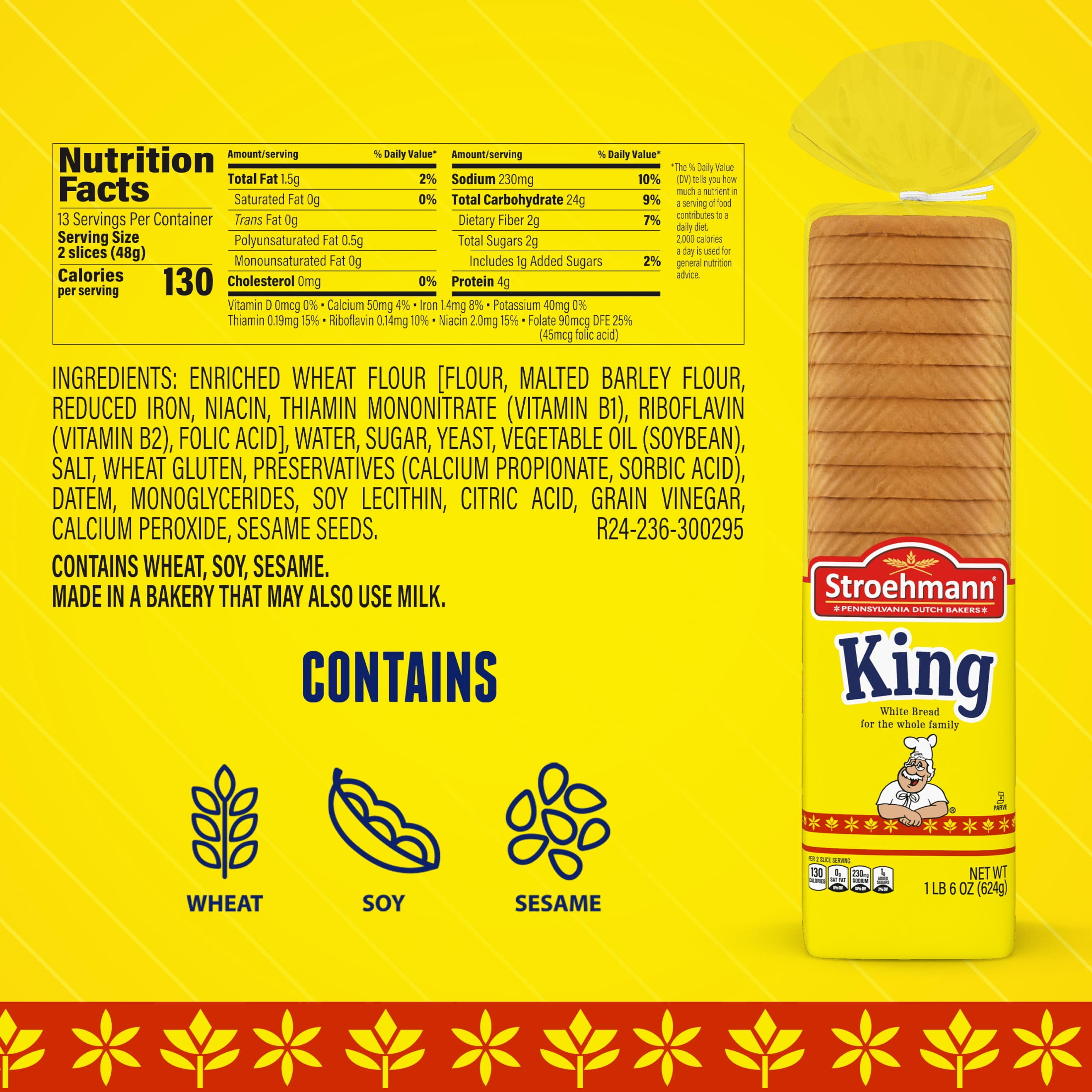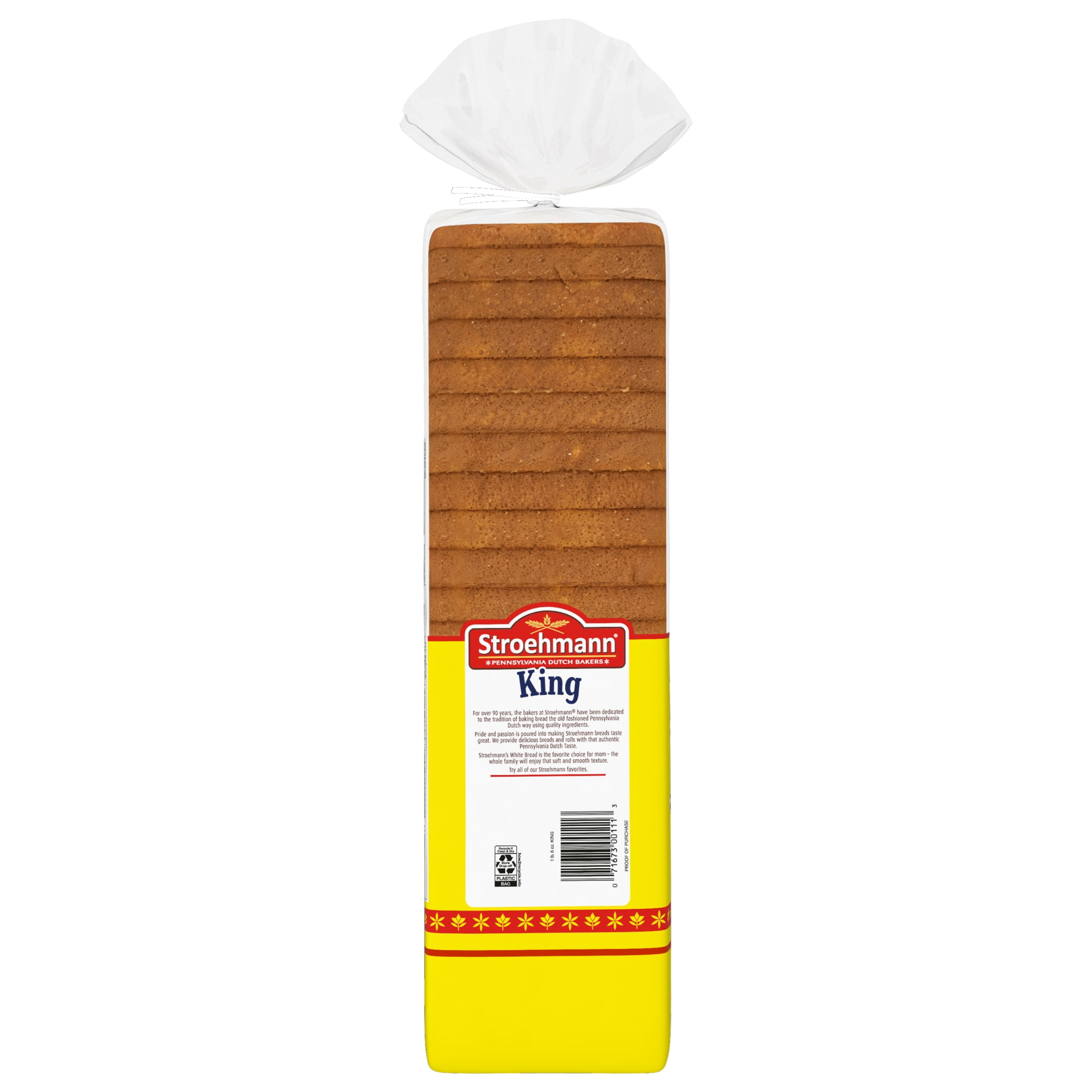 Stroehmann King White bread is an indulgent, satisfying Pennsylvania Dutch-style sandwich bread. This sliced bread features a rich, delicious homestyle taste with no high fructose corn syrup. This loaf of bread is perfect for sharing with friends and family. Stroehmann white bread provides a great foundation for savory egg salad sandwiches and other tasty meals whether you are at home, at work or need on the go snacks. This sandwich bread is also great for peanut butter and jelly or deli sandwiches as part of a school lunch. Whether you enjoy this sliced bread straight from the bag, toast it and top with butter or as part of another kitchen creation, Stroehmann Bread offers deliciousness from an expert name in bread. For Over 90 Years, the bakers at Stroehmann have been dedicated to the tradition of baking bread the old fashioned Pennsylvania Dutch way, using quality ingredients. Pride and passion is poured into making Stroehmann breads taste great. We provide delicious breads and rolls with that authentic Pennsylvania Dutch Taste. The whole family will enjoy the soft and smooth texture.
