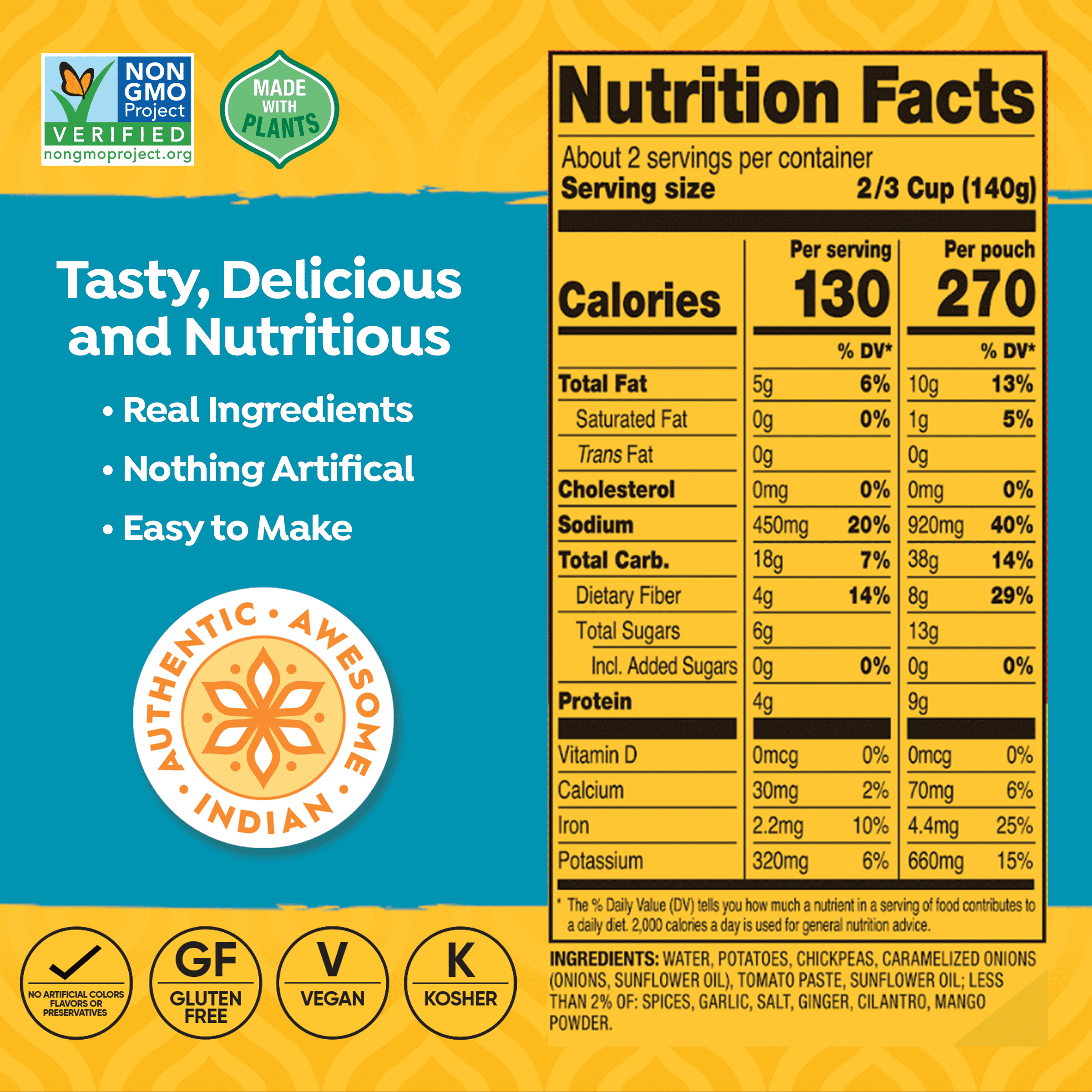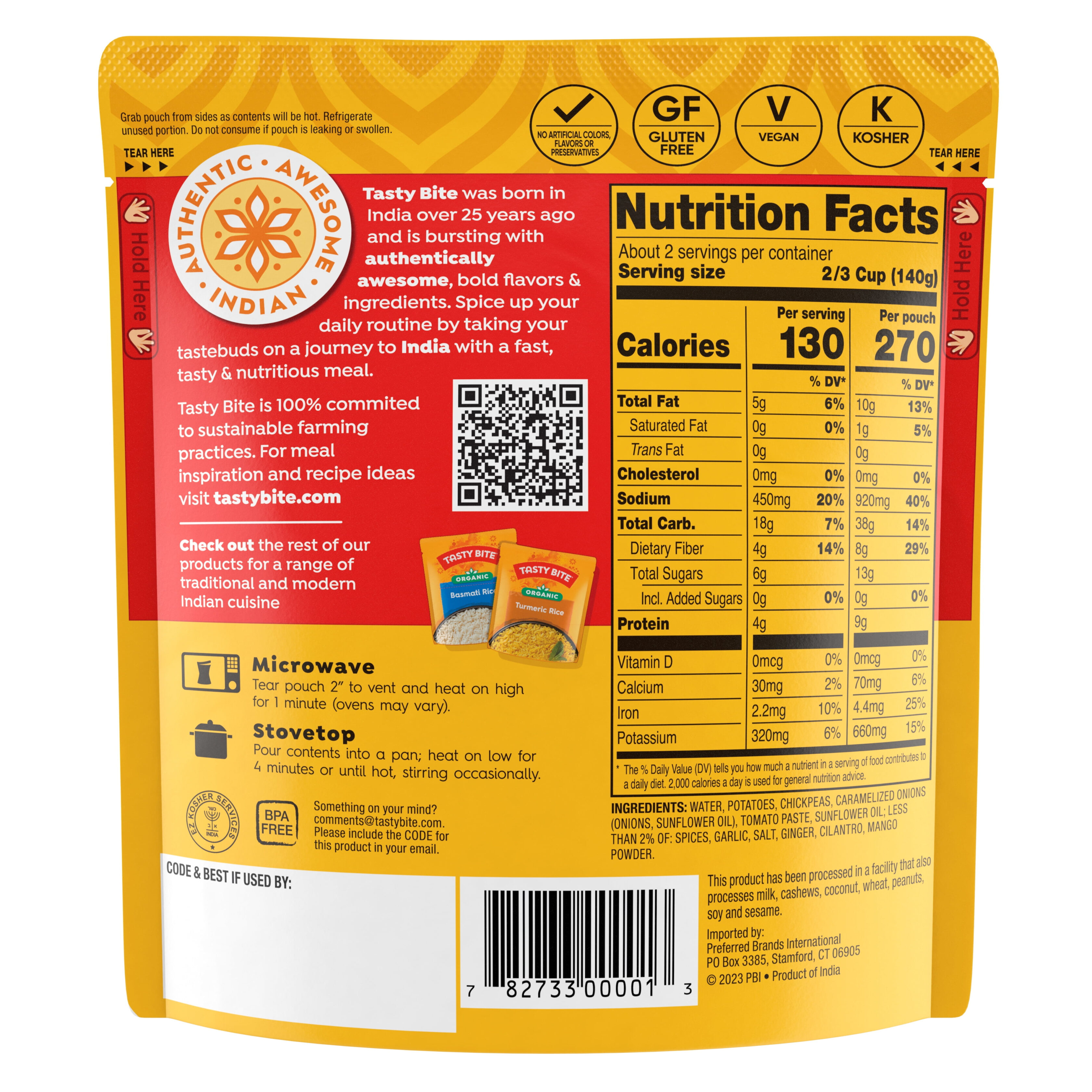 Tasty Bite Bombay Potatoes, Ready to Eat, Microwavable Pouch, Regular Size, Vegan, 10 oz. Who doesn’t love potatoes and chickpeas? Our Bombay Potatoes combine both in a robustly spiced sauce. We slow-cook potatoes and chickpeas with fresh tomatoes, onions, and spices for a soft delicious addition to any meal. All Natural/Organic/ Non GMO Project Verified Suitable for Special Diets: Vegetarian/Kosher/Gluten Free