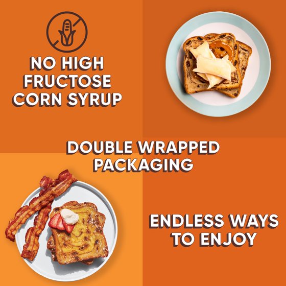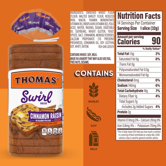 Begin your day with a whirlwind of flavor with Cinnamon Raisin Swirl Bread. This Cinnamon Raisin Swirl Bread is made with succulent swirls of cinnamon sweetness and plump raisins baked into delicious bread. You can feel good knowing that Thomas’ Cinnamon Raisin Bread is made with high-quality ingredients and without high fructose corn syrup. While it makes a great breakfast toast, Thomas’ Swirl Bread isn’t just a breakfast food anymore. This versatile breakfast bread is perfect toasted with butter and jam or fruit spread for an easy breakfast on busy weekdays or can be transformed into a brunch-worthy French toast with berries and whipped cream. The sweetness of Thomas’ Cinnamon Raisin toast also beautifully complements the savory contents of Monte Cristo sandwiches and also makes for a tasty on the go snack. Start your day the right way with swirl bread from the breakfast food brand with more than 140 years of experience, beginning with the original Nooks and Crannies English muffins. Thomas’ delivers delicious tastes for a breakfast like no other. This item is Shelf Stable. Size Description: Regular.