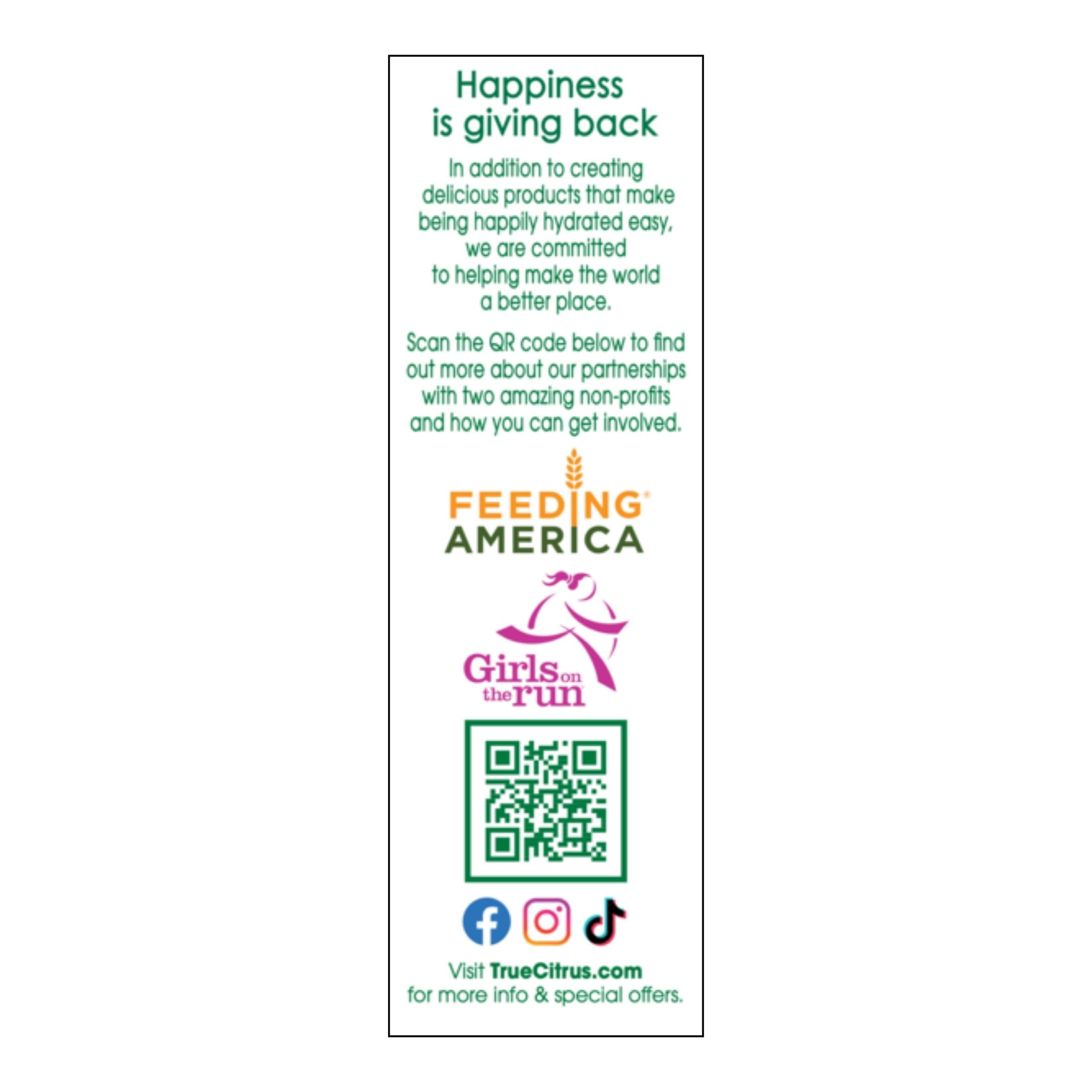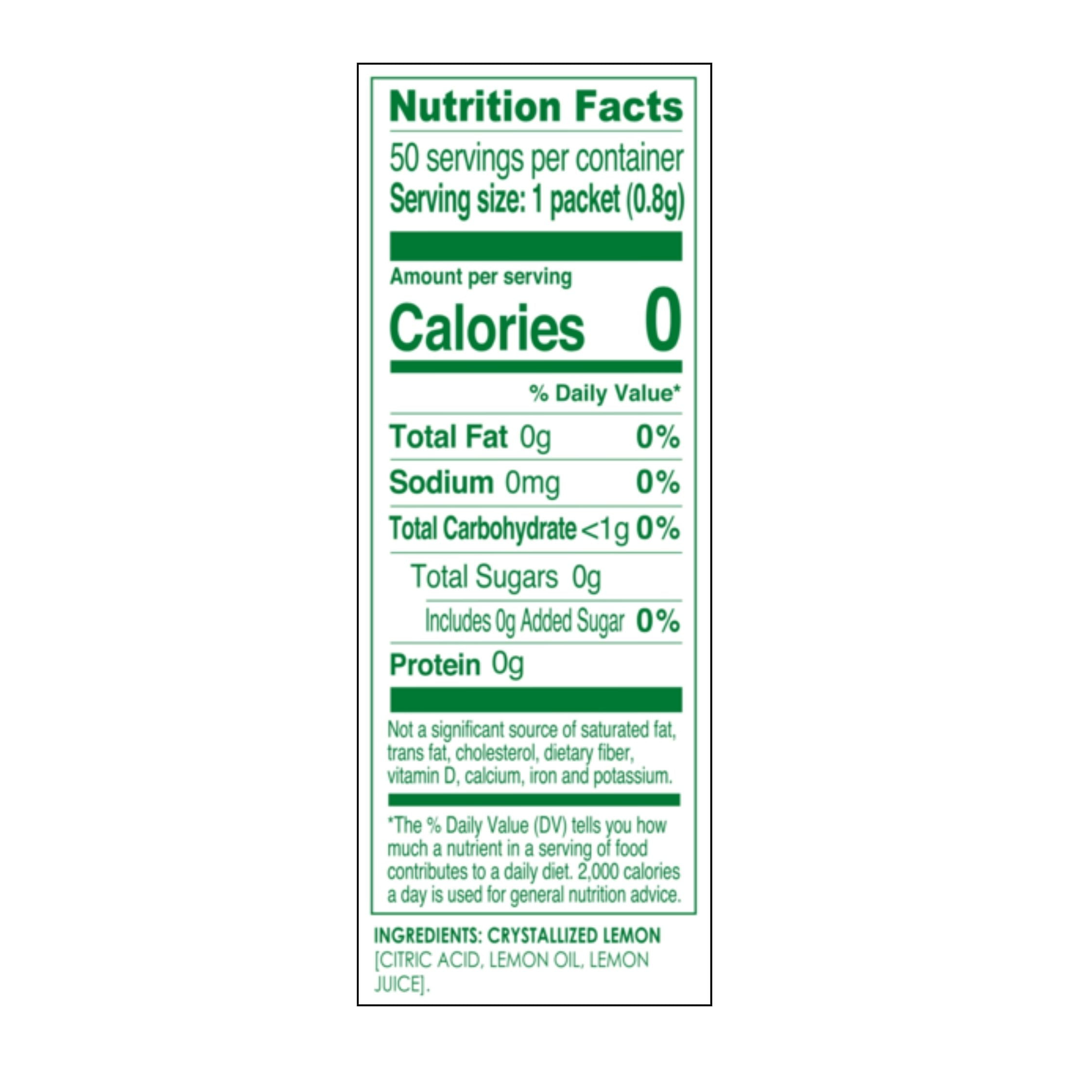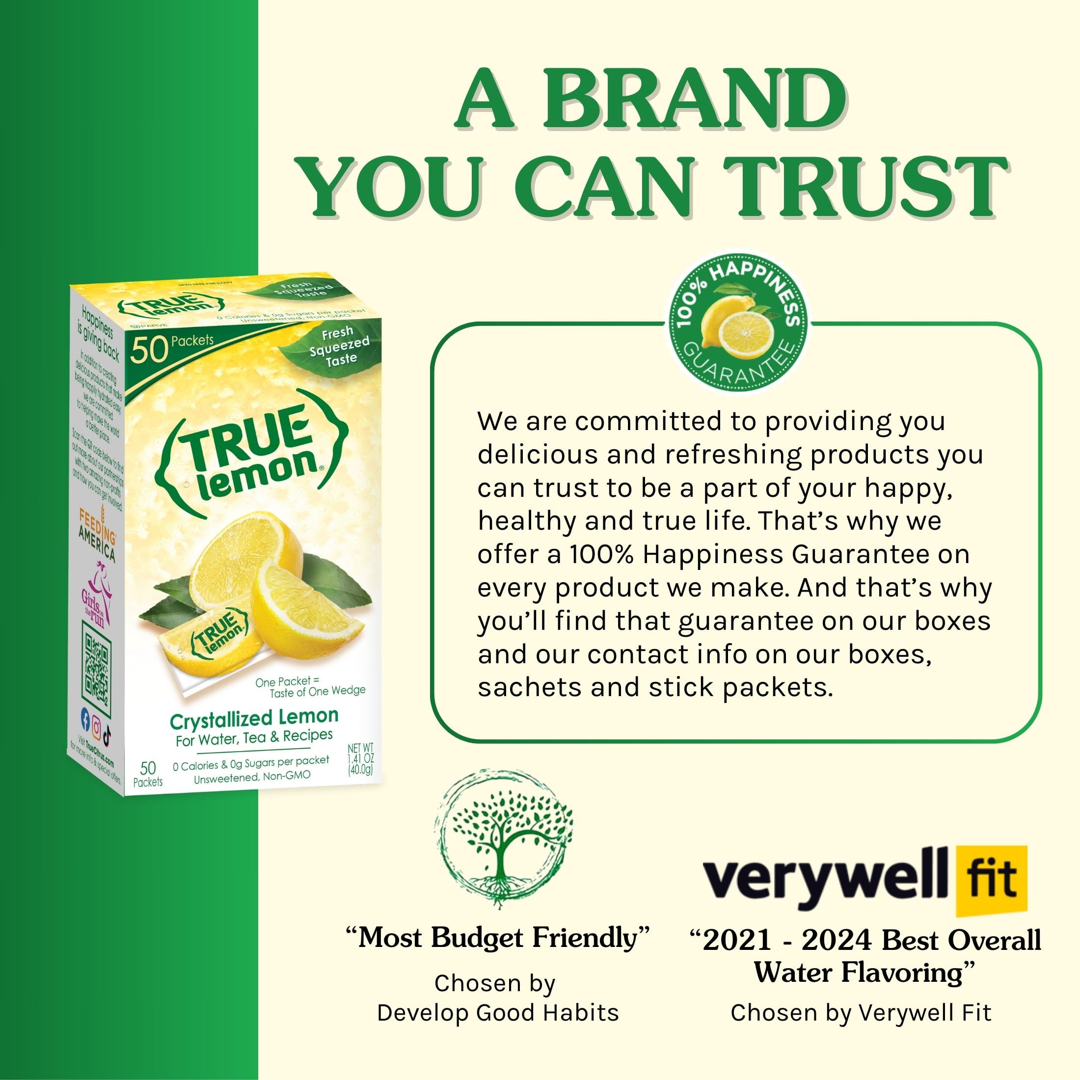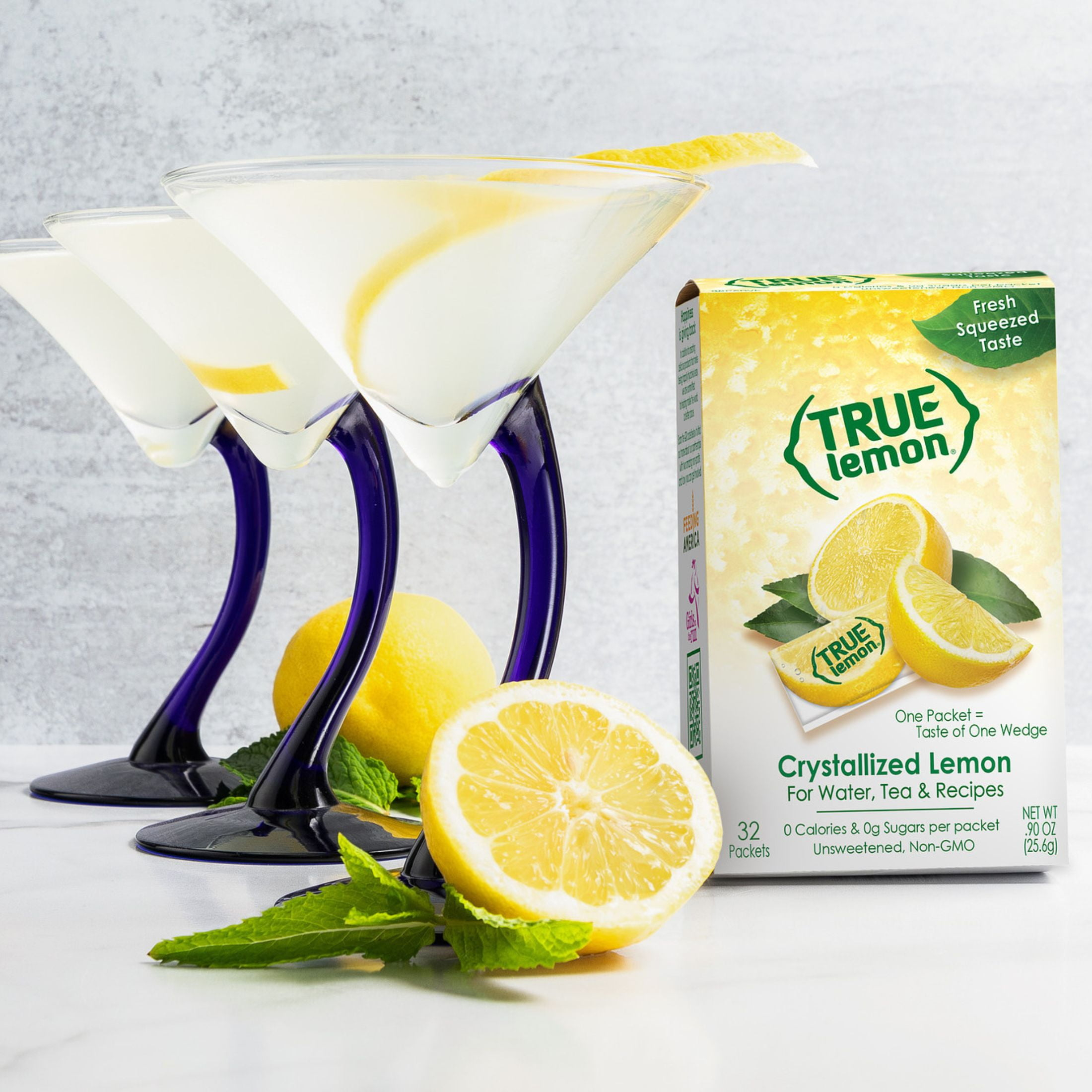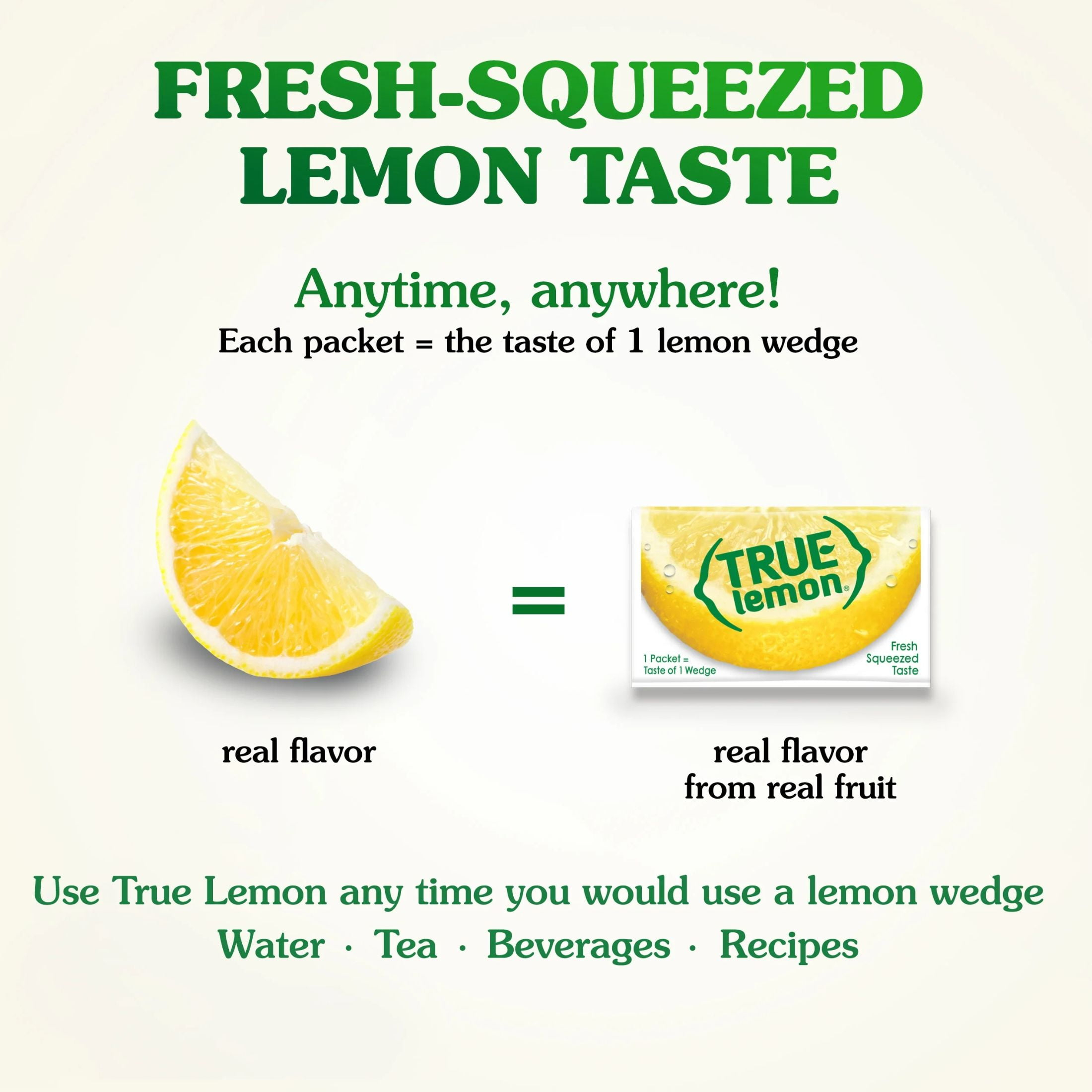 Enjoy real fresh-squeezed lemon taste, any time, anywhere! True Lemon crystallized lemon packets provide authentic, consistent, fresh-squeezed real lemon flavor in shelf stable, convenient packets. Made from simple, Non-GMO ingredients including real lemon juice and oils, True Lemon is unsweetened, sugar free and has zero calories. Use True Lemon as a zero calorie water enhancer or to add a burst of refreshing lemon flavor to hot and iced teas, seltzer water, sparkling water, sodas, sugar free sodas and drinks. You can also use True Lemon as a salt substitute since it is sodium free or to replace lemon juice in recipes and a seasoning. 1 packet = the taste of 1 lemon wedge. And, bonus, your purchase of this product helps us support two amazing national non-profits, Feeding America® and Girls On the Run®!
