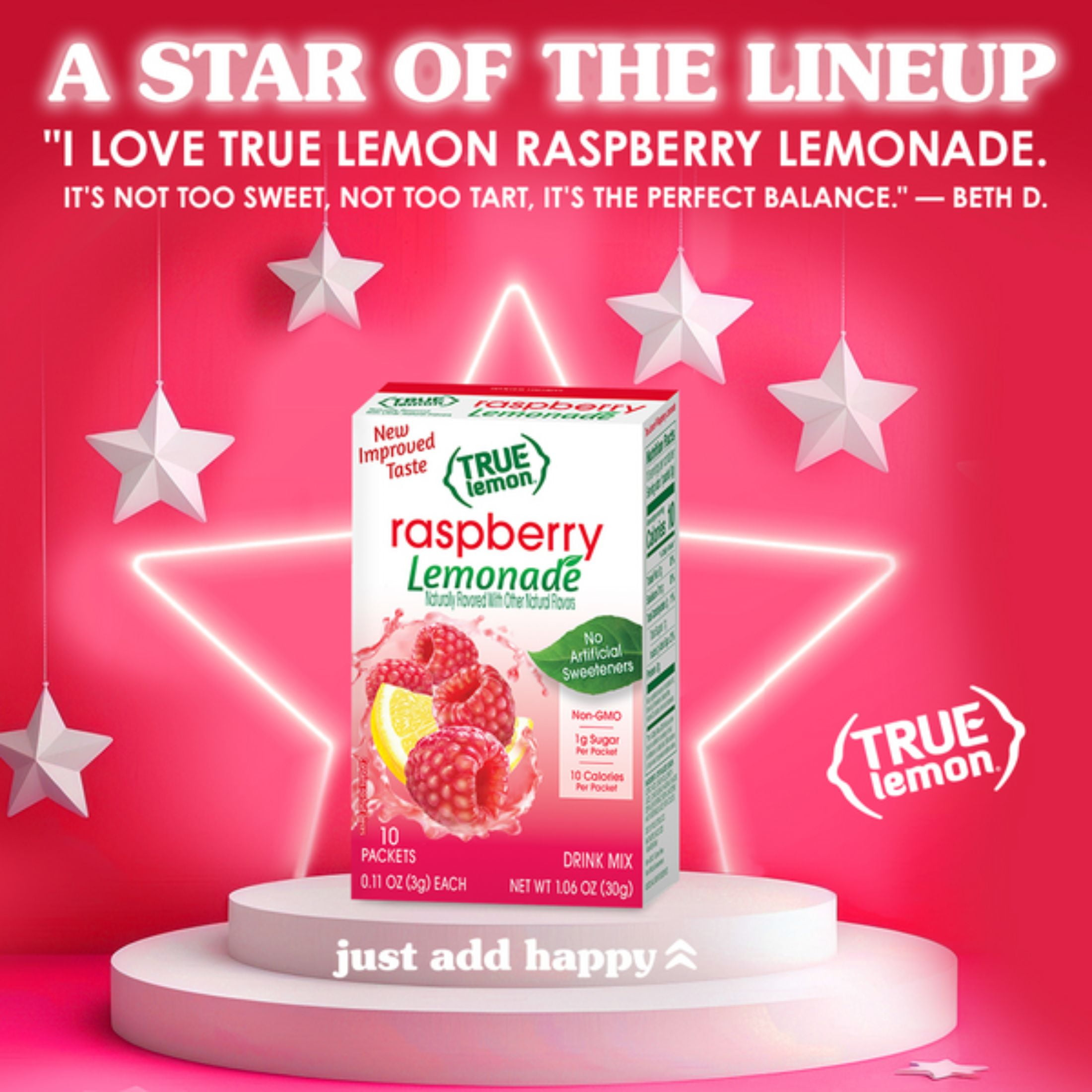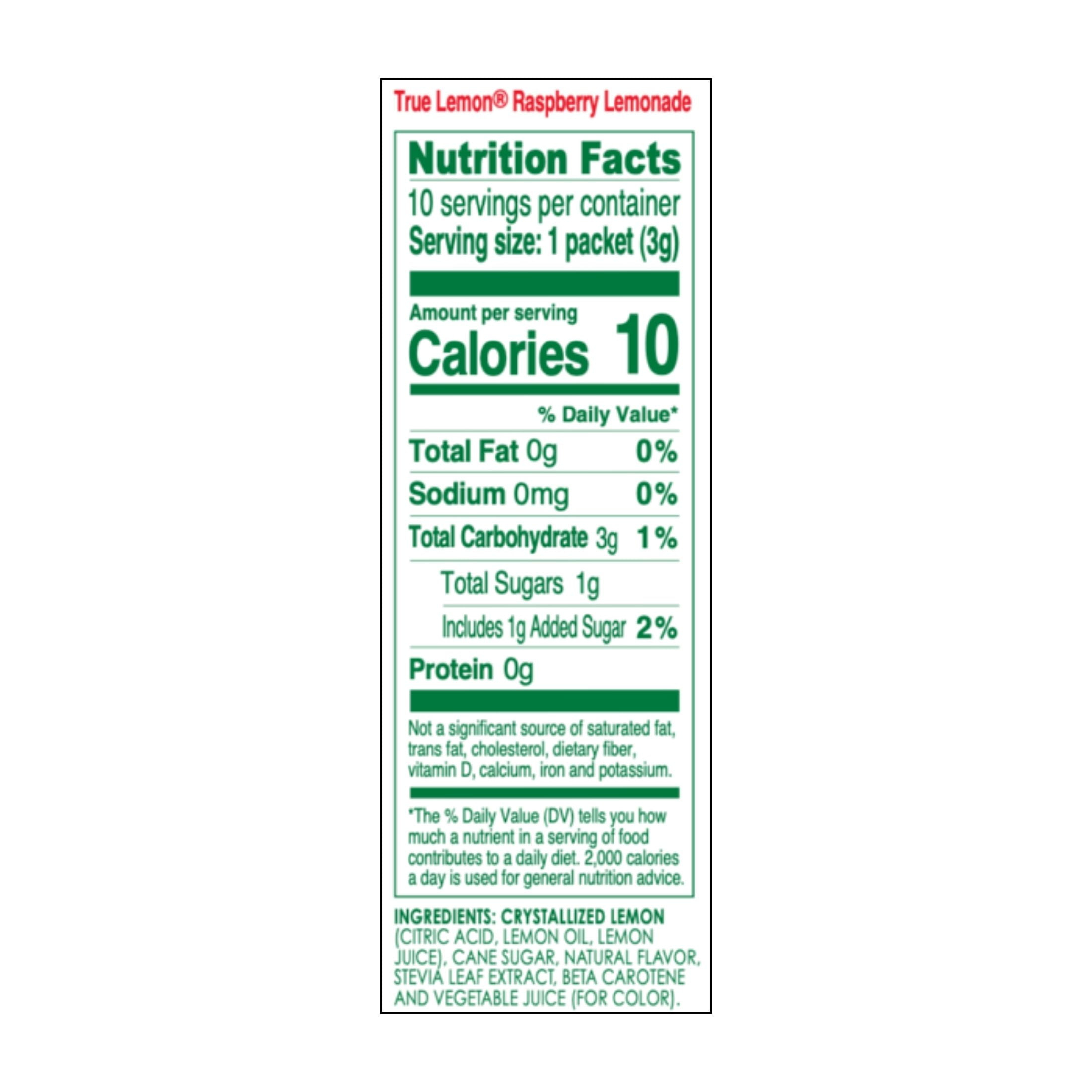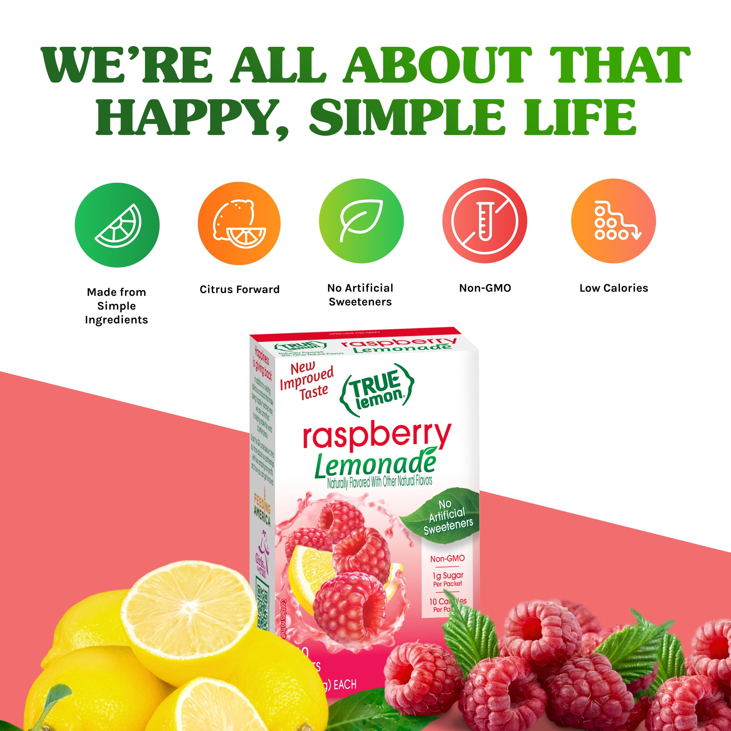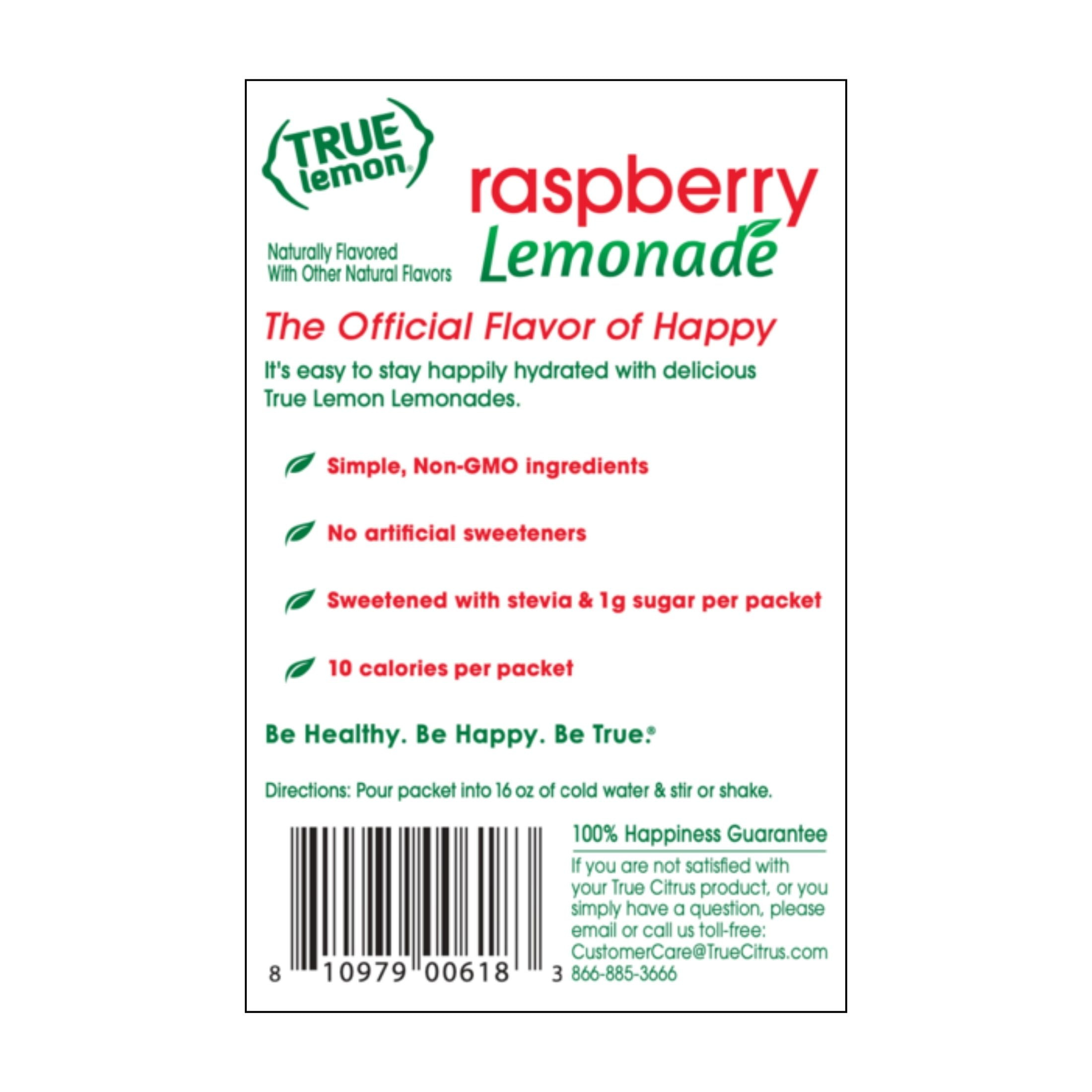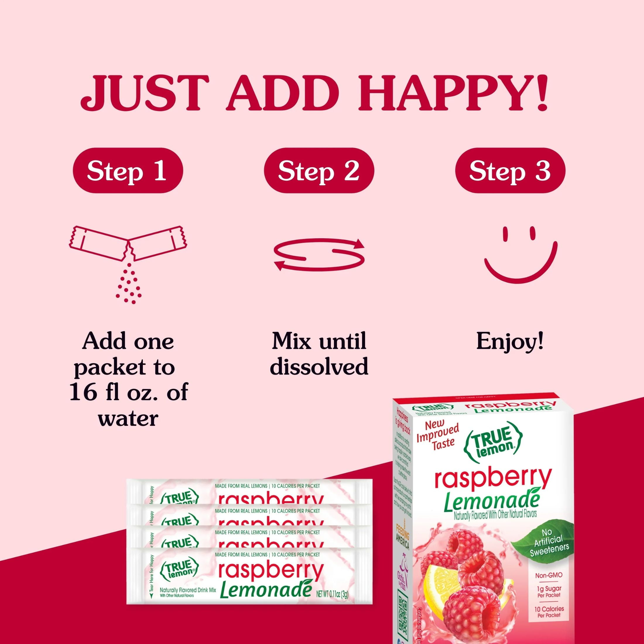 Stay happily hydrated throughout your day! True Lemon Raspberry Lemonade is a powdered drink mix made with simple, Non-GMO ingredients including real lemon juice and oils. Each drink mix packet offers a delicious way to enhance your water with only 10 calories and 1g sugar per water flavoring packet. With NO artificial sweeteners, True Lemon Raspberry Lemonade is sweetened only with natural stevia and a touch of sugar, and is caffeine free, sodium free and gluten free. It’s easy to stay happily hydrated throughout your day with True Lemon Raspberry Lemonade drink mix packets. As a bonus, your purchase of this product helps us support two amazing national non-profits, Feeding America® and Girls On the Run®!