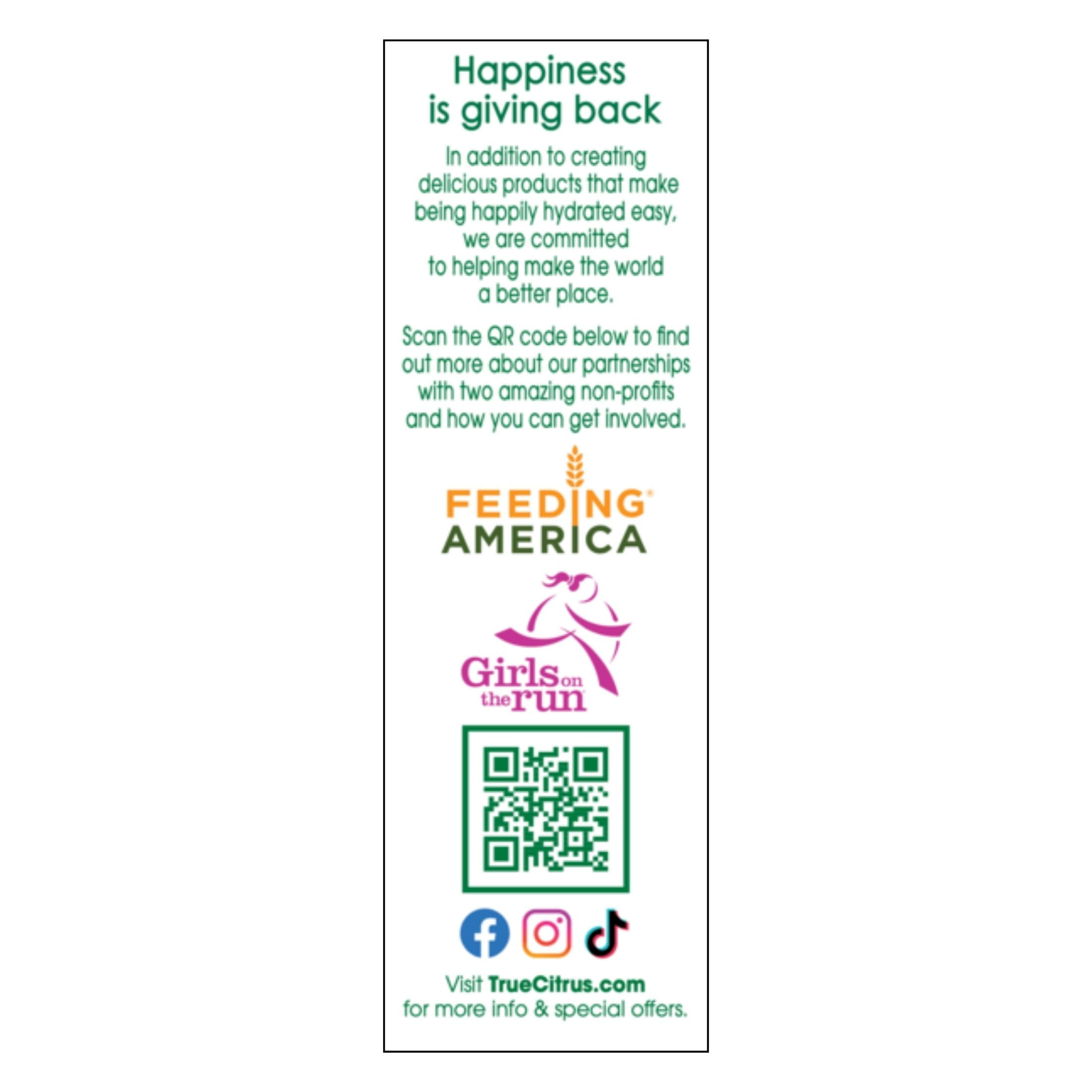 Stay happily hydrated throughout your day! True Lime Watermelon Limeade is a powdered drink mix made with simple, Non-GMO ingredients including real lime juice and oils. Each drink mix packet offers a delicious way to enhance your water with only 10 calories and 1g sugar per water flavoring packet. With NO artificial sweeteners, True Lime Watermelon Limeade is sweetened only with natural stevia and a touch of sugar, and is caffeine free, sodium free and gluten free. It’s easy to stay happily hydrated throughout your day with True Lime Watermelon Limeade drink mix packets. And, bonus, your purchase of this product helps us support two amazing national non-profits, Feeding America® and Girls On the Run®!