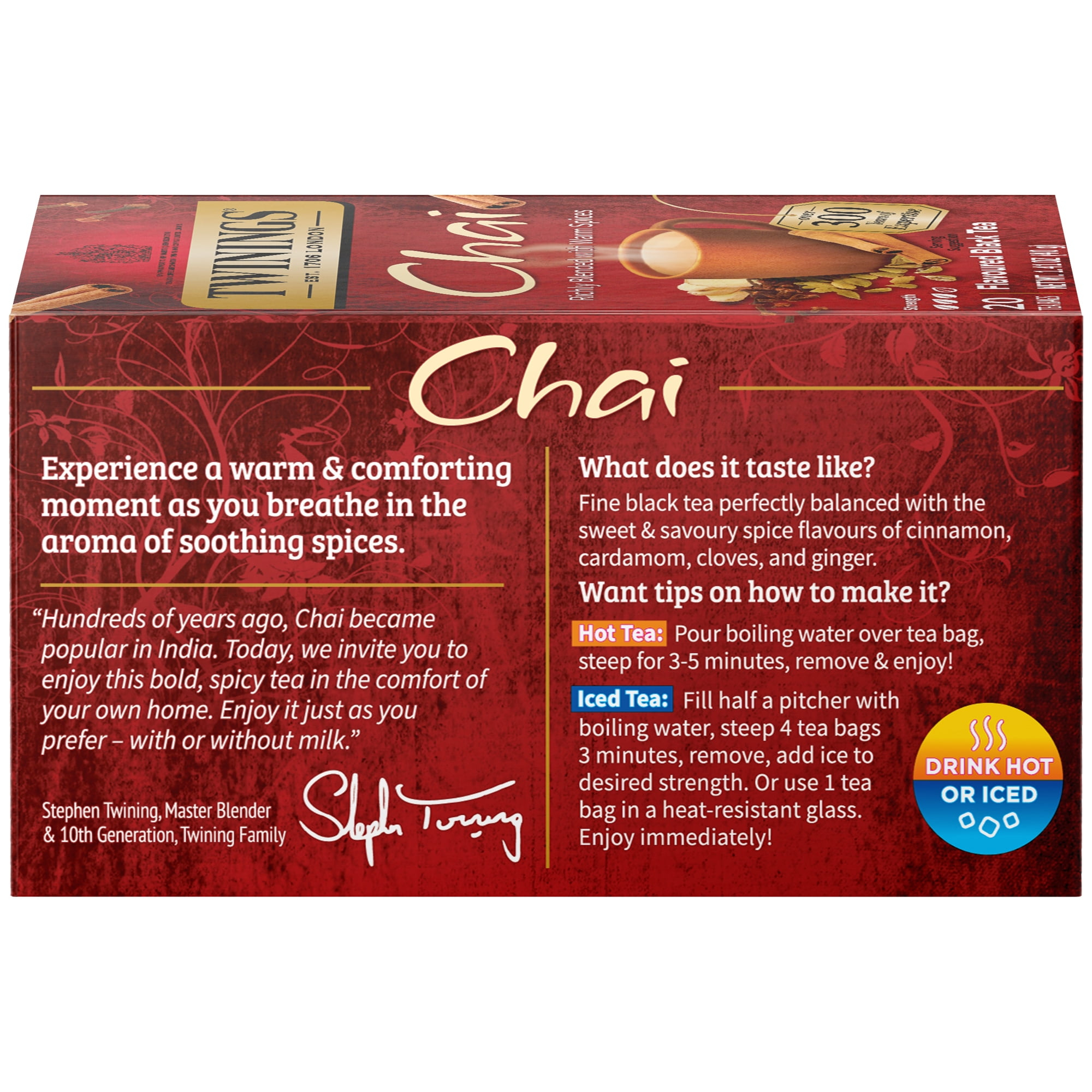 Twinings 20 Individually Wrapped Tea Bags, Sweet and Spicy Chai Spiced Black Tea Blend with Cinnamon, Cardamom, Clove, and Ginger Flavours, Caffeinated This chai black tea blend features the finest black tea with the sweet and the savoury spice flavours of cinnamon, cardamom, cloves and ginger to deliver a flavourful tea with a warm, soothing aroma and fresh, spicy taste. To brew the perfect cup steep one bag for 5 minutes in boiling water. At Twinings, we believe in living well and enjoying life. Backed by generations of trusted knowledge and ethical integrity, our Master Blenders are committed to delivering nature’s goodness and ensuring consistent taste and quality by sourcing the world’s finest herbs, fruits, and teas. From traditional teas to functional blends, Twinings encourages consumers to “Drink in Life” by celebrating the small steps that make wellbeing attainable and remain committed to an optimistic life that is well-lived, one sip at a time.