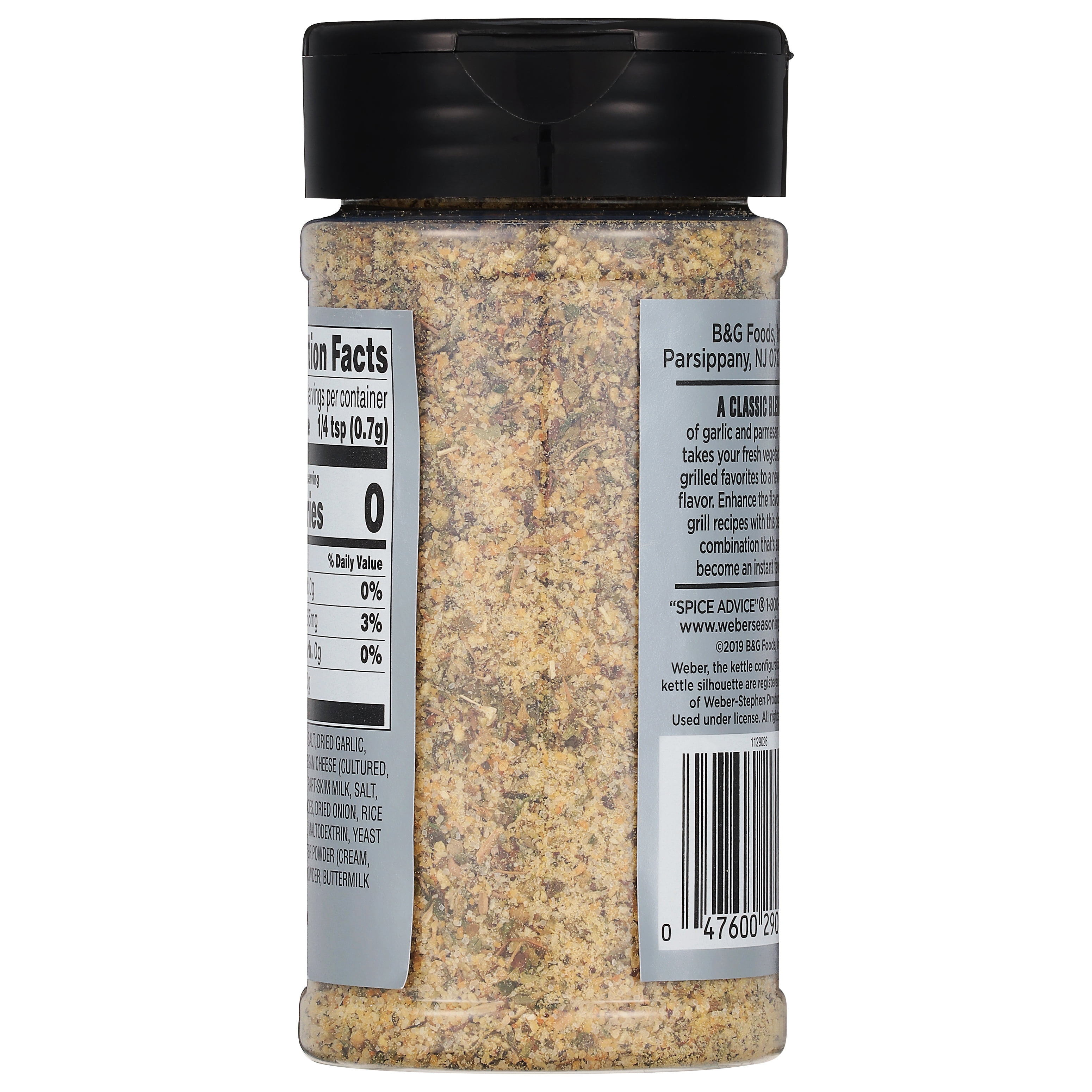 Weber Garlic Parmesan Seasoning 4.3 oz bottle takes your fresh vegetables and grilled favorites to a new level of flavor. This delicious grill seasoning enhances the taste of your grilled recipes by adding a savory touch that is sure to become an instant favorite. This seasoning combines garlic and parmesan cheese with salt, spice, sugar, dried onion, and butter to make your meals taste even better. Weber Garlic Parmesan seasoning blend is gluten-free and kosher. Add this seasoning to vegetables, pork, or poultry before grilling. You can even try this on your favorite pasta dish. This product contains milk.